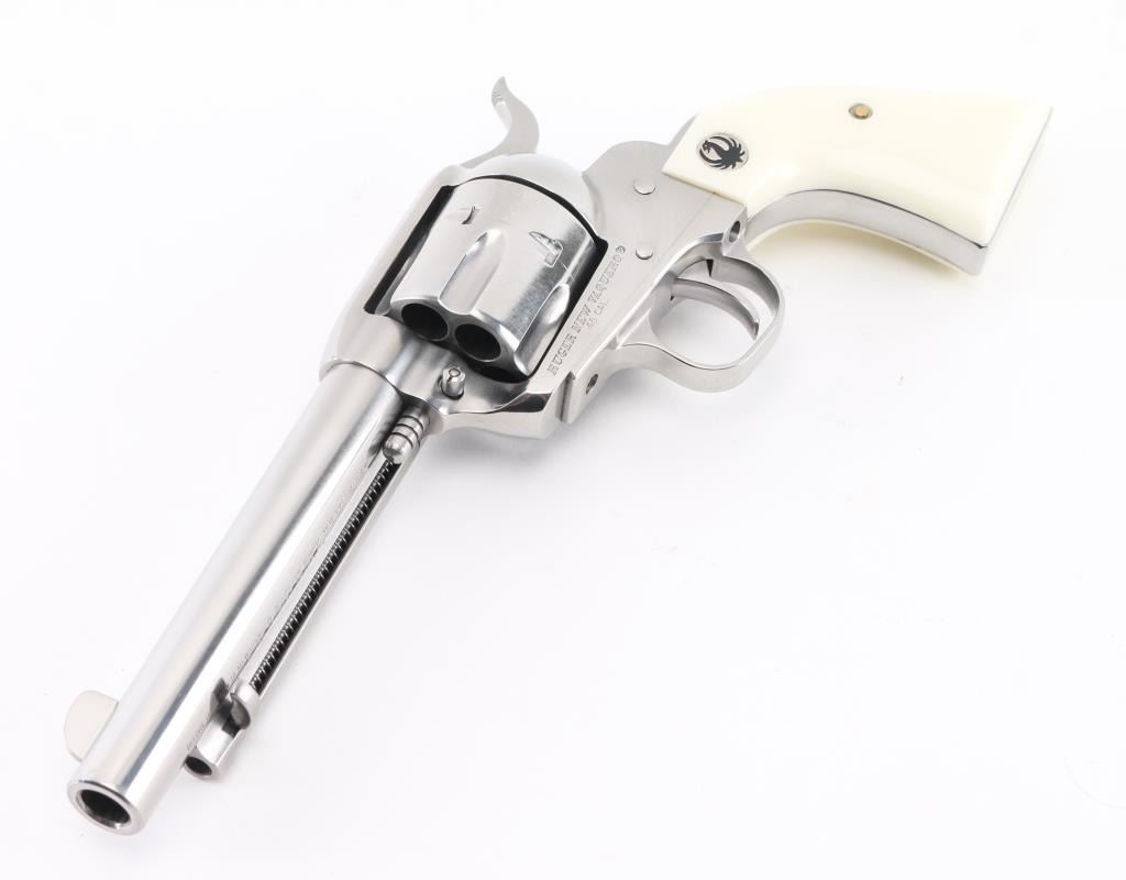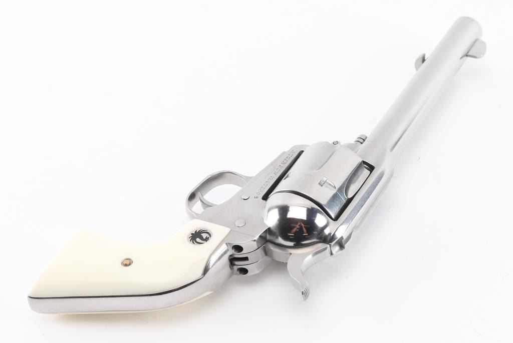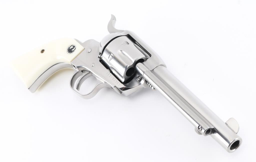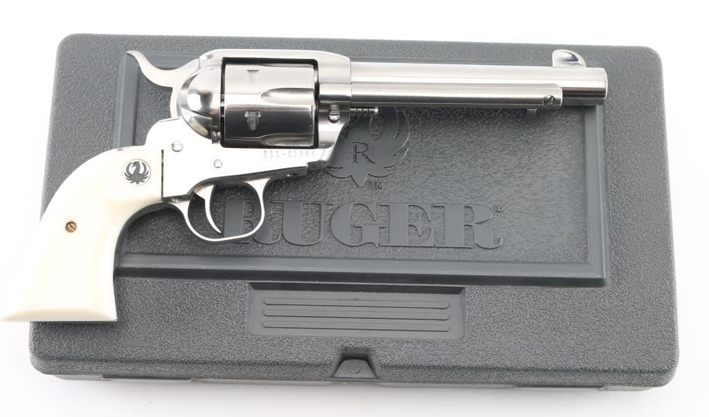 American made six shot revolver chambered for .45 Colt ammunition. It has a gloss stainless finish, blade front sight, notch rear, smooth trigger, serrated hammer spur, white grips with Ruger medallions, fluted cylinder, and 5.5" barrel. Comes with original factory hard case. Revolver exhibits some superficial scratches with no major wear observed. Excellent bore and grip. Condition is NRA Good *Modern Firearm*