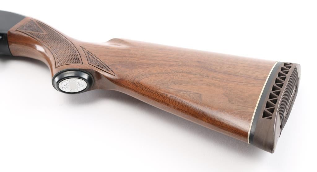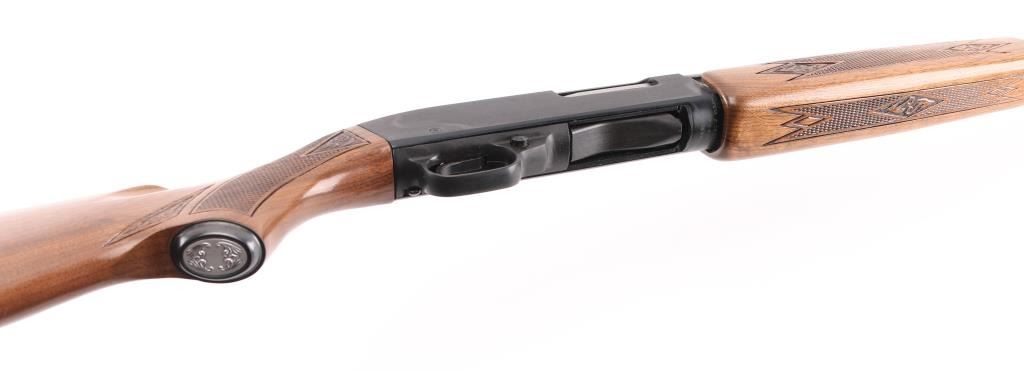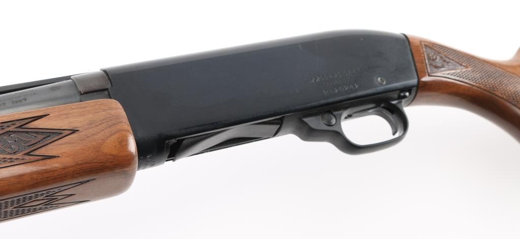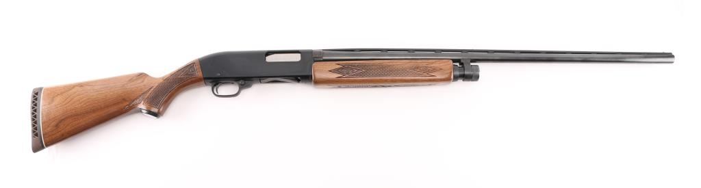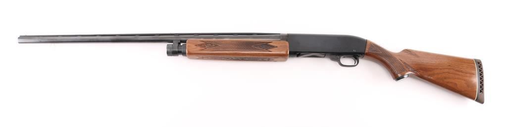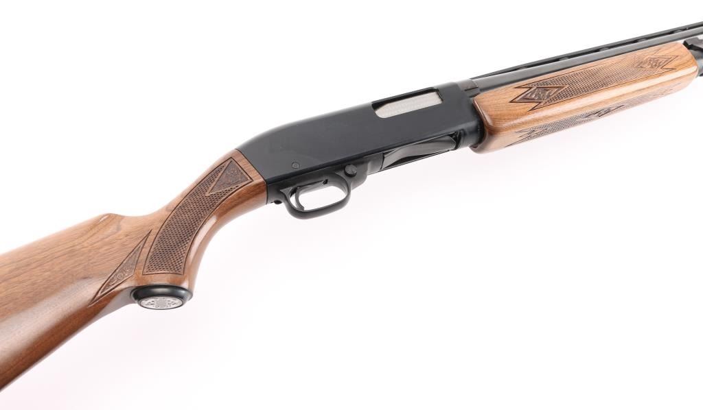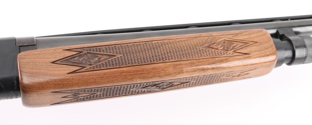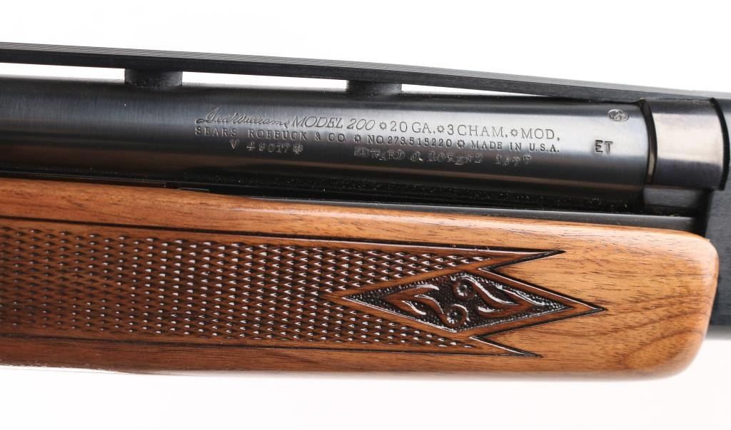 Made for Sears by Winchester this is a 20 gauge slide action shotgun in Sears Ted Williams line. It features a nicely blued 28" barrel with fixed Mod choke, vent rib with brass bead front and mid rib, blued receiver, jeweled bolt, and silver and black grip cap. Wood stocks have nice pressed checkering at the wrist and forearm with a Ted Williams white line recoil pad. On the left side of the barrel under the Ted Williams and Sears info, someone stamped V49017 a mark of some kind then Edward J. Lorenz 1977. Metal finish looks very good but it does have a couple of minor surface scratches in the finish but not the metal. Bore looks great. Wood stocks look great. Condition is NRA Very Good+ *Modern Firearm*