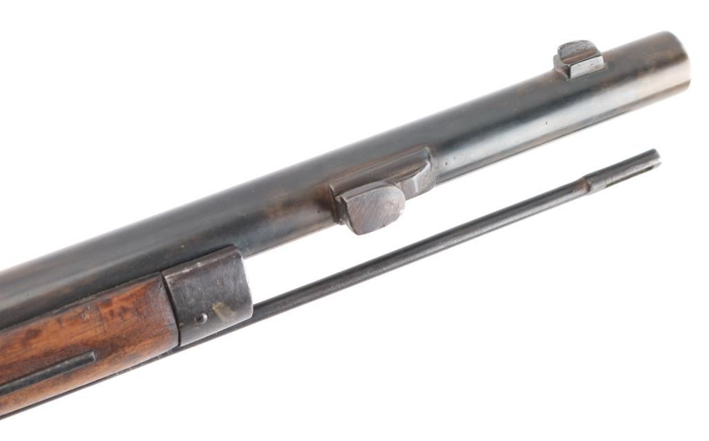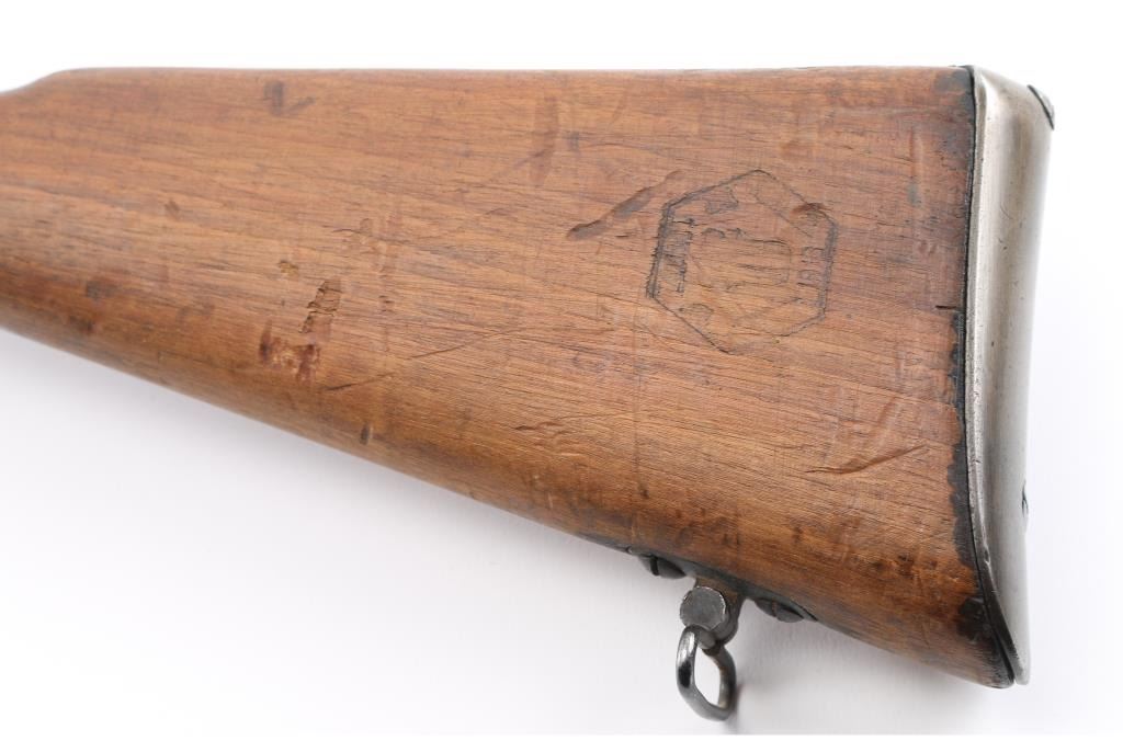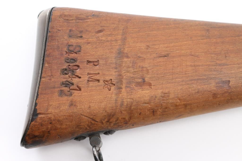 Bolt action rifle. It has a 34" blued barrel with bayonet lug and cleaning rod under barrel, blade front sight, ladder rear sight, two barrel bands, sling swivels, and fixed magazine. Wood stock is smooth with metal butt plate. Metal finish is worn in areas and patina on most. Stock is double stamped with PM4941 and something over that. The cartouche on the left of the stock is hard to make out but looks like 1916. Someone scratched V47901 into the left side of the stock above the magazine. Stock has many dings and dents. Safety does not work. Condition is NRA Fair *Antique Firearm*