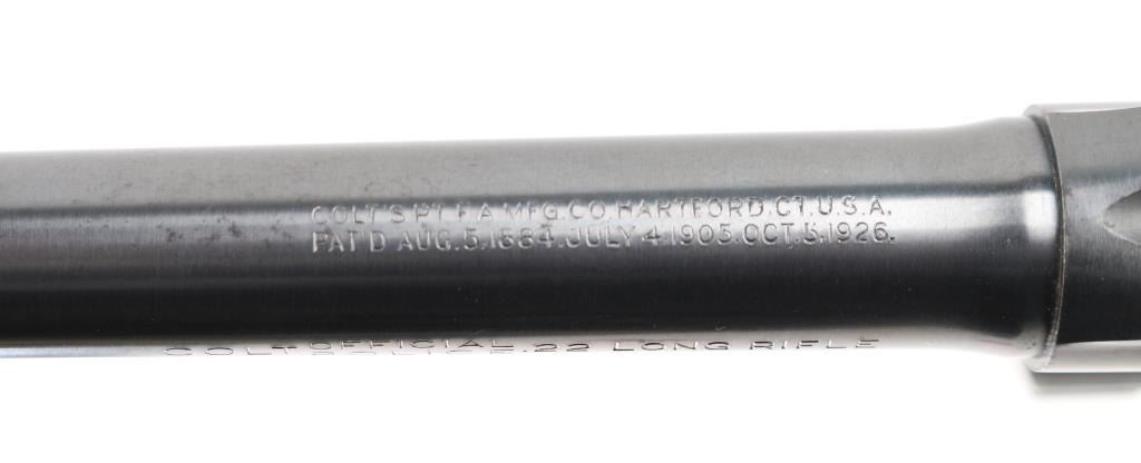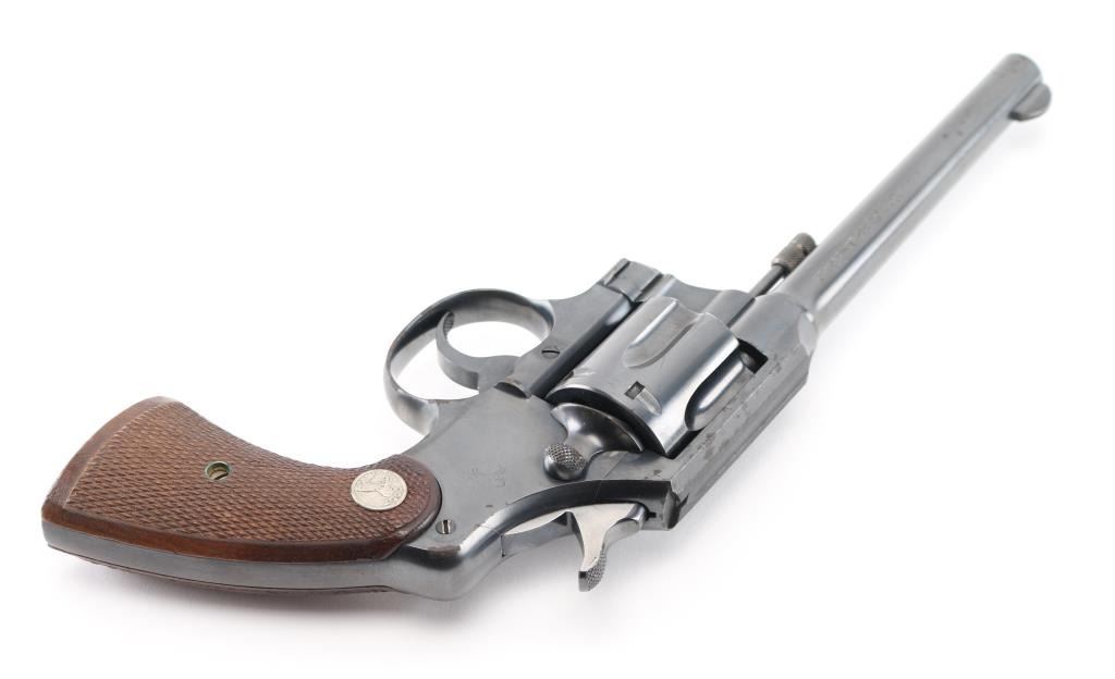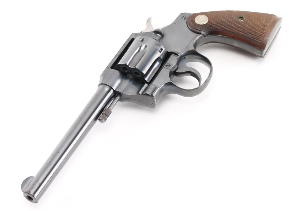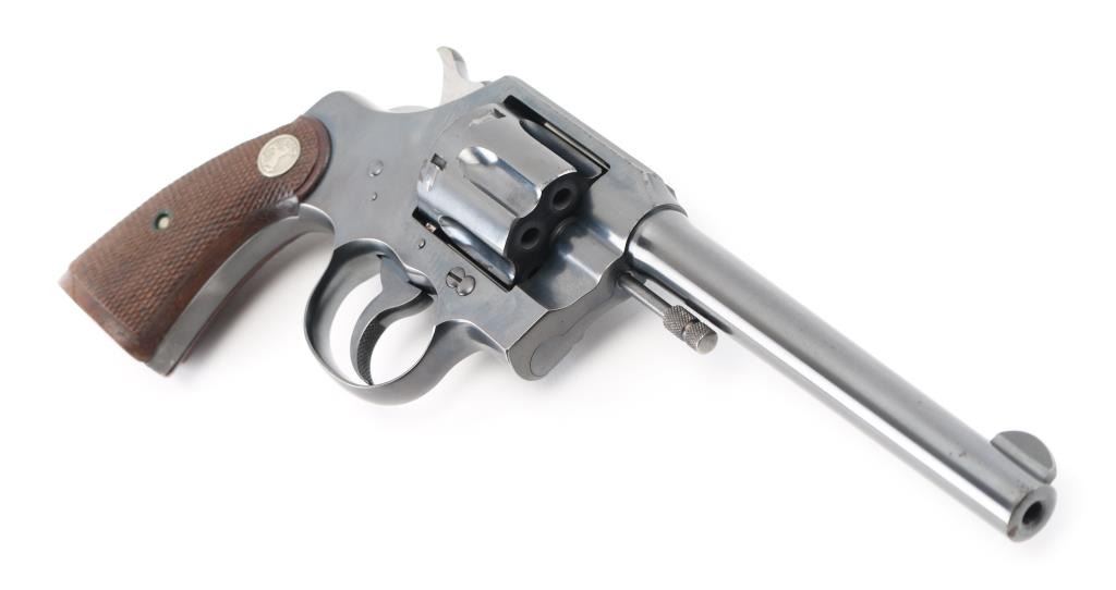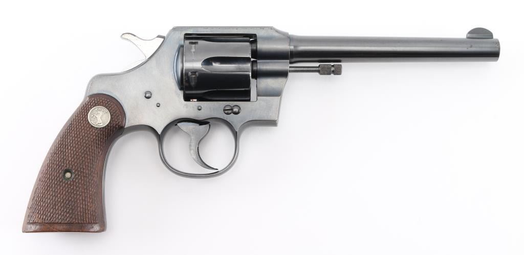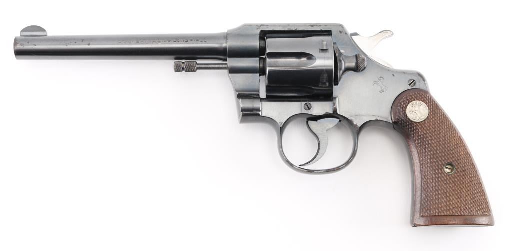 Vintage double action medium frame rimfire revolver chambered in .22 Long Rifle, manufactured in Hartford, CT circa 1937. Features a blued refinish, 6" barrel, round blade front sight, square notched rear sight, fluted six-shot swing-out cylinder, non-shrouded ejector rod, knurled trigger, knurled hammer spur, square butt frame and two-piece checkered walnut grips with Colt medallions. Matching serial numbers are found on the frame and crane. Metal finish looks good but there is some rust on the left of the frame at the trigger guard, a couple of spots on the cylinder, on the top of the frame, a few tiny spots on the barrel and one at the muzzle. Bore looks great, bright. Grips are fine, no chips or cracks but there is a scratch on the right at the heel. Condition is NRA Good *C&R Firearm*