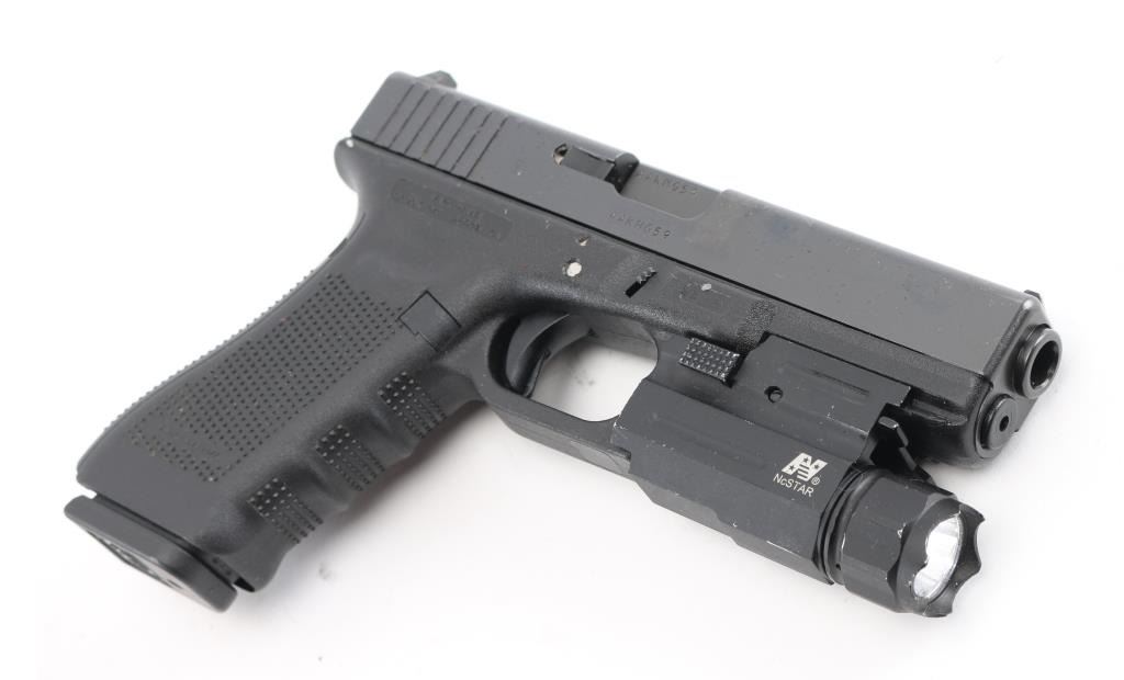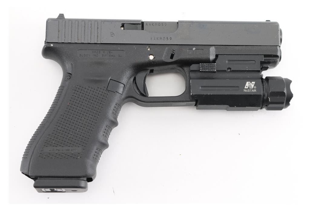American made, semi-automatic pistol, approximately 4 1/4" barrel, bore is bright, steel slide with rear serrations, three dot sights, safety is in the trigger, polymer frame, textured grip, modular back strap system, reversible magazine release, 10-round magazine, NcStar flashlight mounted to integral accessory rail, light works, one front prong is bent in, scratches to bare metal on the light. Pistol exhibits nearly all of its original finish showing very little wear. Includes original plastic box, two extra 10-round magazines, two 22-round magazines, instruction manual and cleaning rod. Condition is near NRA Perfect Modern Firearm