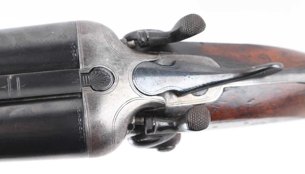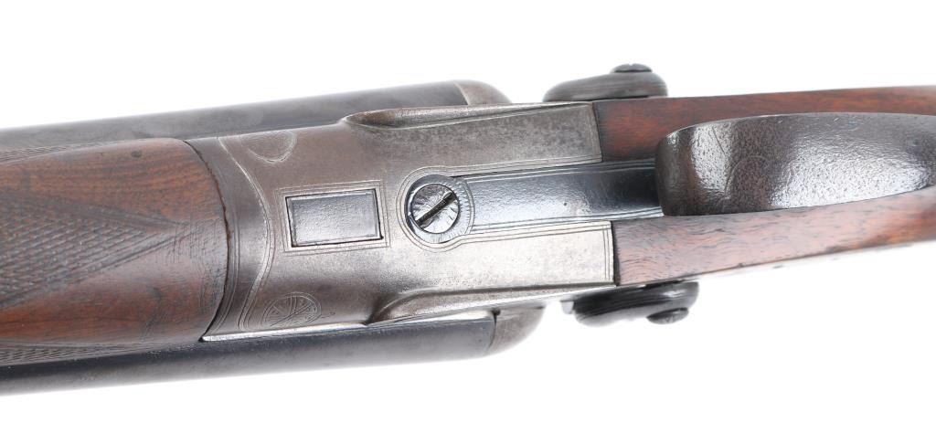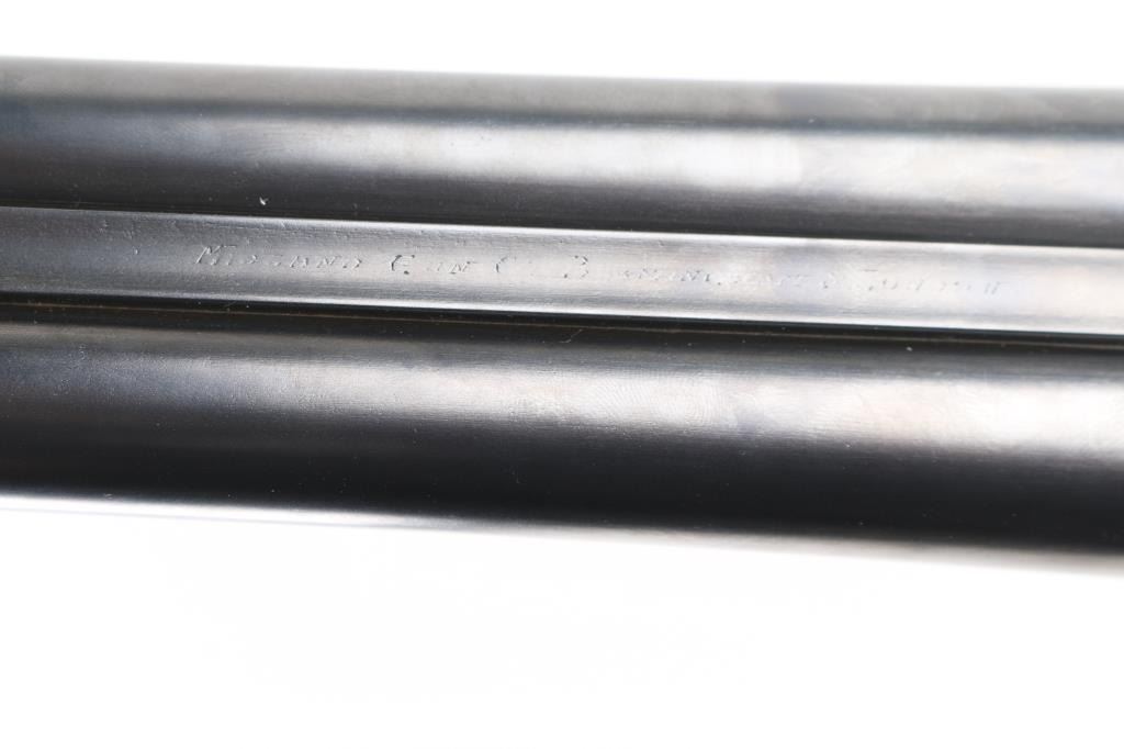 Quality vintage English top lever shotgun with 30" barrels with smooth rib, brass sight bead, exposed hammers, double triggers, checkered "Prince of Wales" butt stock with integral serrated wood butt plate. Hammers, triggerguard, and hammers have been re-blued, Feint "Midland Gun Co. Birmingham & London" marked on rib, Birmingham black powder proofs, and re-proofs on underside of the barrel, along with "Nitro Proof": I believe circa 1896-1904. Bores are overall very good/bright, there is a small area of pits in the left barrel above the chamber, wood is very good/sound, action is crisp/tight, barrels lock up tight. Moderate engraving. LOP is 14" Chokes measure right barrel IC, and left CYL. NRA Condition-Good-Re-Blued. C&R Firearm.