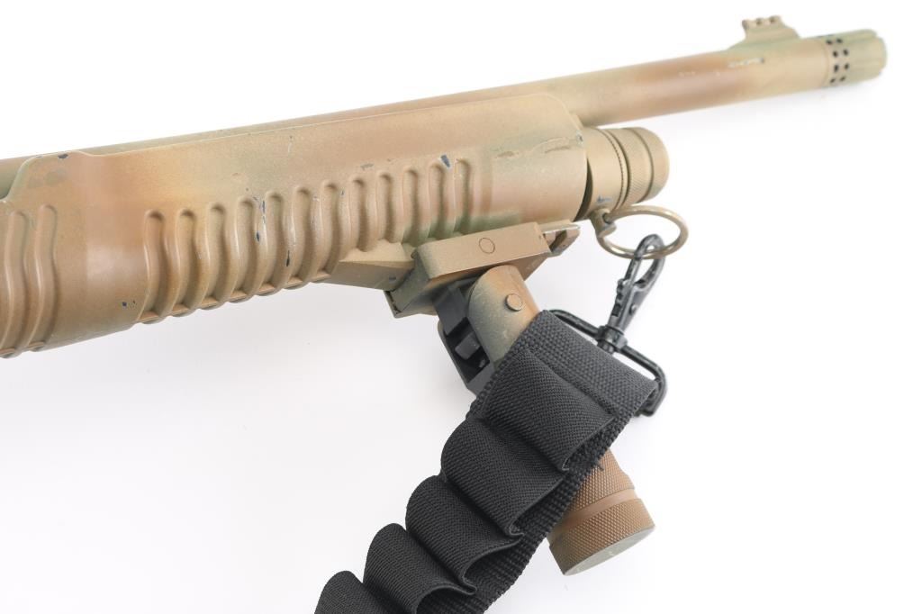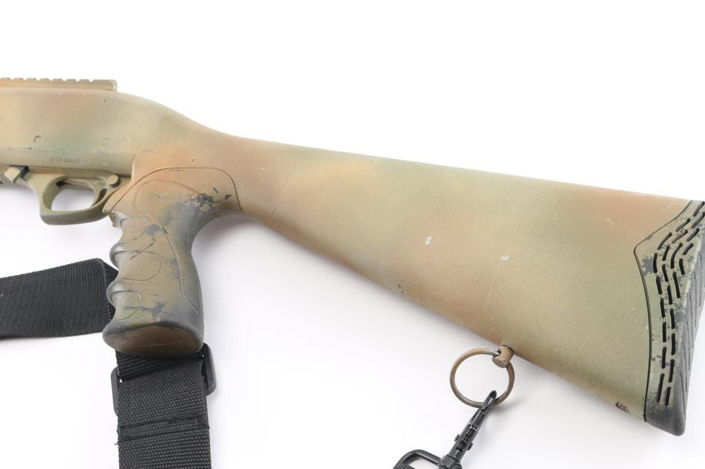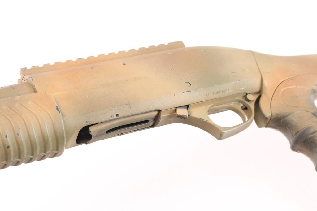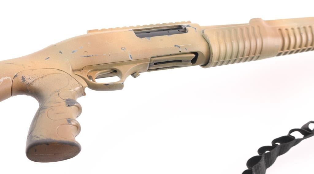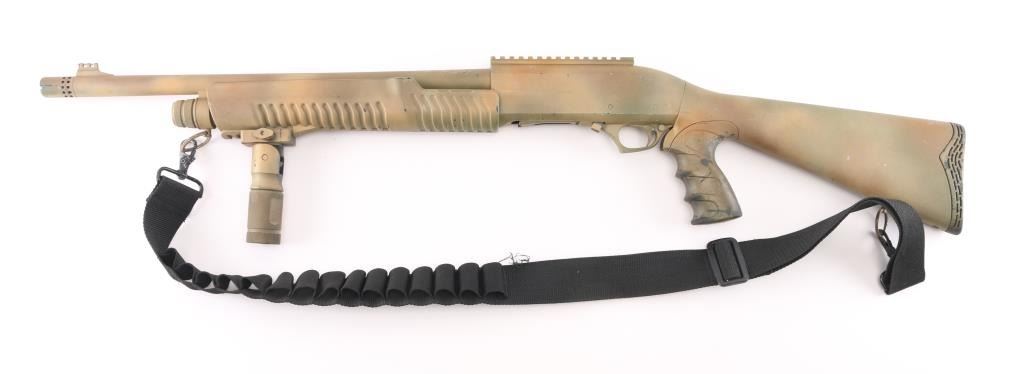 SN: LY12-000421 Made in Turkey, it features an 18.5" barrel, chrome lined, with cylinder bore and 3" chamber and threaded ported muzzle device that takes choke tubes, Cylinder bore. Also has fiber optic front sight, Picatinny rail on the receiver and spring loaded forward assist forearm with folding vertical grip, push button safety. 5+1 2.75 inch shell capacity and synthetic tactical pistol grip stock with pad and black nylon sling that holds 15 shells. Gun has a Duracote tan/brown camo finish, Bore is excellent/bright, action is crisp/tight, camo finish has chips/handling wear. NRA Condition-Near Very Good. Modern Firearm.