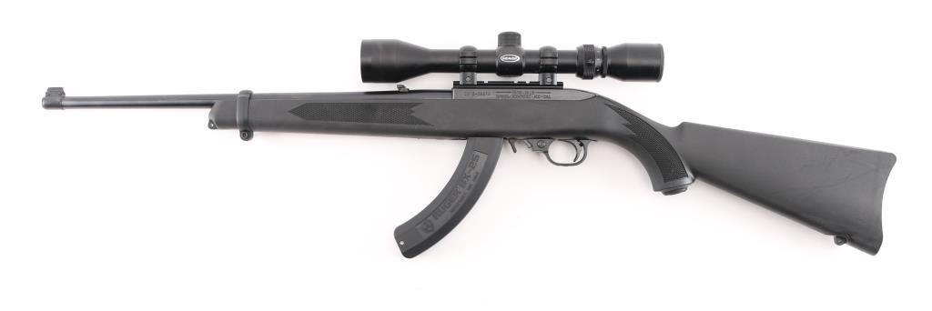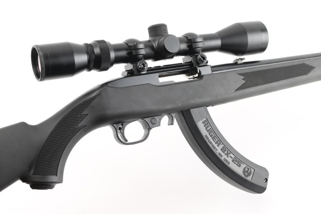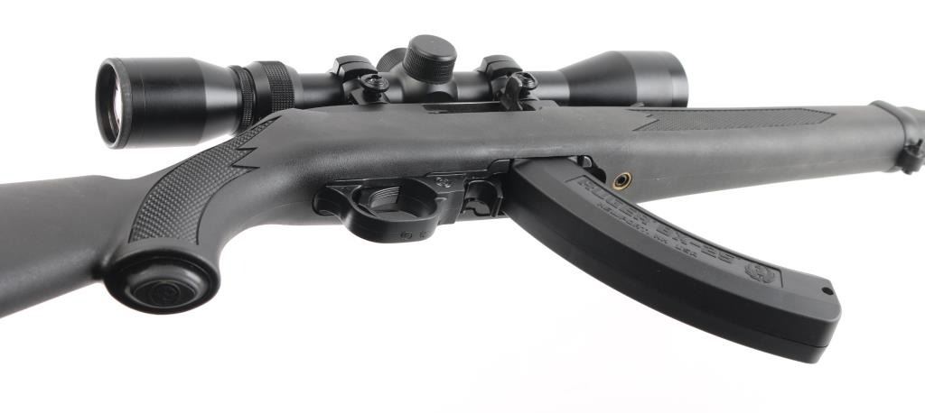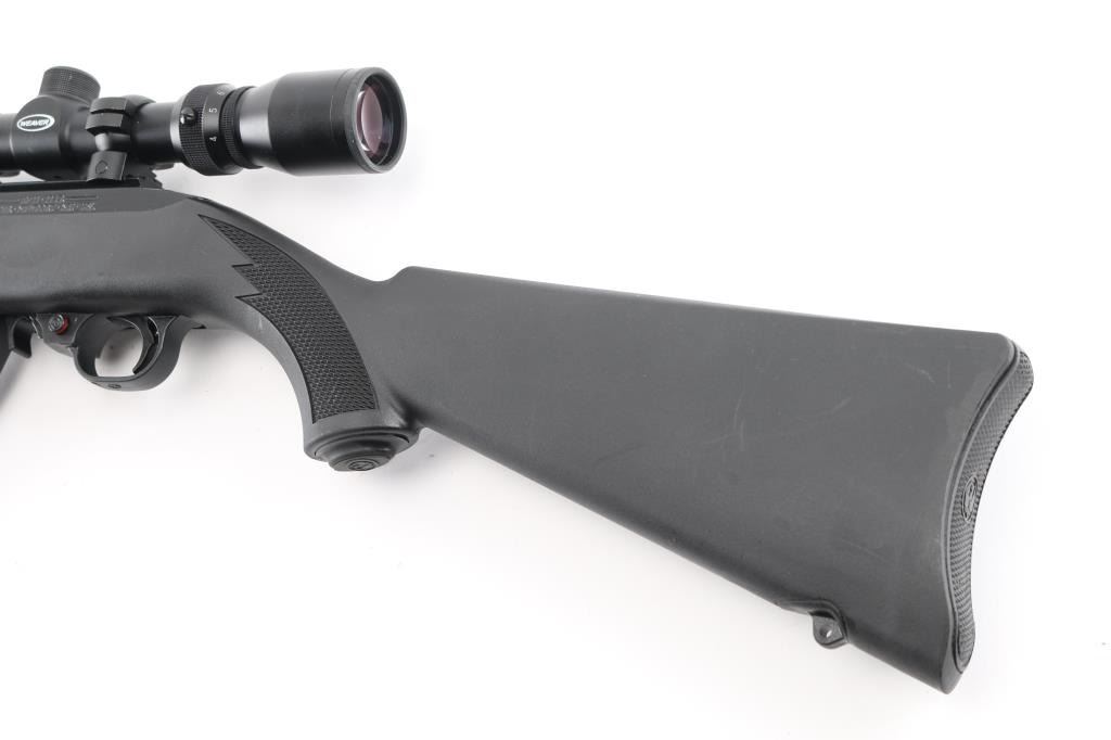 American made rifle, semi-automatic, approximately 18 1/2" barrel, bore is bright, integral combination scope base adapter for both Weaver-style and .22 tip-off scope mounts, black synthetic stock, polymer trigger housing assembly, serrated trigger, checkered forend and grip, Ruger BX-25 magazine, Weaver 3-9X scope. Rifle exhibits minor edge wear. Includes original case. Condition is NRA Excellent. Modern Firearm