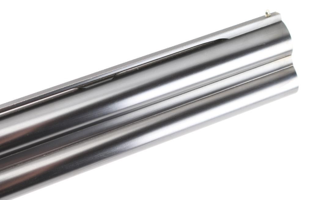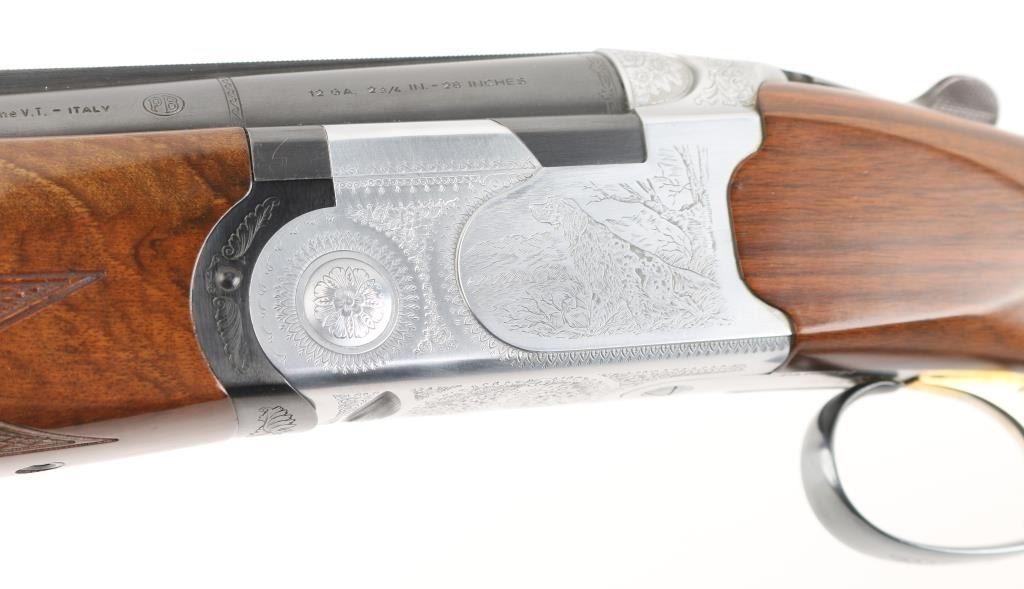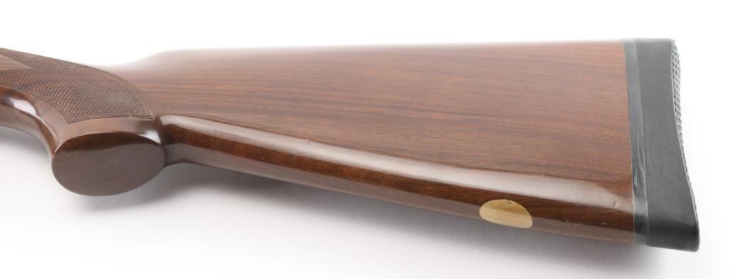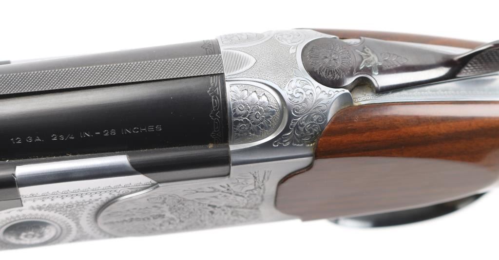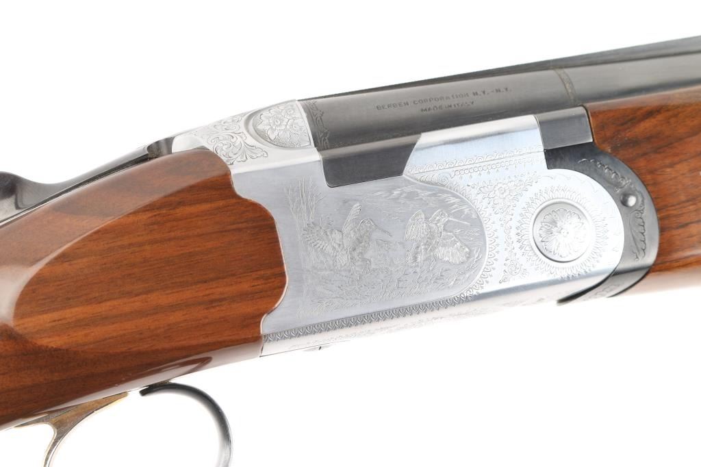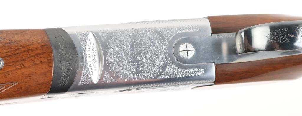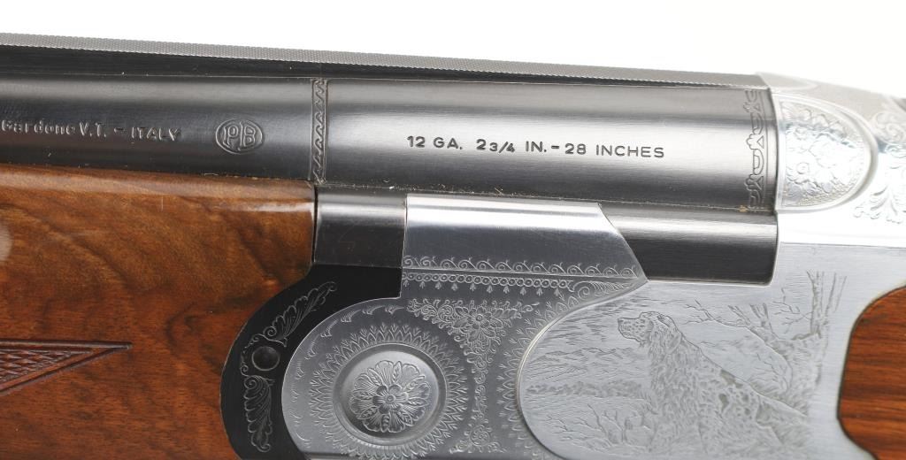 Italian field grade Over/Under shotgun imported by Berben Corp, NY, NY. The low profile receiver is coin finished, engraved with floral scroll patterns all around, and game scene and Pointer on both sides. Single trigger is gold accented, barrel selectable at tang safety. Butt stock is nicely figured walnut with checkered panels at wrist, Pachmayr solid recoil pad. Approximate stock measurements as adjustments currently set: Length of pull 14,5". Forend matches butt, with large checkered panels on each side. Multi-choke barrels are 28" long, with ventilated rib, steel bead, installed tubes are Modified Bores are excellent. Bluing is consistently dark full 98% coverage across the barrels with a few scratches. Wood furniture is in excellent condition with a few rub marks near butt. Comes with matching factory box with manual. Condition is NRA Excellent. Modern Firearm.