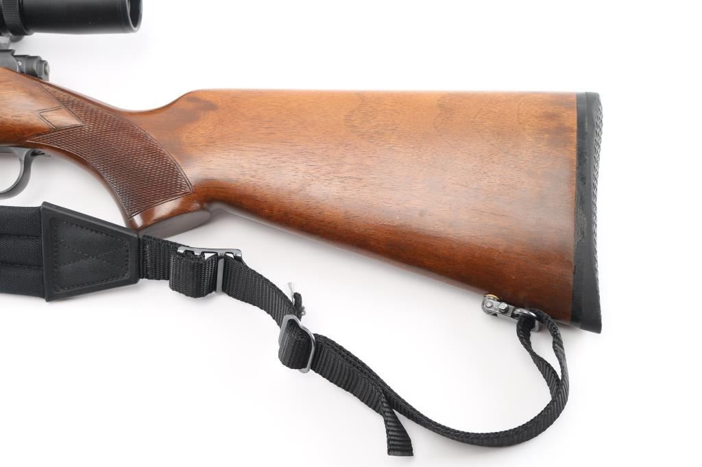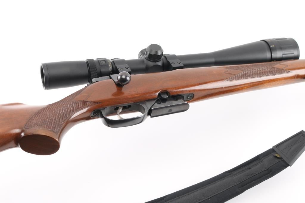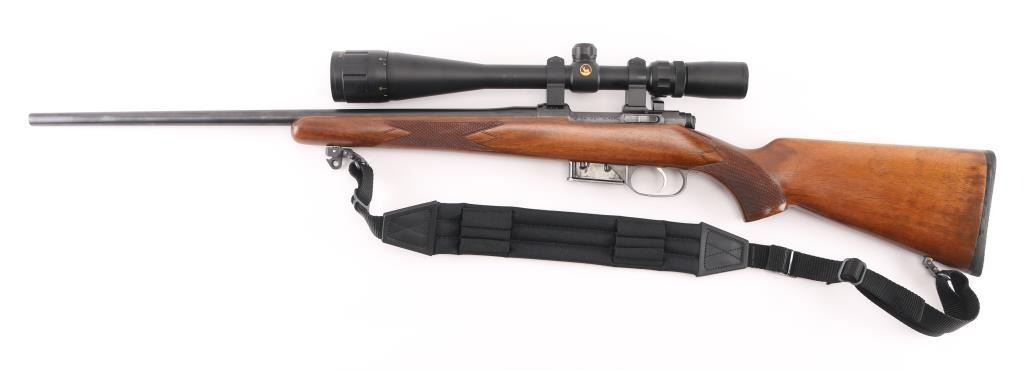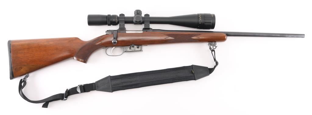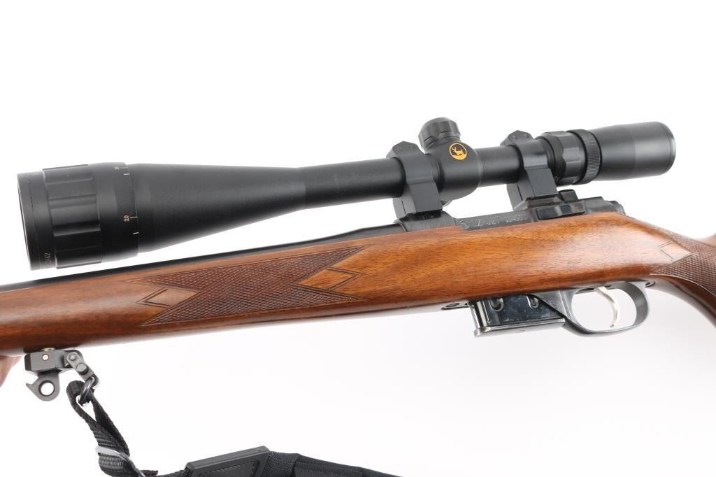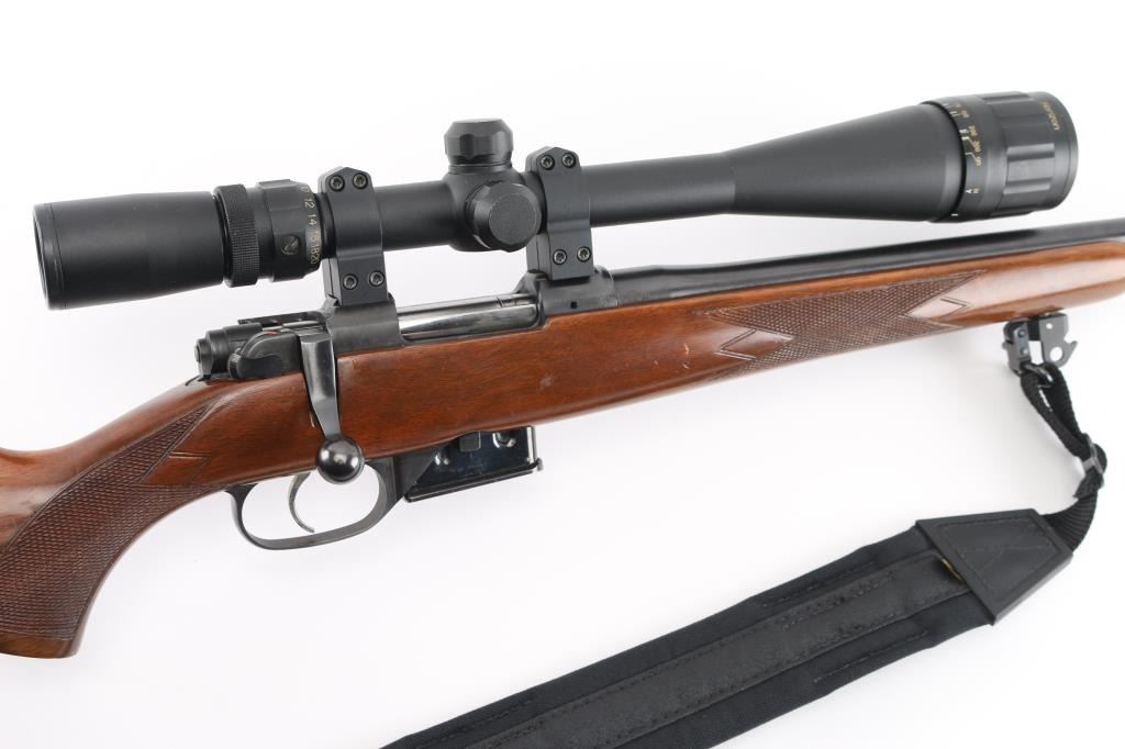 High quality Czech made bolt action sporting rifle chambered in .22 Hornet. Features a blued finish, 22" tapered barrel with no provisions for sights, BuckRidge Horizon 8-32X42 scope,detachable magazine, smooth single set trigger, manual safety, black nylon sling, and checkered Turkish walnut pistol grip shoulder stock with Pachmayr recoil pad. Rifle exhibits approximately 98% of it's original finish. Action is smooth, bore is pristine, optics are sharp and wood stock is very good. NRA Condition is Near Excellent. Modern firearm.