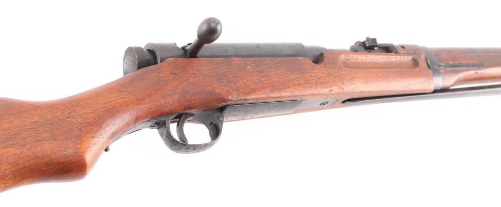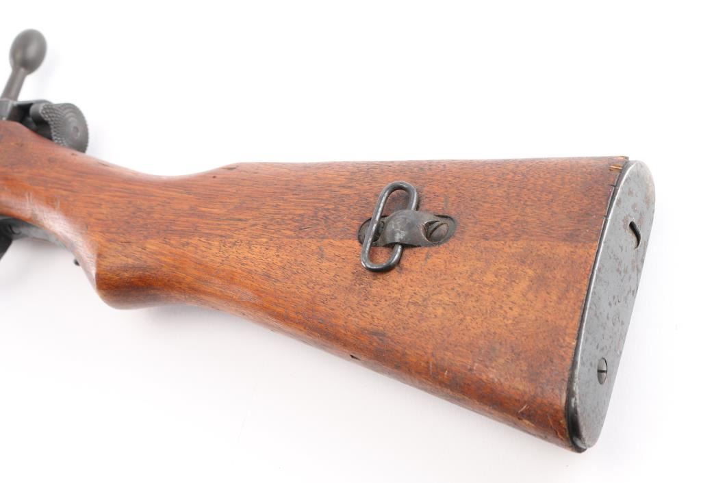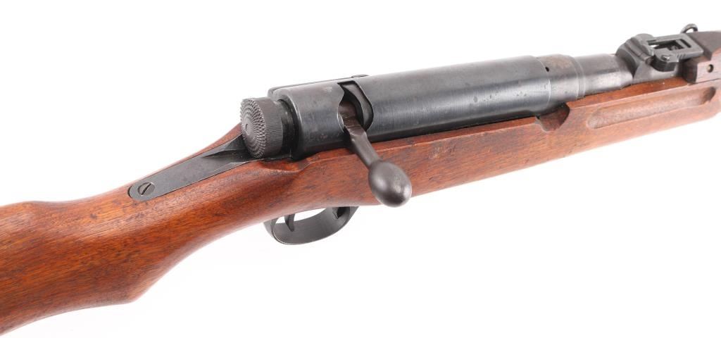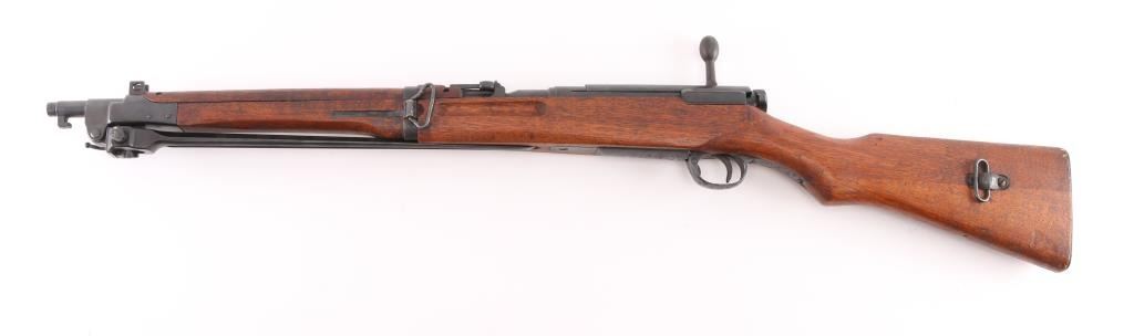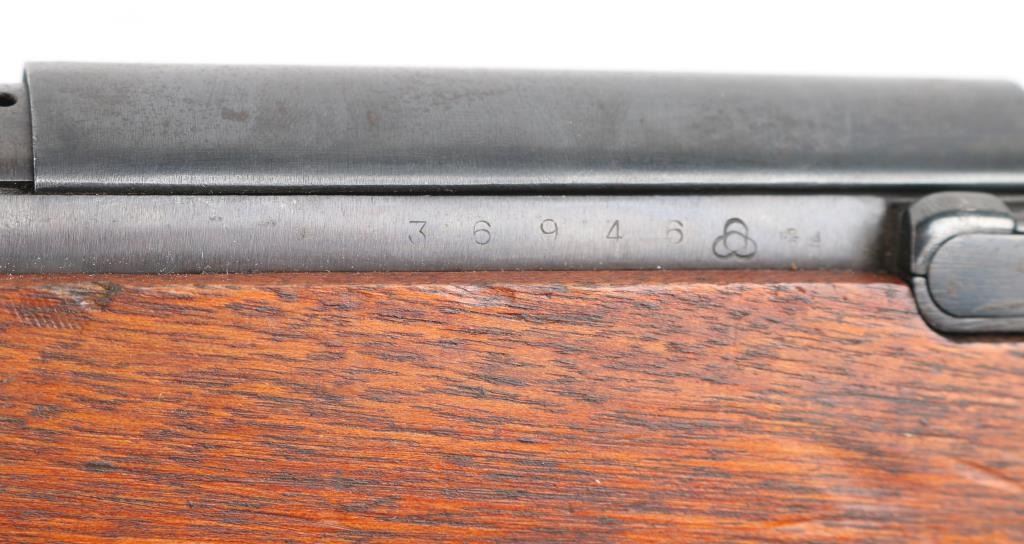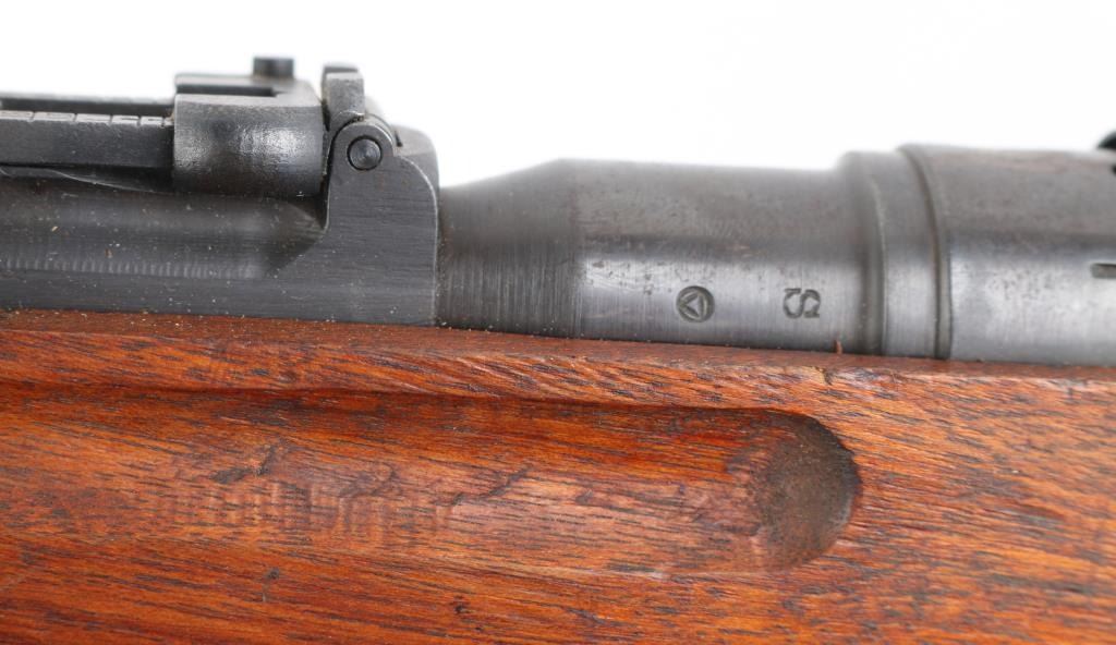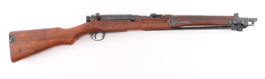"Cavalry Carbine". second variation, with one hole for cleaning rod. Produced 1911-1942. Entered service in 1912, the 44th year of the Meiji reign, Type 44. ground Chrysanthemum. Three Japanese characters on the chamber translate to "Type 44", Japanese military bolt action rifle features 19" barrel, protected blade front sight, V notch rear sight with flip-up elevator ladder, straight bolt handle, folding spike bayonet, butt compartment, side mounted sling swivels, manual safety, hinged floorplate. Hook located below the front sight on the right side, replicating the quillon of the type 30 bayonet for bayonet fencing techniques of the period, and for stacking. Serial numbers match on Receiver, bolt, bayonet housing, and dust cover.(Very Rare) Bore is very good with strong rifling. Retains 85% blued finish, with edge wear, and scattered pin-prick pitting on the buttplate & triggerguard/floorplate. Wood is very good condition with some small scrapes, scratches & dents, Observed markings are crisp. No importer marks observed.. A matching, nice conditioned Type 44. NRA Condition-GOOD. C&R Firearm.
