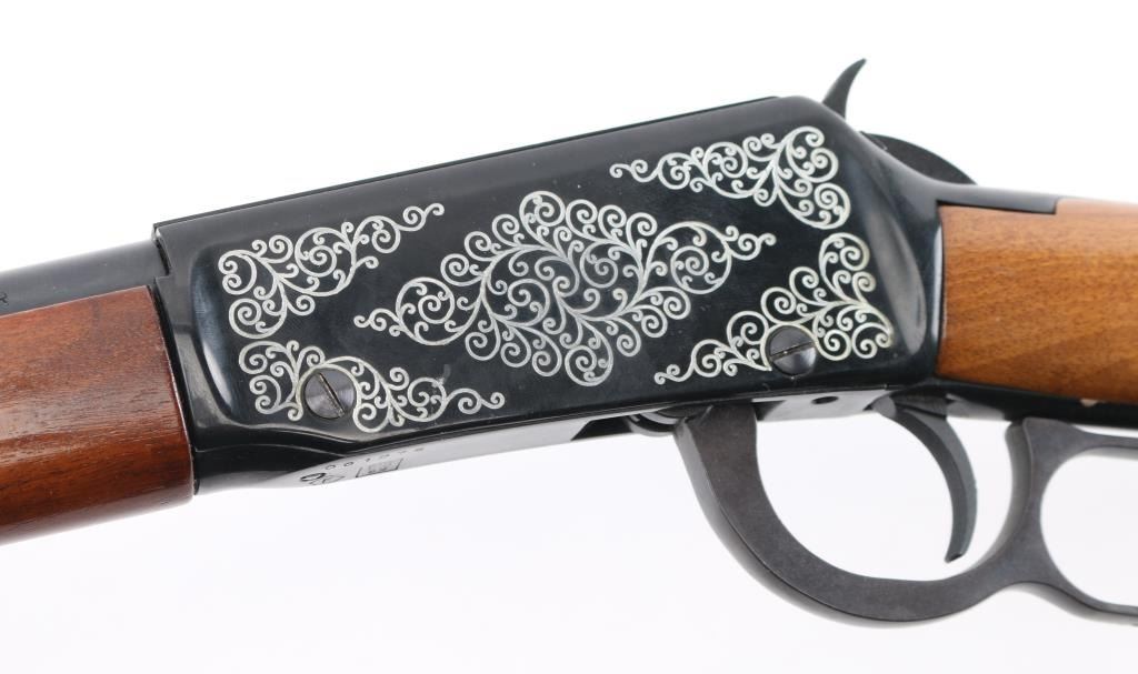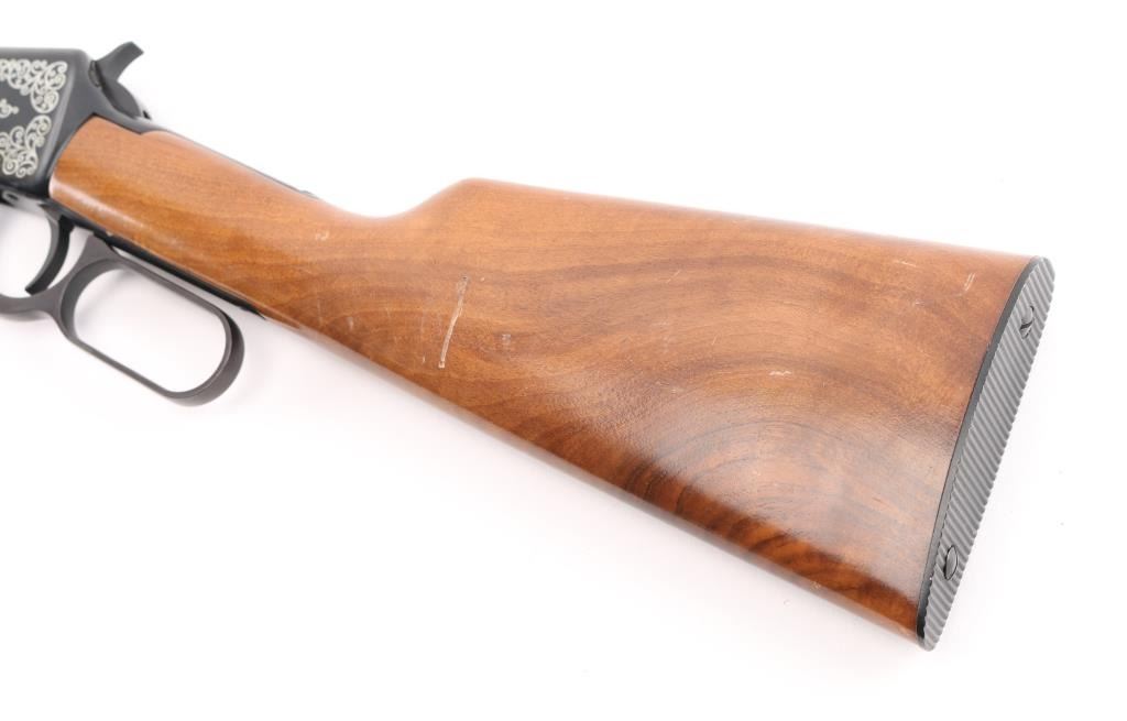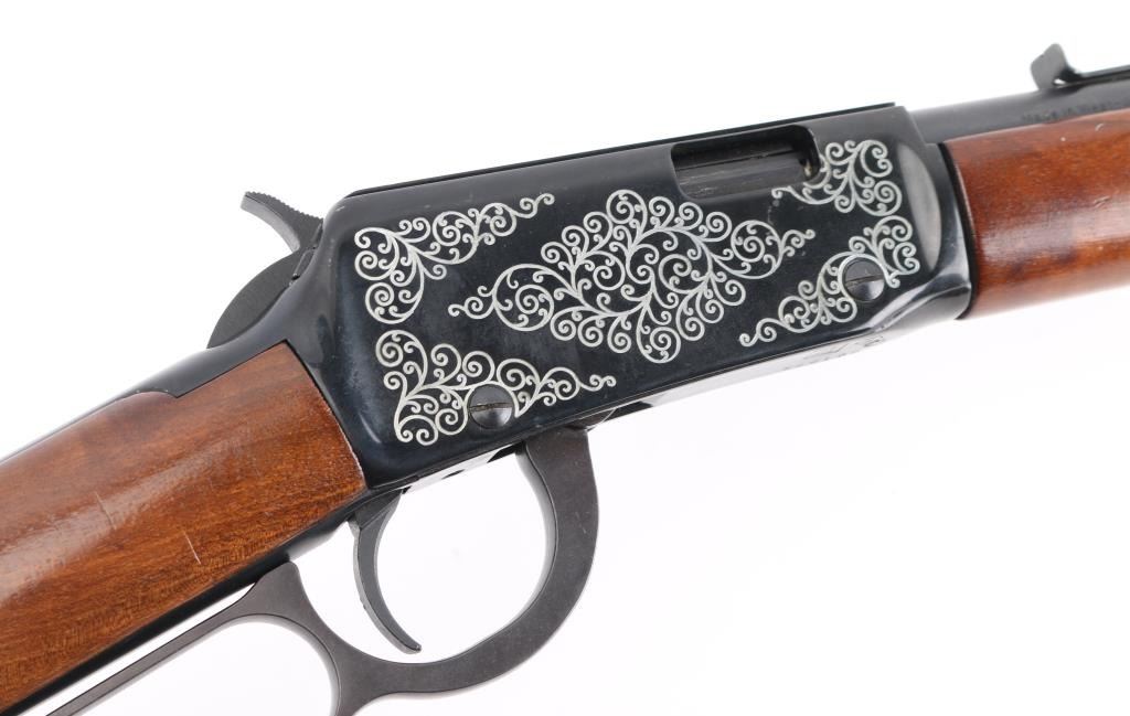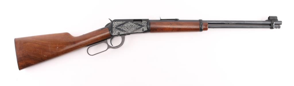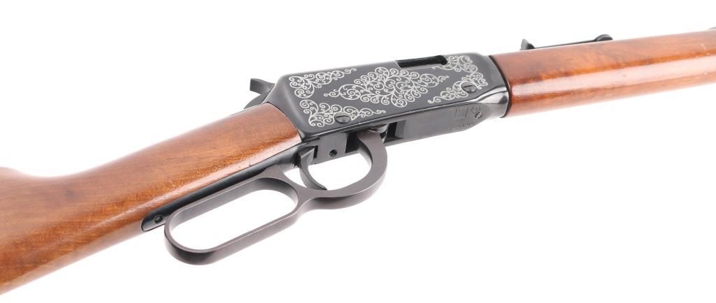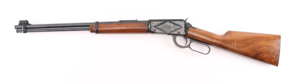 SN: 0091275. Made in West Germany, imported by CAI, Lever-action repeating carbine, 18.5" barrel with hooded front blade u-notch rear sporting, missing lifter, full length tube magazine. Blue finish with full scroll factory engraving on both sides of the receiver. Bore appears good buy very dirty, action is crisp, blue is about 97% with some minor scratches, wood is good/sound with minor scratches/dings, there is a 1" scratch in the left buttstock. Rare rifle. NRA Condition-Very Good. Modern Firearm.