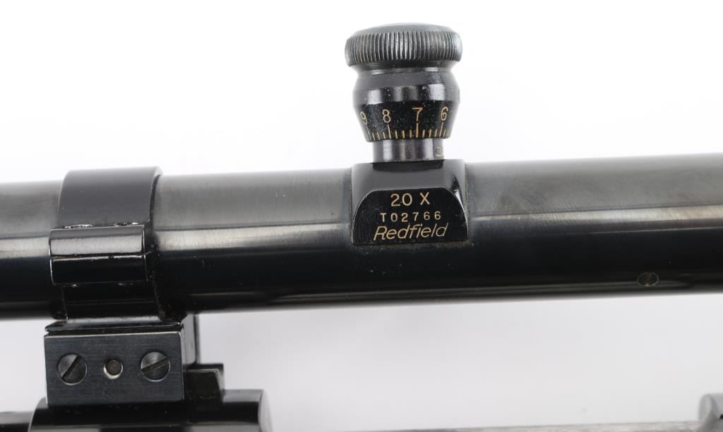 Manufactured 1971.Heavy Barrel, Custom Ordered.(Best drop in barrel of all the Model 70's) 24" sightless heavy barrel, manual safety on bolt sleeve, machine turned 'jeweled' bolt, swept bolt handle with knurled knob. hinged floorplate, wide serrated trigger. Super Grade stock with impressed checkered panels on forearm and wrist, contrasting black grip cap and forearm tip with white spacers, sling studs. Mounted with a Redfield 20X varmint scope, screw-on caps, fine crosshair reticle, clear optics. Bore appears excellent, a little dirty, action is smooth, Blue is about 98% with minor muzzle wear/scratches. Wood is very good with minor scratches/dings. NRA Condition-Very Good+. C&R Firearm.
