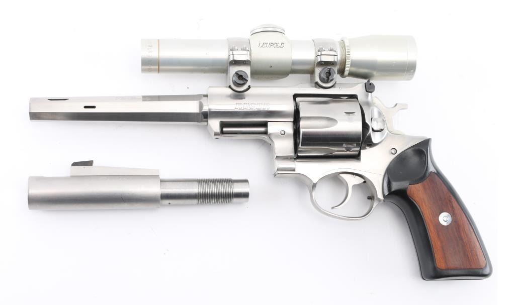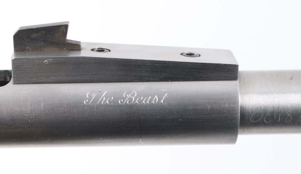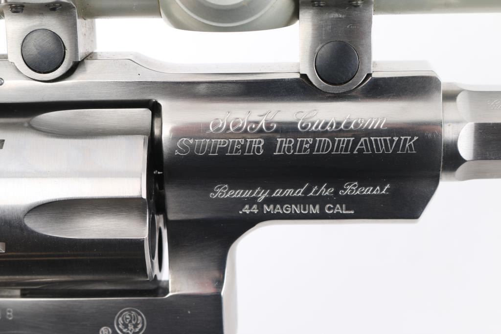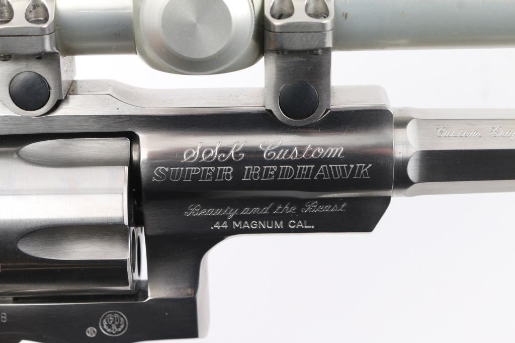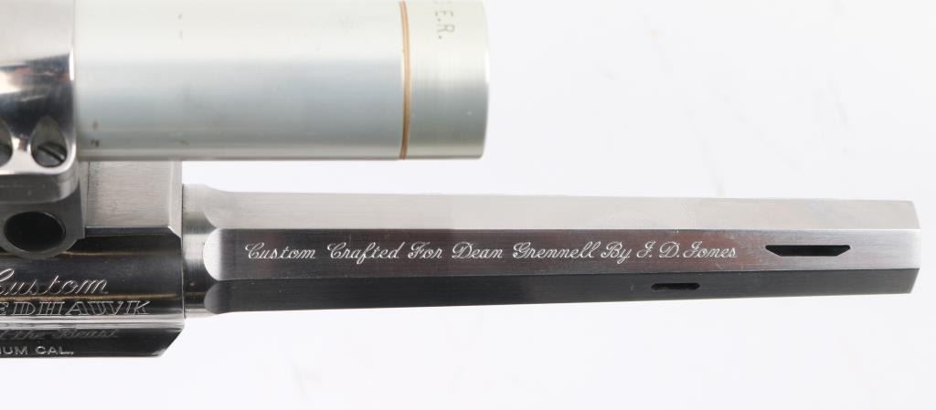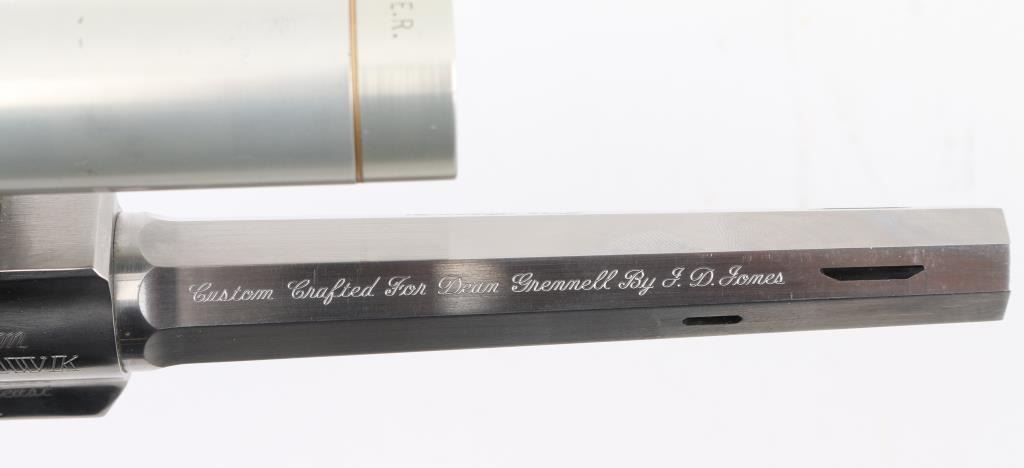 'Beauty and the Beast'. This is a SSK Custom revolver by the well known J.D .Jones. Designed for big game hunting. Stainless steel, 7.5" octagonal vented Mag-Na-Port barrel, Omega outline rear sight. Mounted with a Leupold M8-2X Extended E.R. scope, SSK rings, clear optics, black rubber grips with smooth walnut inserts. Frame is engraved "SSK Custom" & "Beauty and the Beast", barrel "Custom Crafted for Dean Grennell by J.D. Jones" & "The Beauty". Comes with a second 6" single port compensated barrel engraved "The Beast", ramped partridge sight. Both bares are excellent bright, action is crisp, finish has some minor scratches, grips are excellent. NRA Condition-Very Good. Modern firearm.