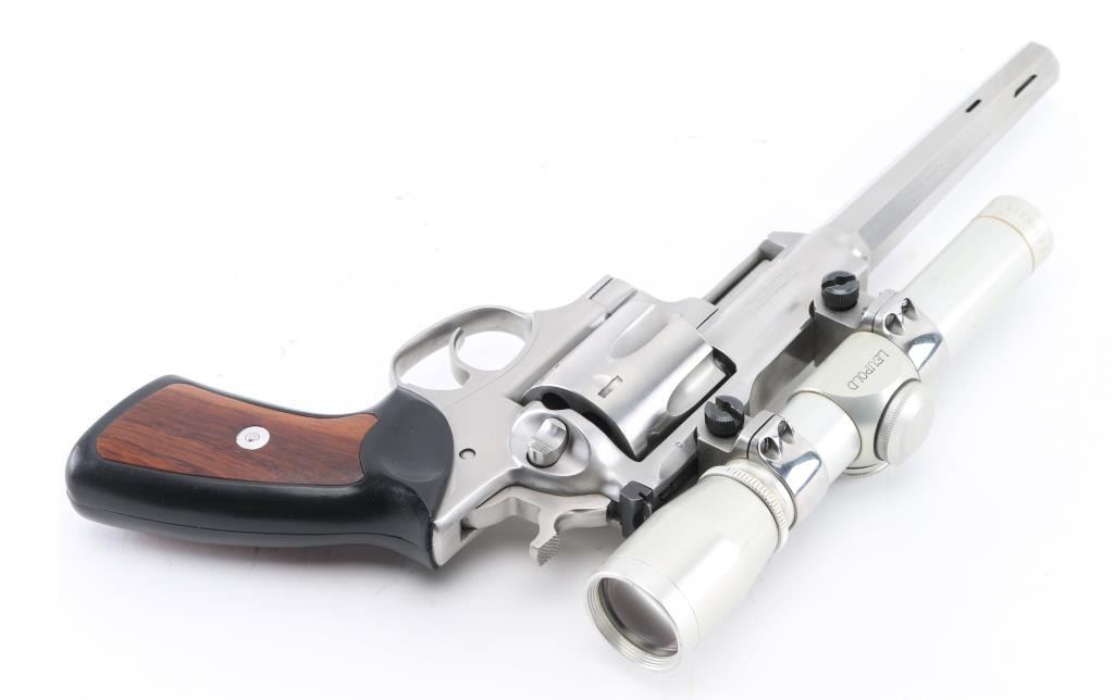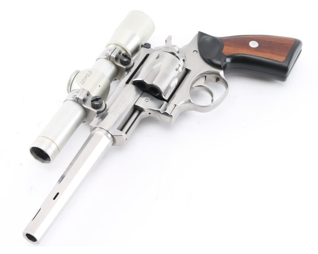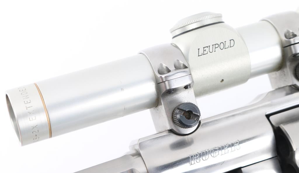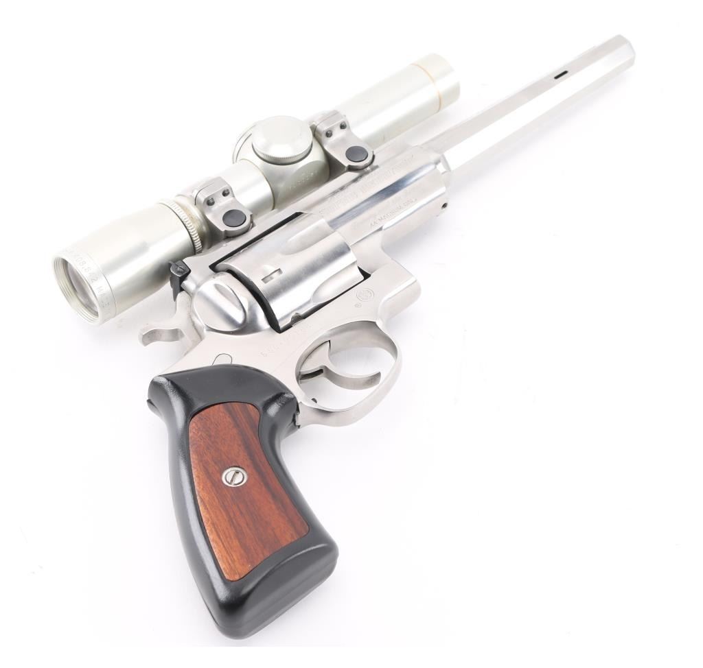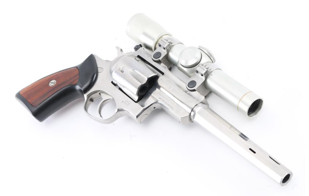 'Beauty and the Beast'. This is a SSK Custom revolver by the well known J.D .Jones. Designed for big game hunting. Stainless steel, 7.5" octagonal vented Mag-Na-Port barrel, Omega outline rear sight. Mounted with a Leupold M8-2X Extended E.R. scope, SSK rings, clear optics, black rubber grips with smooth walnut inserts. Frame is engraved "SSK Custom" & "Beauty and the Beast", barrel "Custom Crafted for Dean Grennell by J.D. Jones" & "The Beauty". Comes with a second 6" single port compensated barrel engraved "The Beast", ramped partridge sight. Both bares are excellent bright, action is crisp, finish has some minor scratches, grips are excellent. NRA Condition-Very Good. Modern firearm.