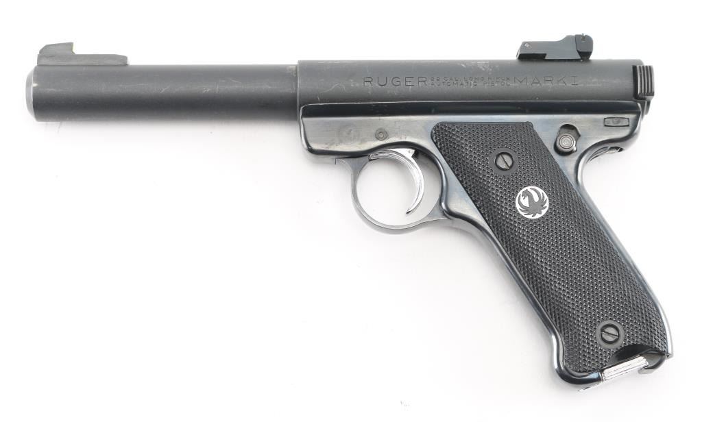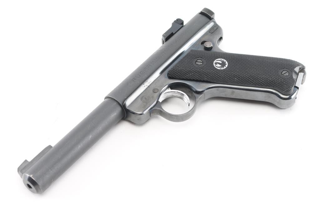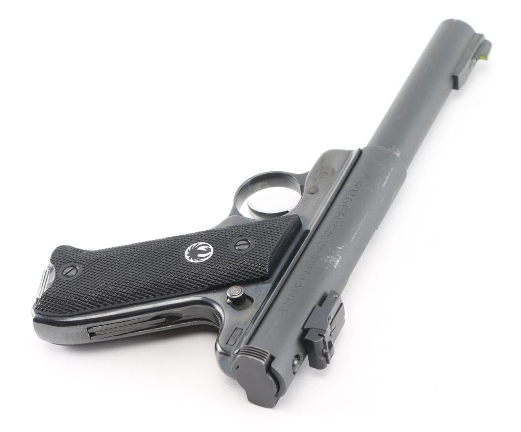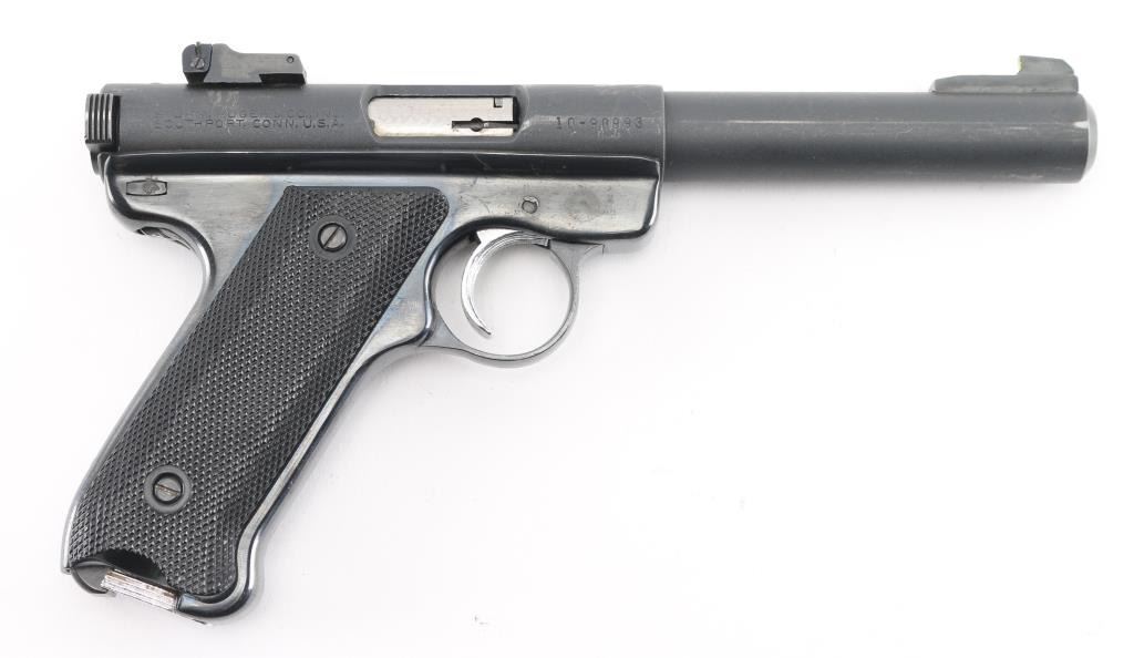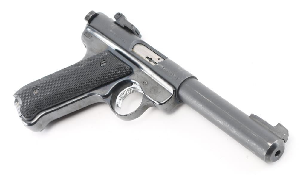 American made semi-auto pistol chambered for .22 long rifle ammunition. It has a 5.5" barrel, a raised blade front sight, a green dot has been painted on, adjustable rear sights, plastic Ruger grip plates with Ruger medallions. The barrel and receiver have a matte finish. Bolt is jeweled. Metal finish has a few scuffs on the barrel. Bore looks great, bright. Grips are fine. Condition is NRA Excellent *Modern Firearm*