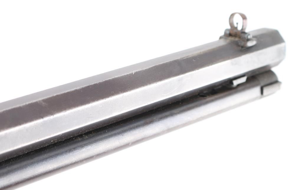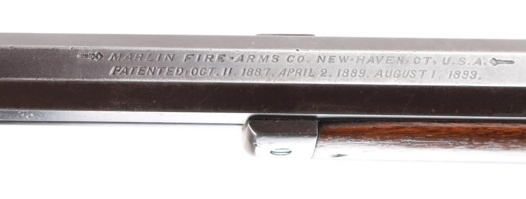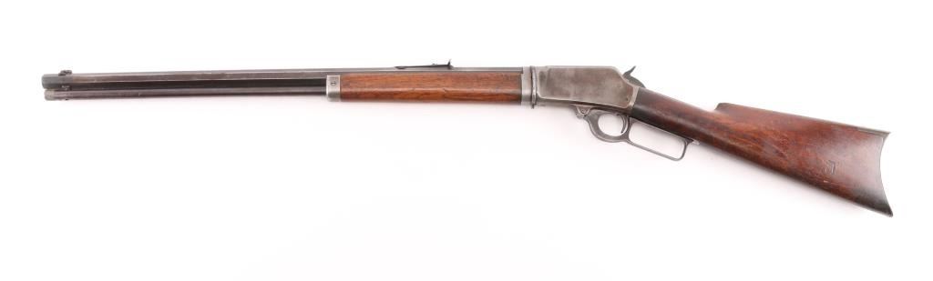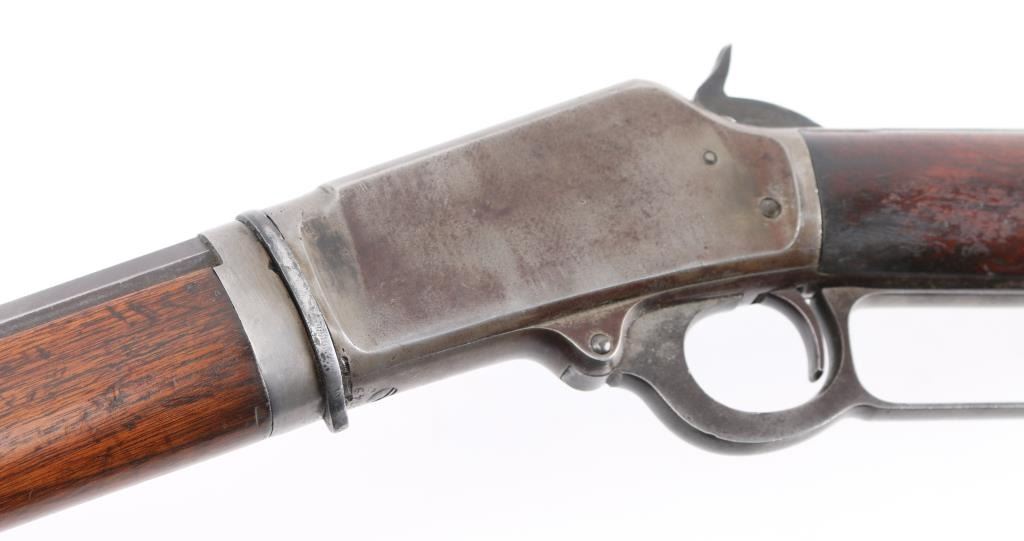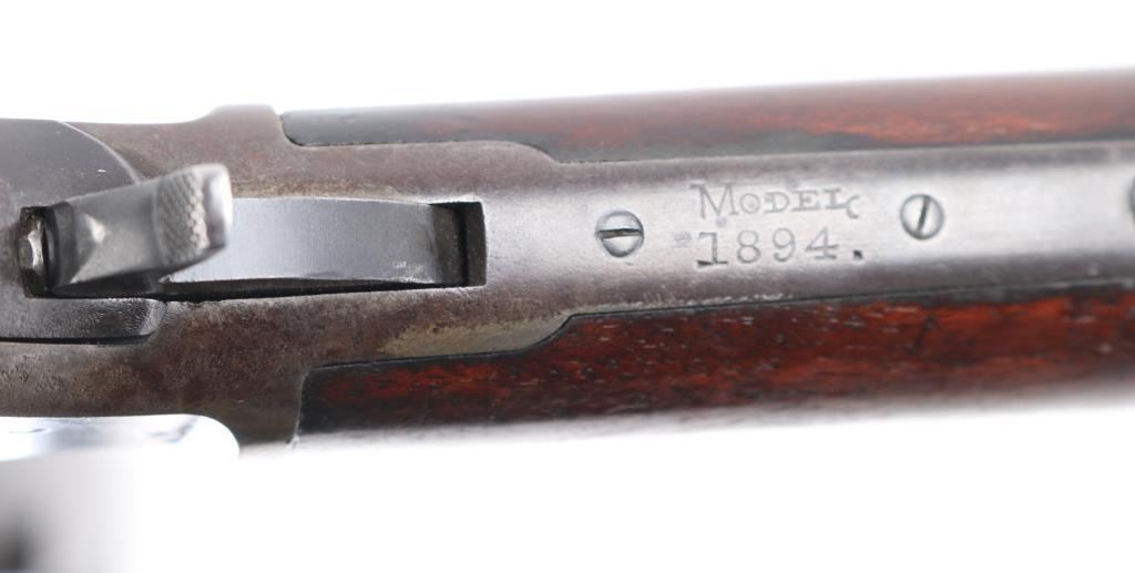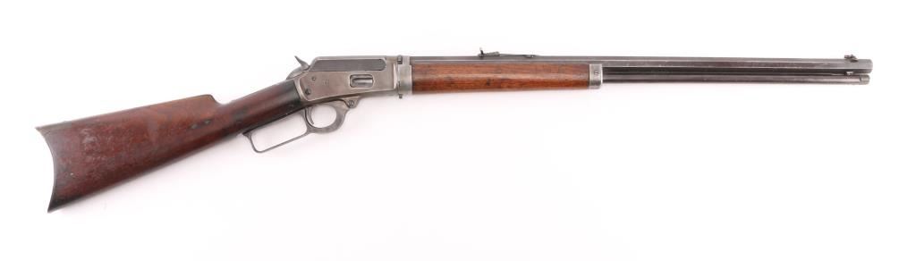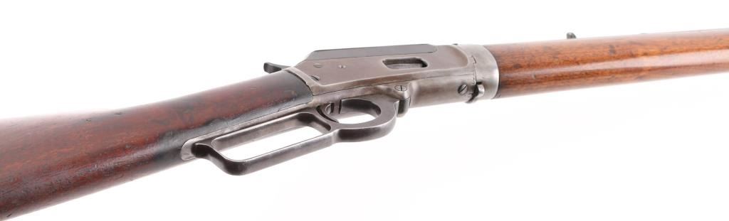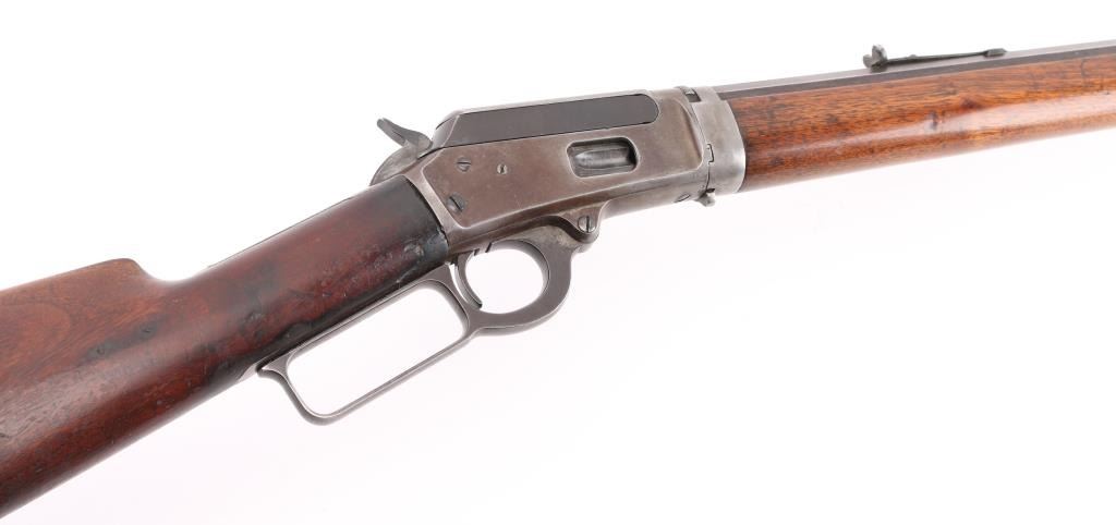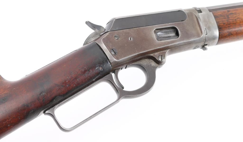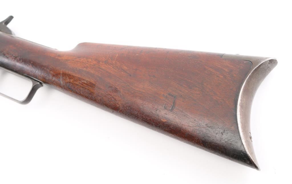 Take-down lever action rifle manufactured circa 1902. Features 24" octagon barrel, full length magazine tube, buckhorn sights, straight grip, steel crescent buttplate. Barrel has been relined, bore is very good. Blue is about 50%, turning a patina brown color, thinning at all sharp edges, much bare metal showing on receiver. Bottom of receiver and receiver extension show numerous small strikes near the takedown latch. Crescent buttplate is a medium silvery gray color, has been filed or ground at toe to better fit the stock. Wood is very good condition, generally good fit to metal, visible scratches & dents, a newer coat of varnish applied. there is a ":C" carved in the left buttstock. Buttplate marked "R 28", rack number ?. Action is smooth. Most markings are crisp; serial number on receiver is partially eroded from impact damage.