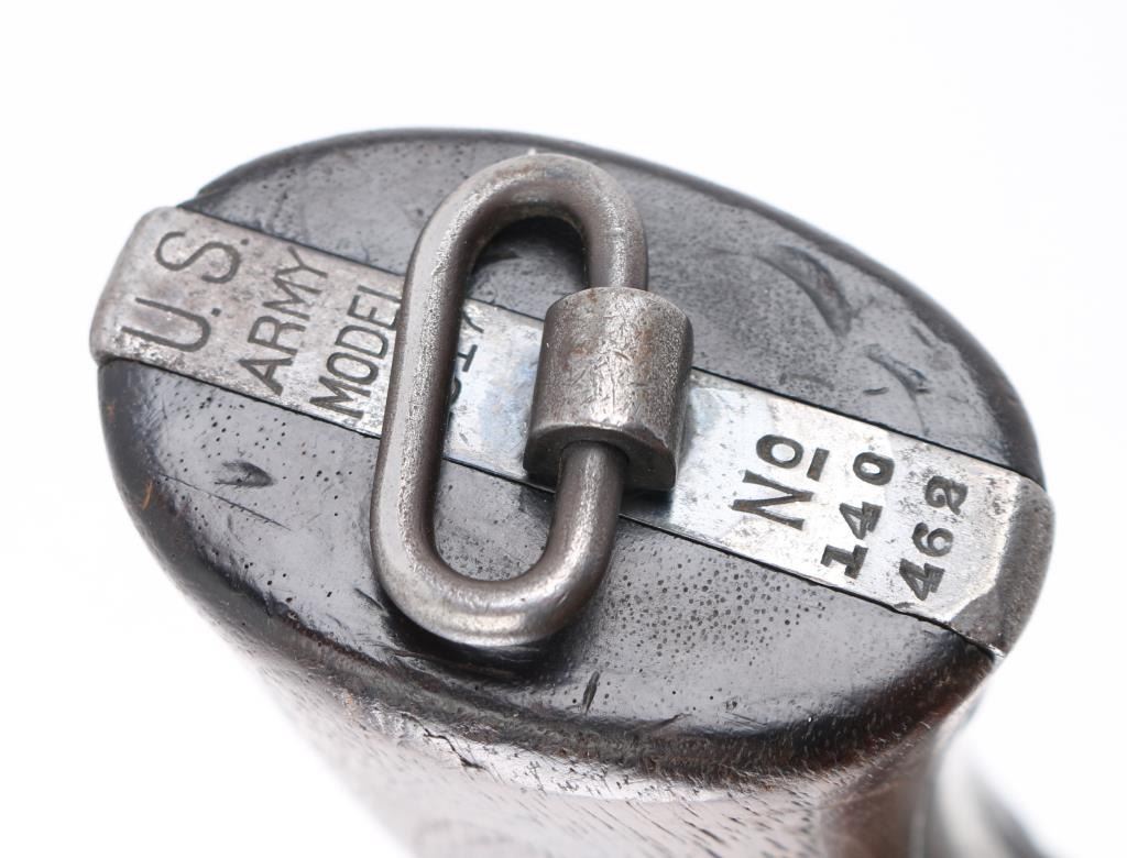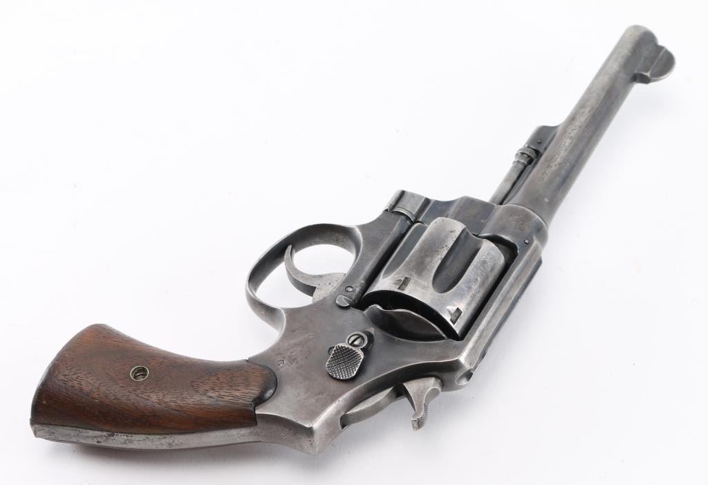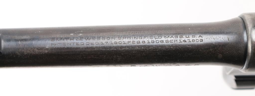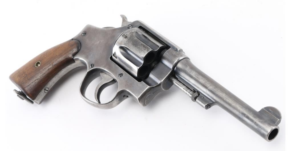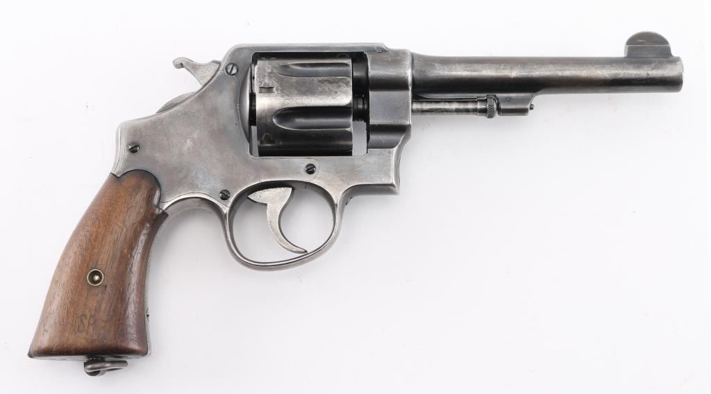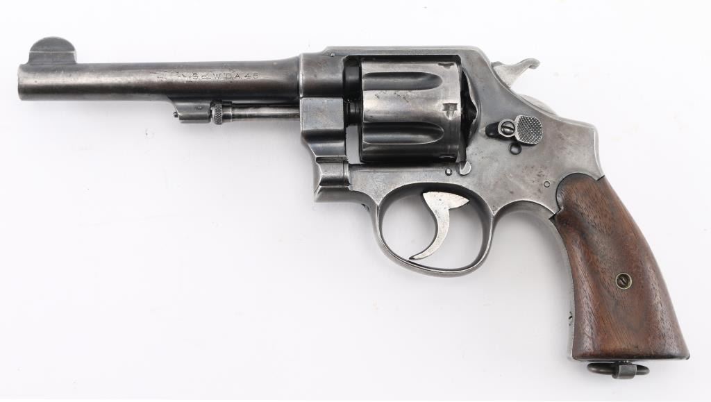 SN: 140462 WWI era U.S. Army contract large frame double-action service revolver chambered in .45 Auto, manufactured in Springfield, MA . Features a blued finish, pinned 5.5" tapered barrel, forged round blade front sight, "u" notched rear sight, fluted six-shot swing-out cylinder, non-shrouded ejector rod, case hardened .265" smooth trigger, case hardened .265" hammer with knurled spur, five screw square butt N service frame with lanyard ring on the butt, and smooth walnut grips. Matching serial numbers are found on the frame, barrel, cylinder. Other Markings: Frame -"U.S/ARMY/MODEL/1917" & "No/140462”. Barrel- "SMITH & WESSON SPRINGFIELD MASS. U.S.A./PATENTED DEC.17.1901. FEB.6.1906. SEP.14.1909", "S.&W. D.A. 45", "140462". There are 3 eagle head proofs, "S1 & S2" inspectors proofs indicating late war manufacture. No U.S. Property stamp on barrel, "SP" cartouche on right grip panel, feint (?). Revolver retains approximately 40% of its original blued finish showing handling wear, scattered scratches, and thinning on the gripstraps. Action is crisp with excellent lock-up, the bore is good with good rifling & minor pitting, the markings are sharp and the matching wood grips are very good.` Condition is NRA Good. C&R Firearm.