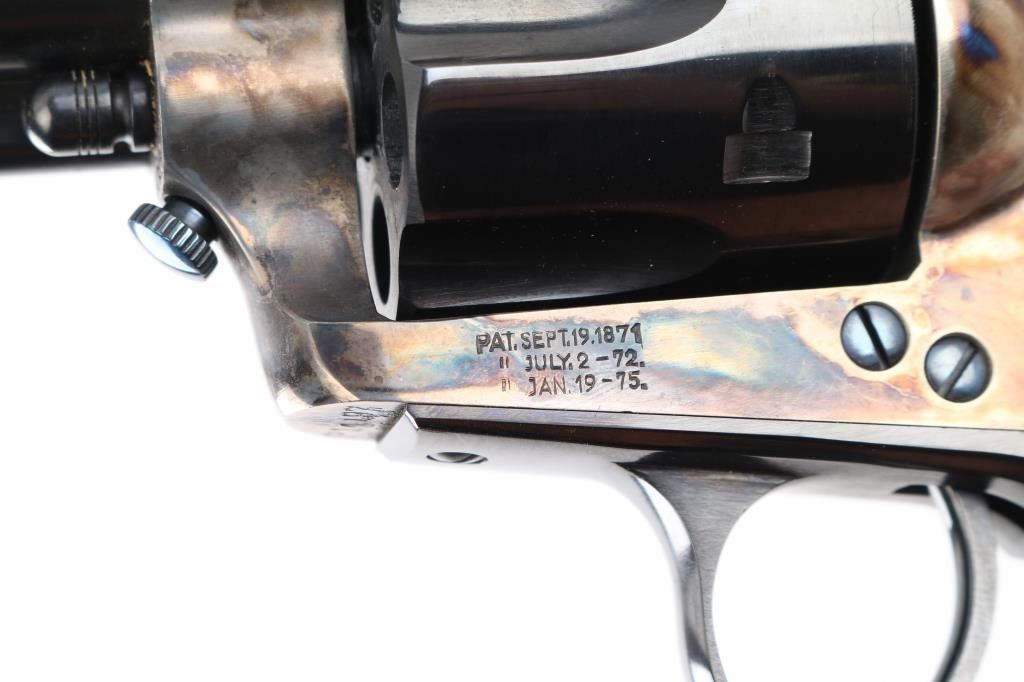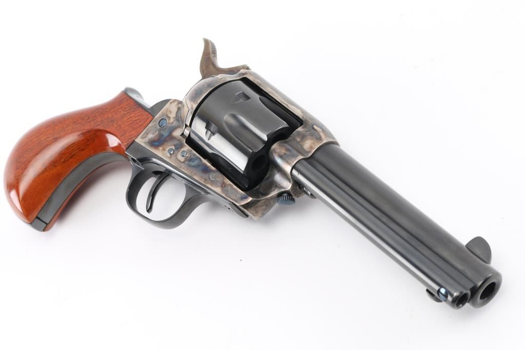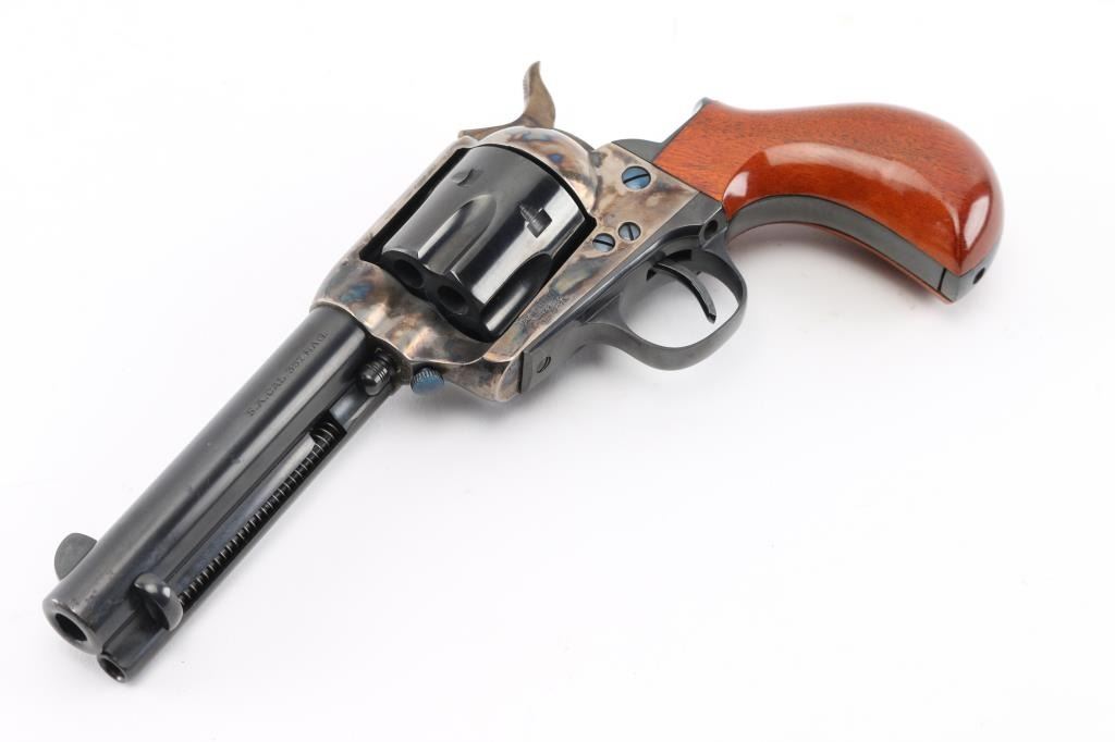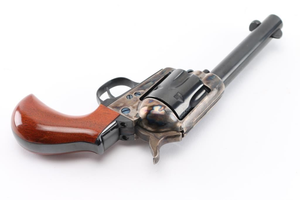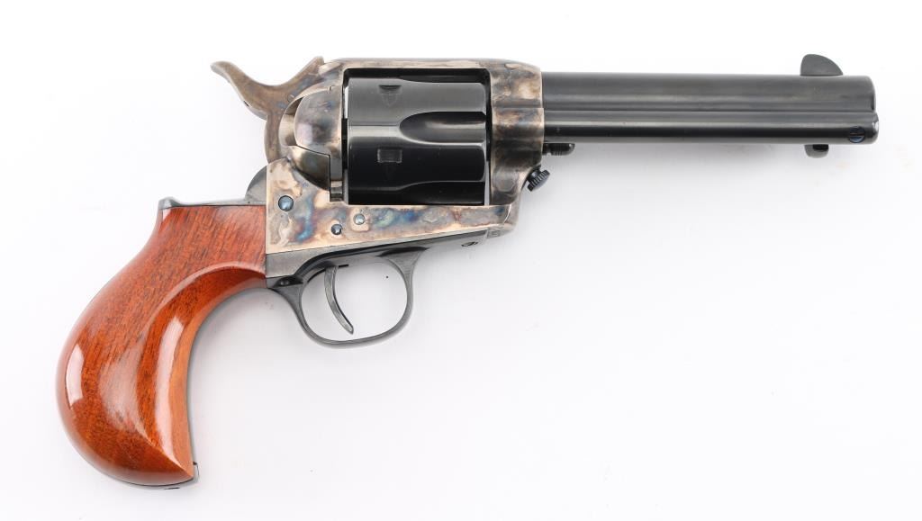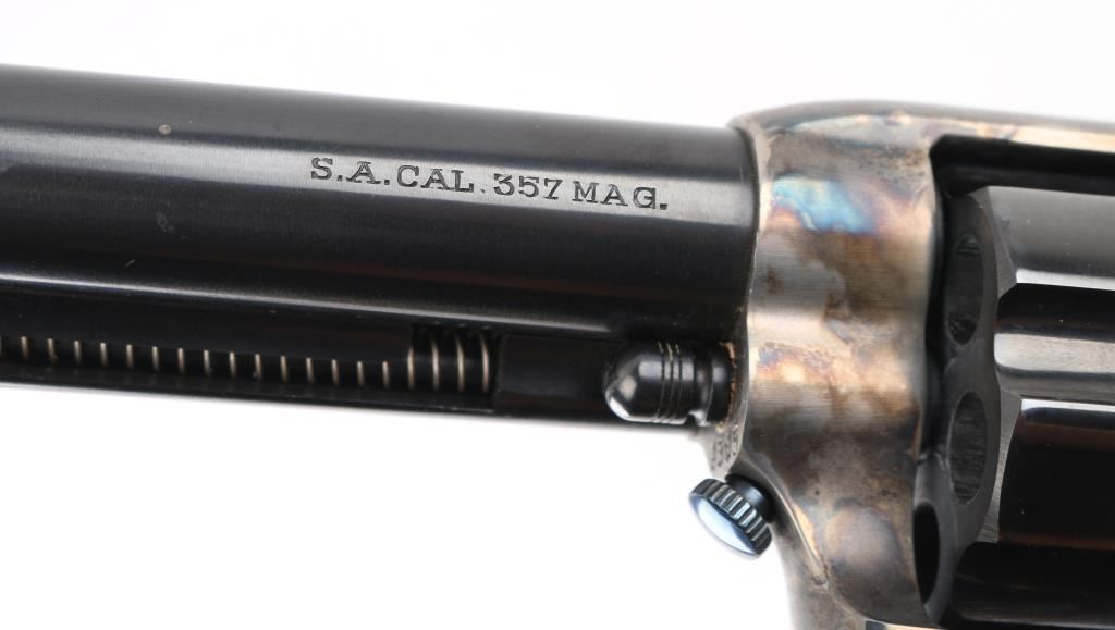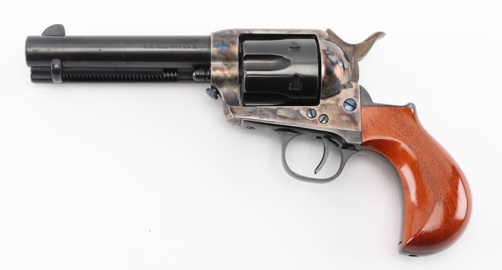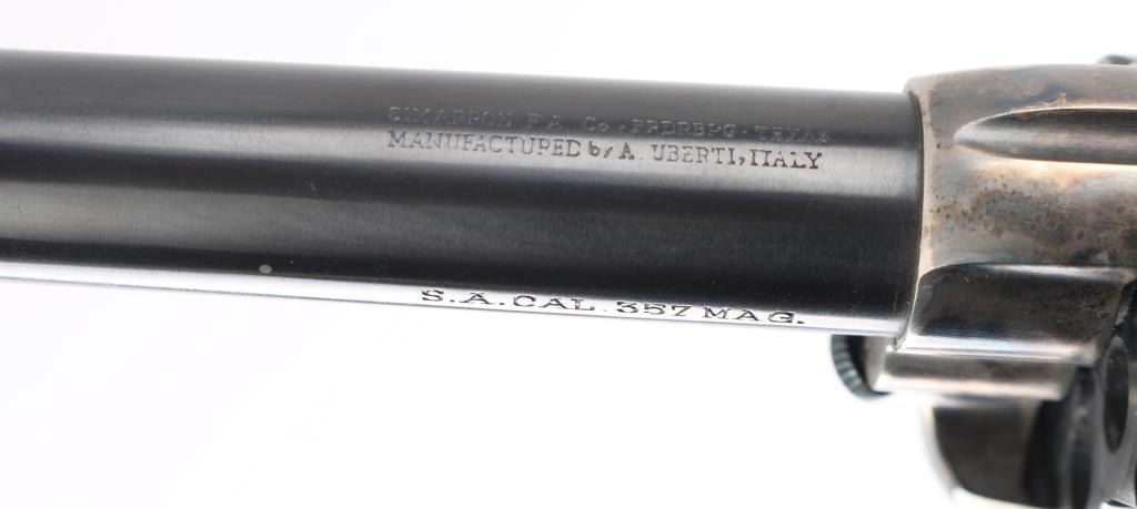 SN: P14197 Western style single action revolver modeled after the Colt 1887 ‘Thunderer’ and chambered in .357 Mag. Manufactured in Italy by Uberti and imported by Cimarron of Fredericksburg, Texas with the import stamp in the style of a 'barrel address'. Features a blued & case hardened finish, 4 3/4" barrel, blade front sight, 'v' notched rear sight, smooth thin trigger, knurled hammer spur, fluted six-shot cylinder, ejector rod with crescent head, and one-piece varnished walnut bird's head grip. Revolver retains approximately 99% of its original finish. Action is crisp with good lock-up, the bore is pristine and the walnut grip is fine, Serial number matches on the frame, cylinder, and loading gate. Condition is NRA Excellent. Modern Firearm.