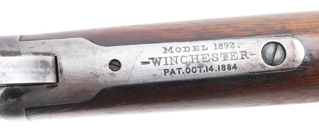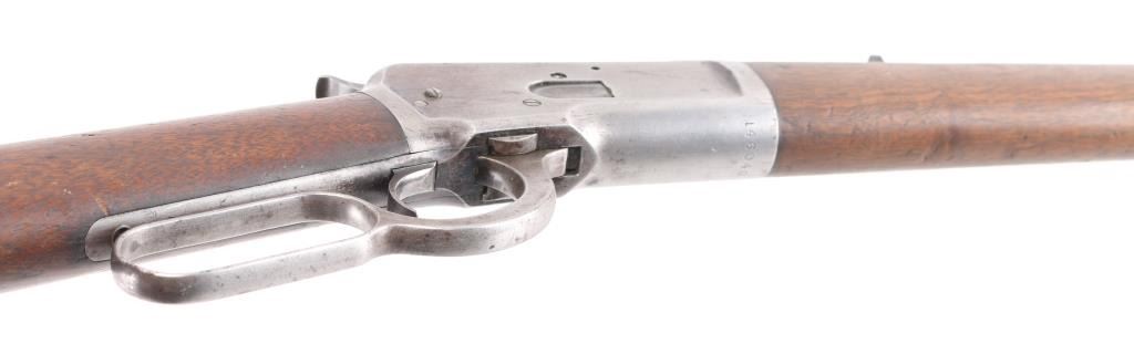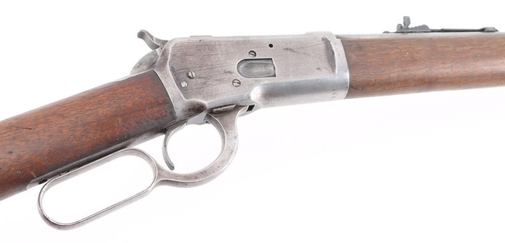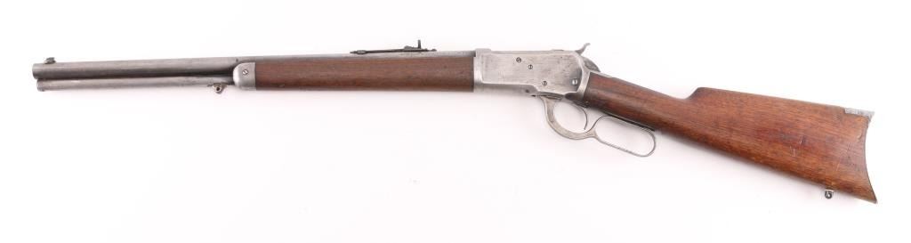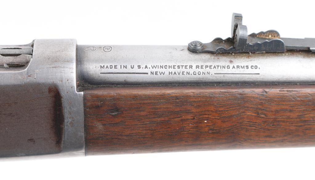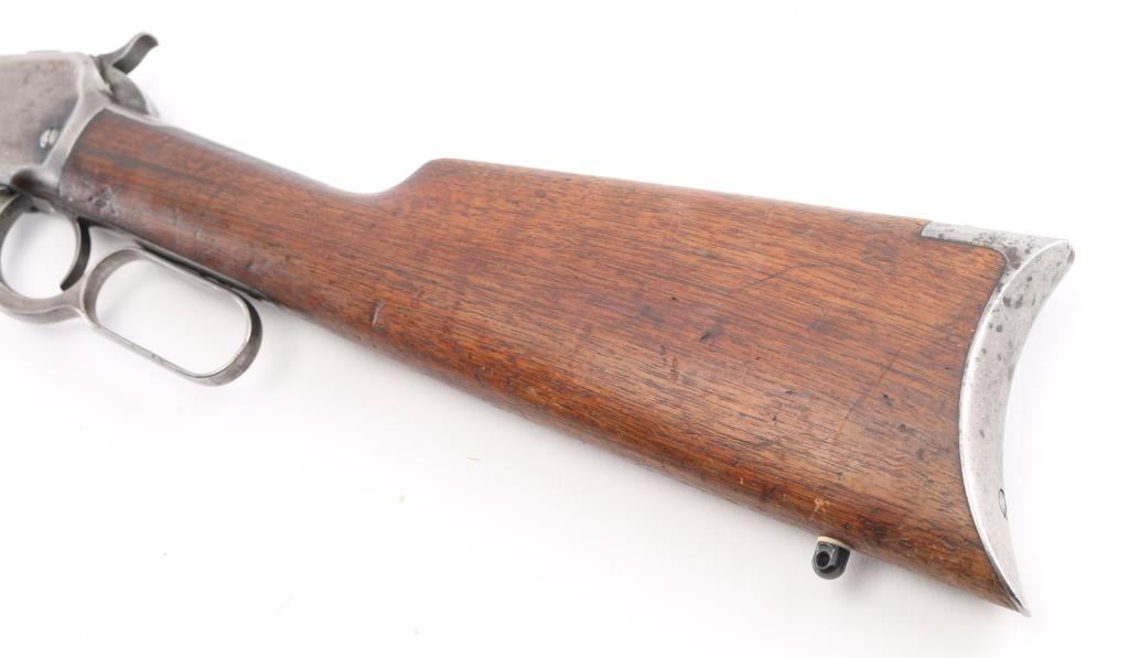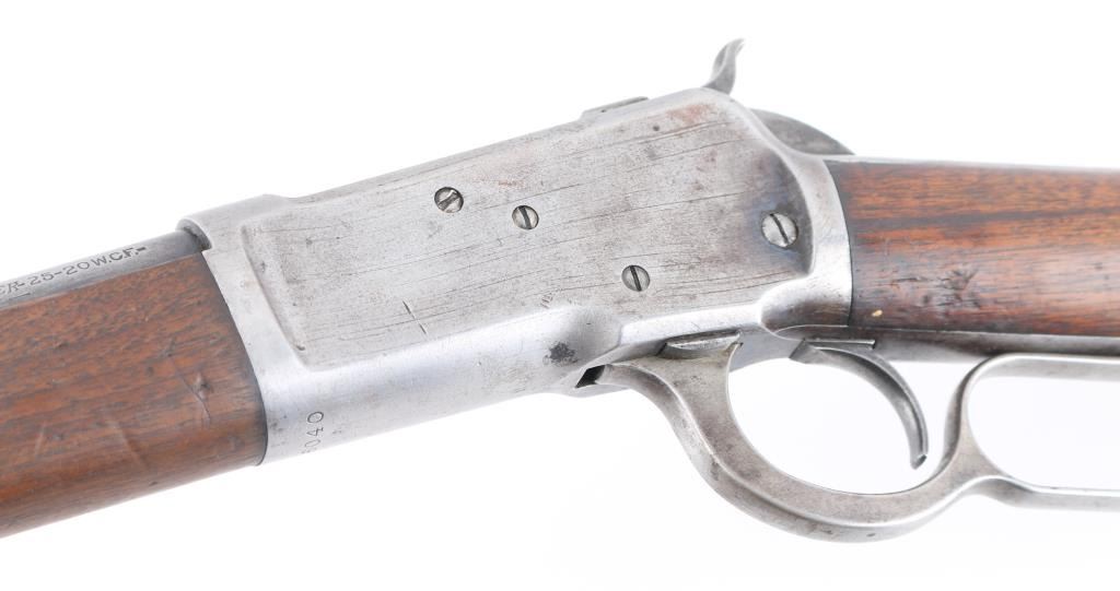 Lever-Action. Manufactured 1897. 'Eastern' carbine. 20" round barrel with front blade/bead, and sporting rear sights. Winchester/patent markings on barrel/tang. 25-20 W.C.F" forward of receiver. Action is crisp/tight. Bore has rifling present with light pitting. Blued metal finish is now in the white with small traces in p[protected areas Walnut stock/forearm are good with scratches/dings, rear sling stud added, forearm has hole for stud & a stud has been brass braised onto the magazine tube. There are a couple on minor dents in the magazine tube. Markings are crisp/clear. NRA Condition-Very Good as Antique Firearm.