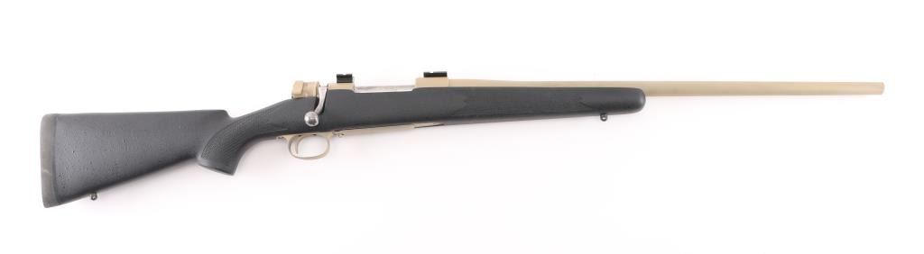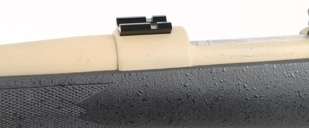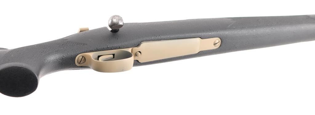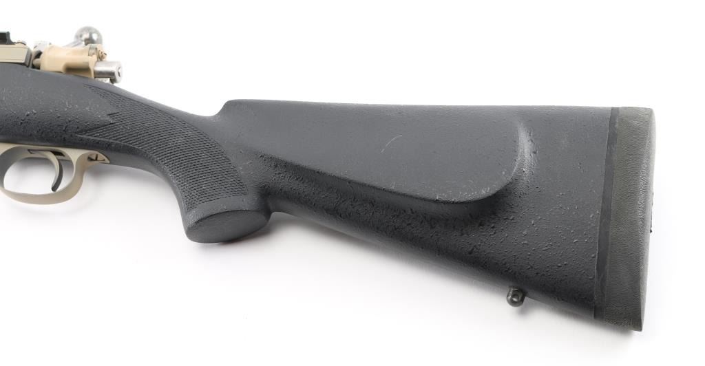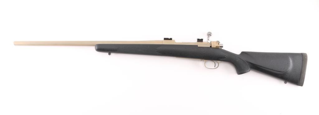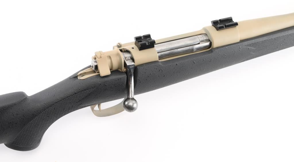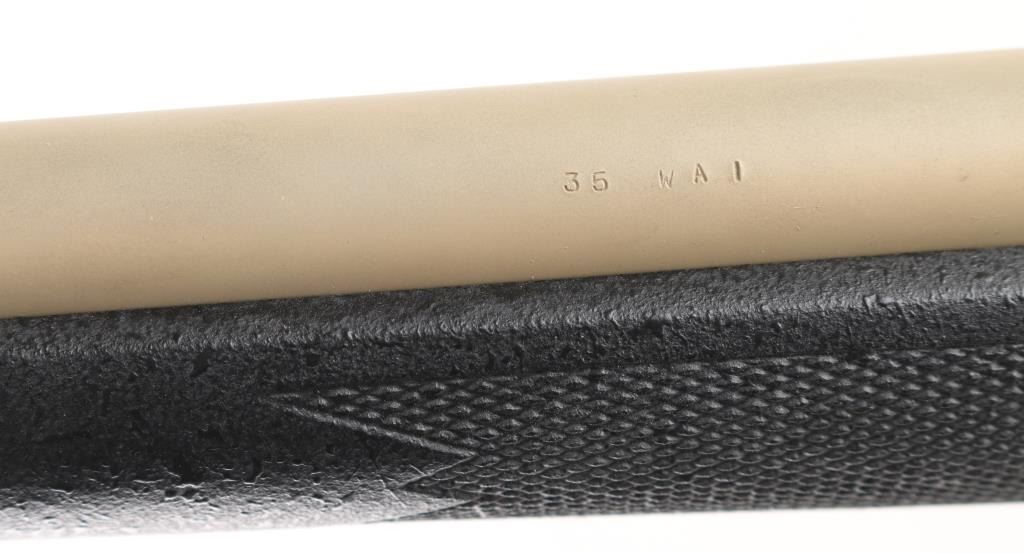Custom built bolt action sporting rifle chambered in .35 Whelen Ackley Improved, utilizing a Belgium made Mauser style action. Features a painted flat dark earth finish, 23.5” tapered barrel without provisions for sights, installed two-piece scope base, smooth trigger, two-position scope clearance safety on the rear of the bolt, internal box, polished bolt with swept-back handle and textured black fiberglass semi-pistol grip shoulder stock with checkered grip panels, swivel studs, right hand cheek piece, Decelerator recoil pad & 13 1/2” LOP. Rifle exhibits most of its FDE painted finish which was applied thin in some areas. Action is smooth, the bore is excellent and the fiberglass stock is fine. Condition is NRA Very Good. ***C&R Firearm***