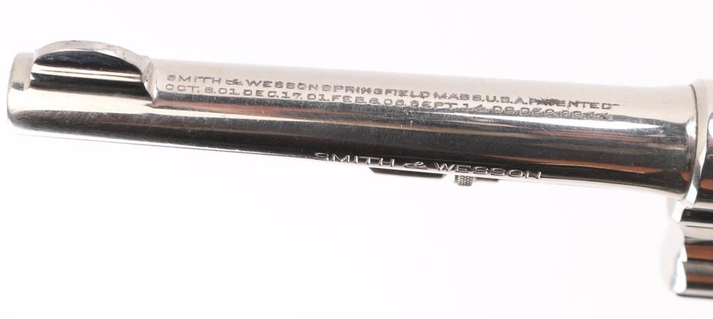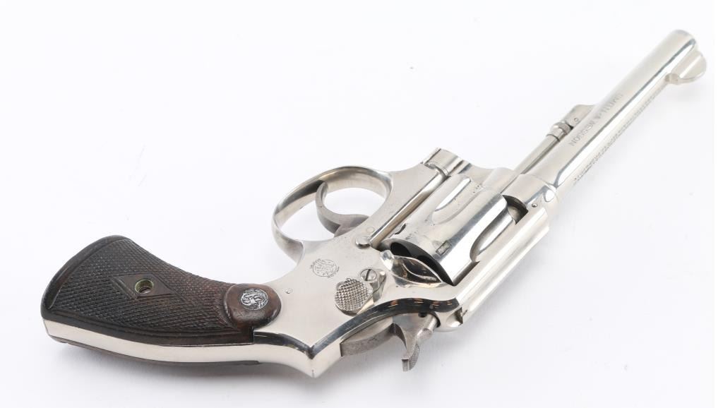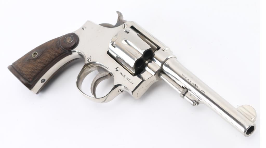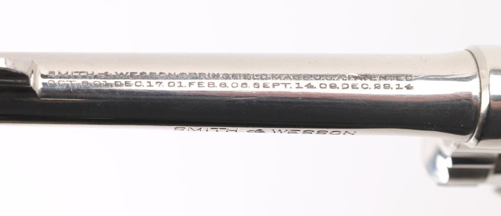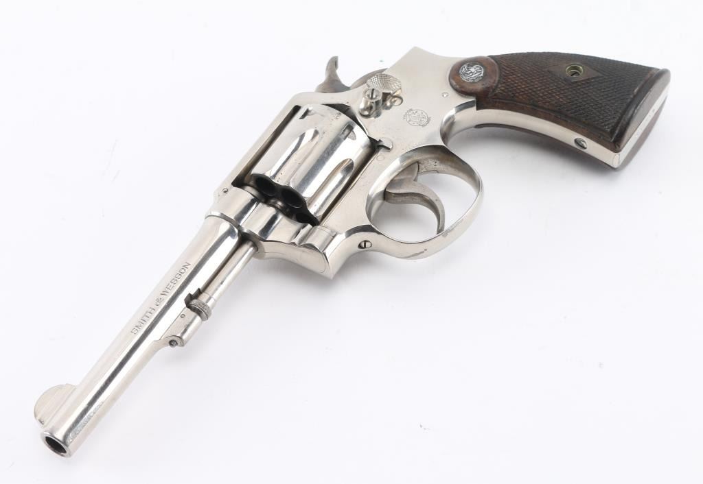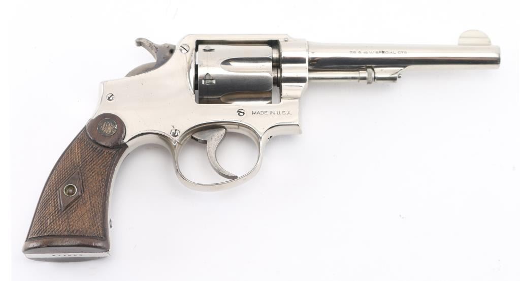 'Model of 1905 - 4th Change' double action revolver manufactured circa 1915-1942, built on the five screw square butt "K" frame. Features 5" barrel, half moon fixed front sight, fixed notch rear sight, fluted 6 shot cylinder, nickel finish, checkered wood grips with brass S&W medallions. Revolver retains approximately 95% of its nickel finish showing edge wear and scattered scratches. Bore looks good but dirty. Grips are fine but the color has worn off the medallions. Condition is NRA Very Good++ *C&R Firearm*