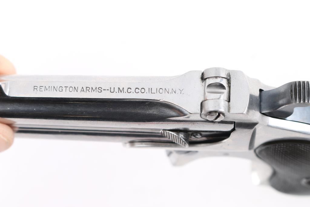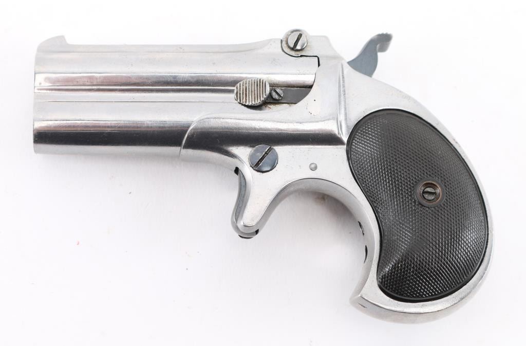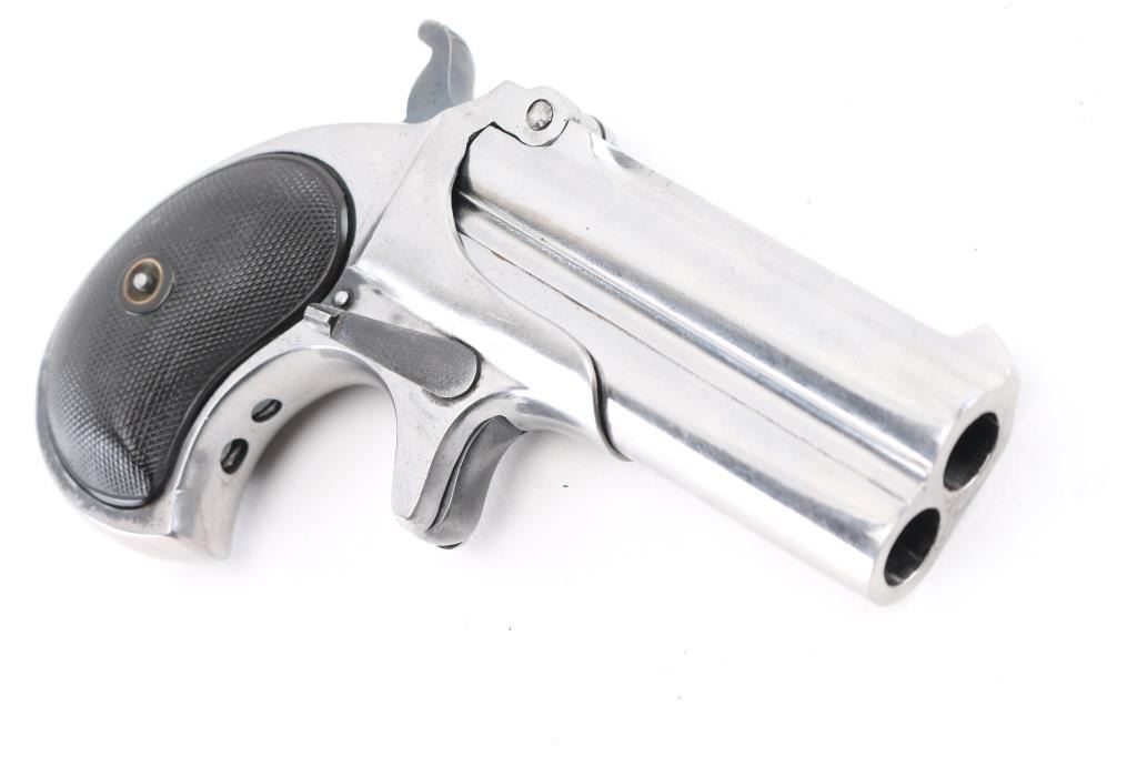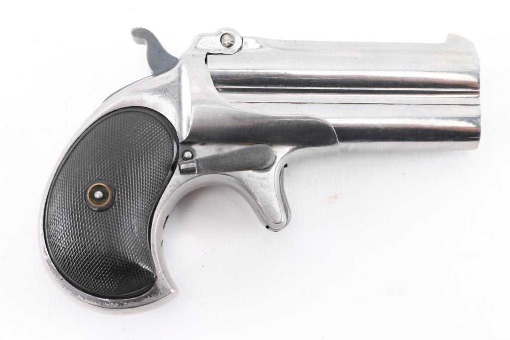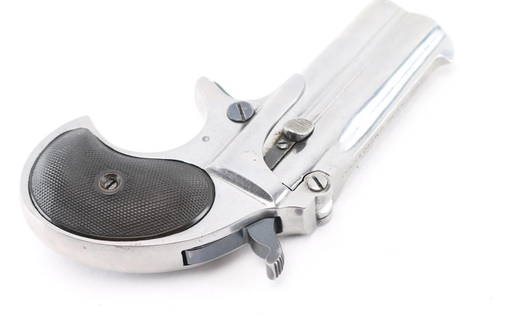 Type III (Model 4) Vintage over/under double barrel derringer chambered in .41 Rimfire Short, manufactured circa 1912-1935. Features a nickel plated finish, 3" barrels with solid sighting rib marked "REMINGTON ARMS-UMC CO. ILION, N.Y", fixed blade front sight, 'u' notched rear sight, smooth spur trigger, knurled hammer spur, manual extractor, auto-rotating barrel selector, steel frame and two-piece checkered black hard rubber grips. The barrel is stamped with serial number. The derringer displays a very good nickel plated finish with minor scratches, blued hammer, trigger, frame screw, & lever are very good, bores are excellent, & grips are excellent. NRA Condition-Near Excellent. C&R Firearm.