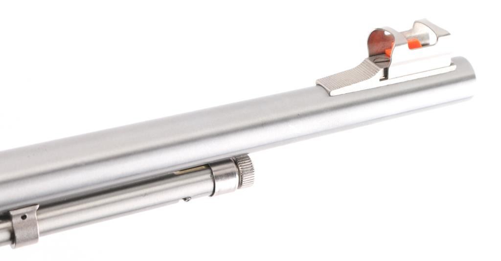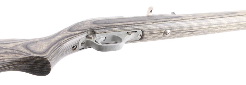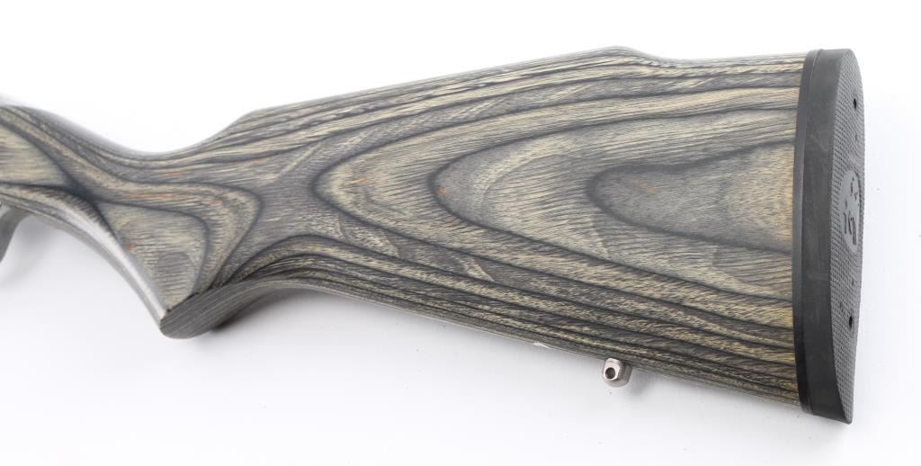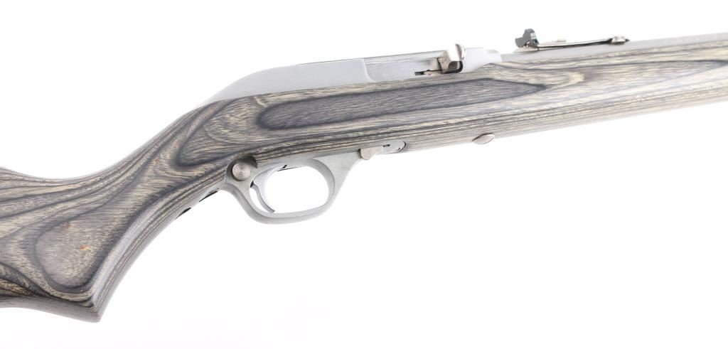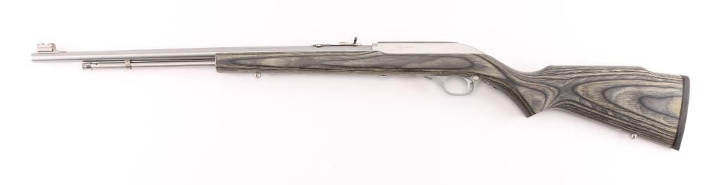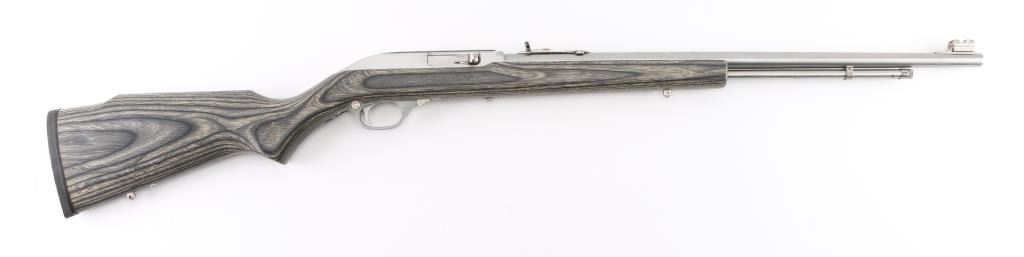 Early model semi-automatic rifle, 18-round tube fed, stainless steel 22" barrel, Micro-Groove rifling, bore is bright, receiver and trigger guard are nickel plated, serrated trigger, side ejection, manual and automatic last-shot bolt hold-opens, cross-bolt safety, Monte Carlo laminated two-tone black/grey hardwood stock, full pistol grip, tough Mar-Shield finish rubber rifle butt pad, nickel-plated swivel studs. Sights are adjustable semi-buckhorn folding rear ramp front sight with high-visibility post and cutaway Wide-Scan hood. Receiver grooved for scope mount. LOP is 13 3/4". **NRA Excellent** Modern Firearm
