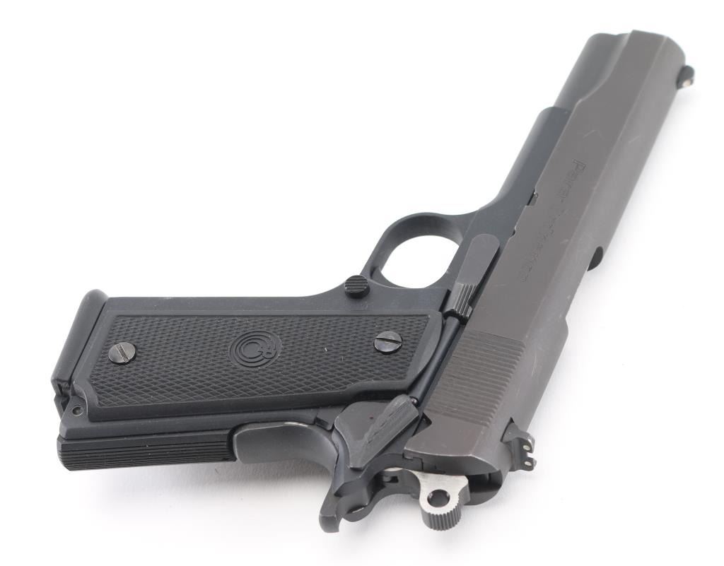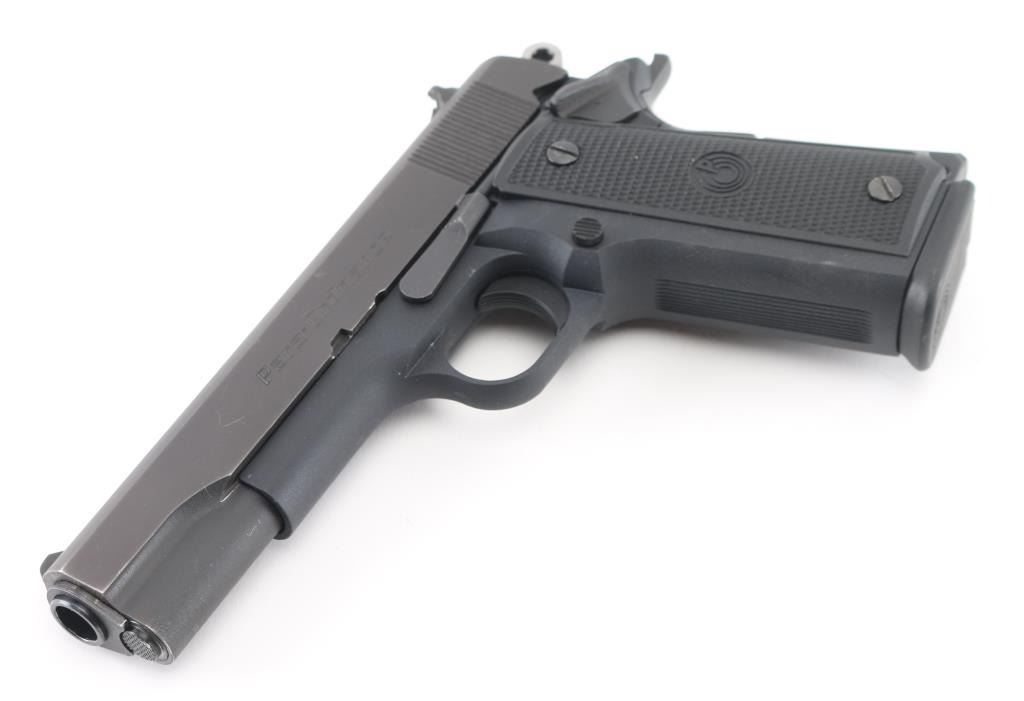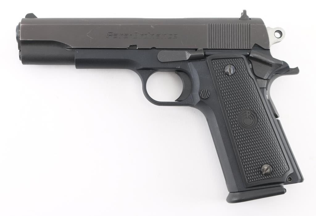 Steel frame pistol with hard rubber grips with Para-Ordnance logo, top screw of left grip is loose so there is a gap at the top of the grip, 4" barrel, white 3-dot iron sights, serrations on rear of slide, manual thumb safety, one double-stack magazine. There are small scratches and rub marks on this pistol. **NRA Condition Good+** Modern Firearm
