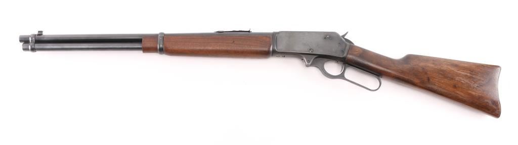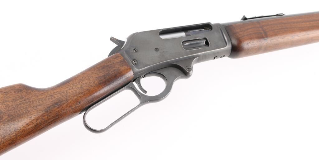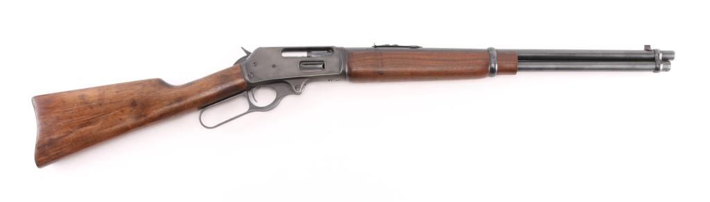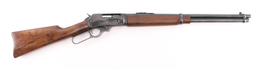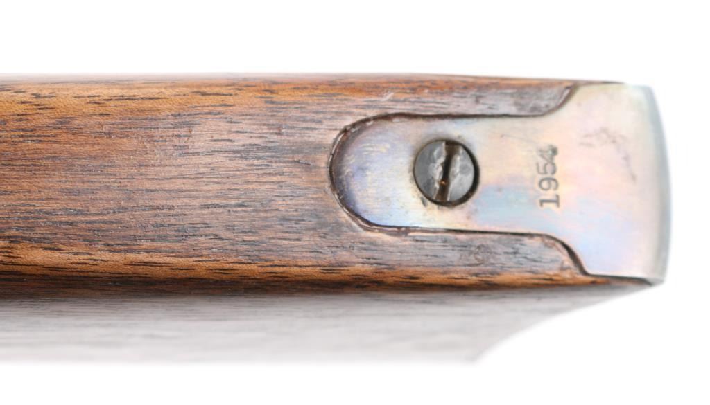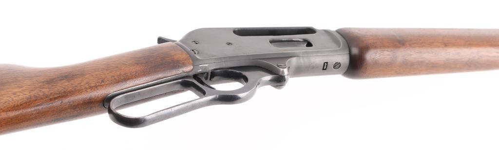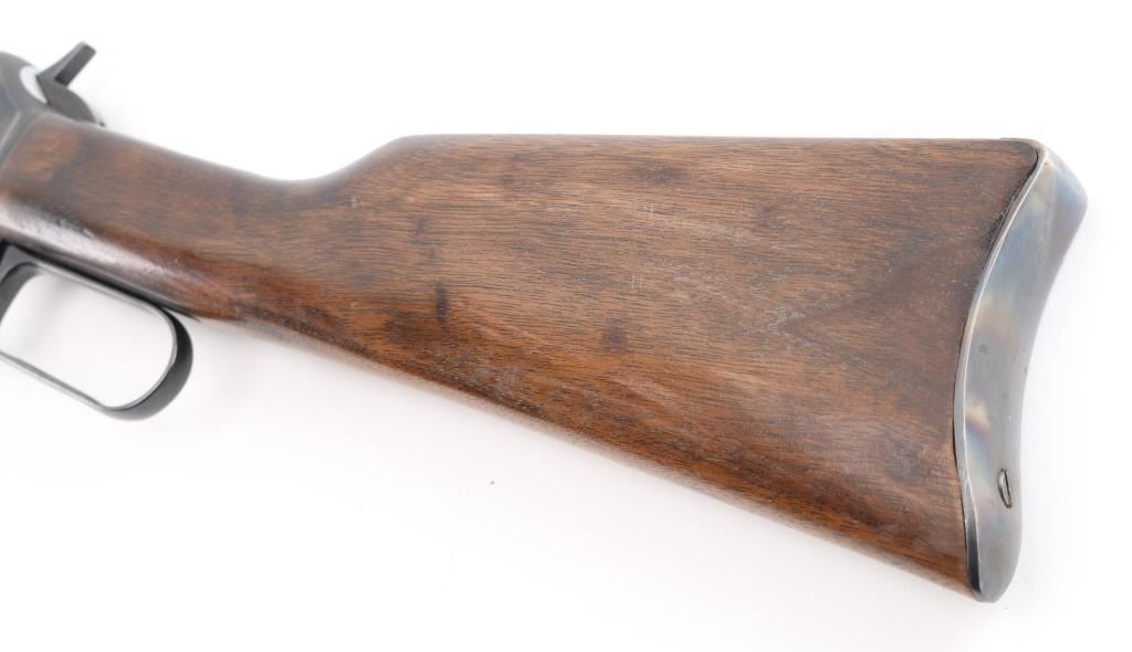 Manufactured 1954, marked "1954 on buttplate tang. The RC sub model is noted for its 20" barrel. Lever action rifle features 20” barrel and full-length magazine. The front sight is a brass bead blade with sporting rear sight . The metal surfaces retain the majority of the blue finish with wear on the underside of receiver. The smooth wood stock with a pistol grip is in very good condition with handling marks. The bore looks good with strong rifling, needs cleaning, the action is crisp and the markings are sharp. Condition is NRA Very Good. C&R Firearm.