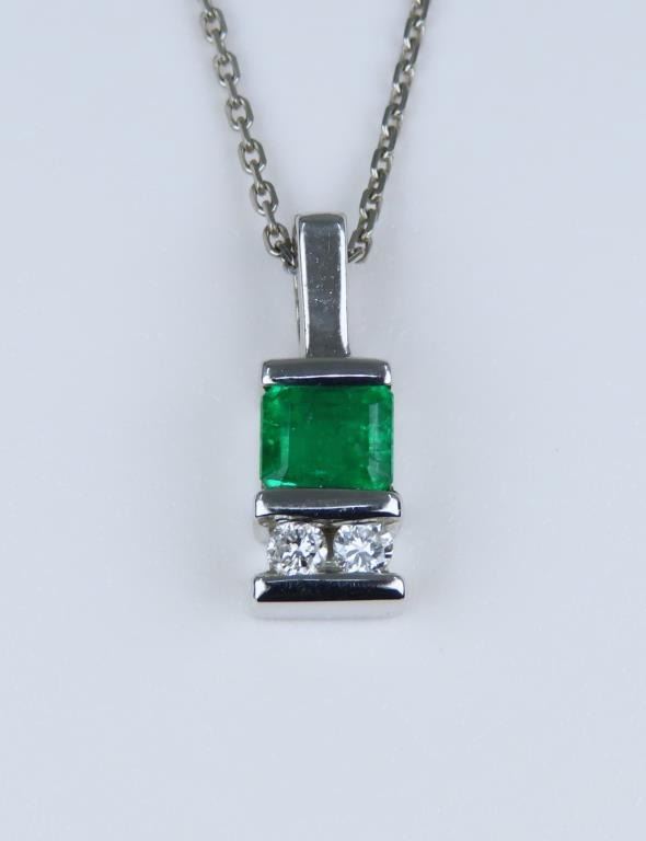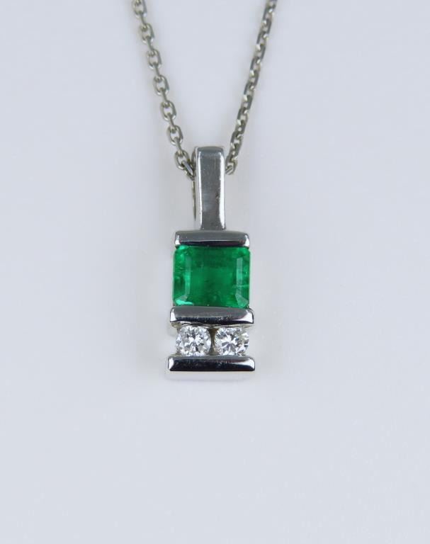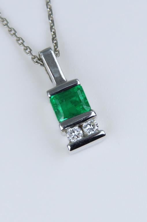 and Diamond Pendant featuring a natural Princess cut Emerald weighing approx. 0.80 carats with vivid Green color channel set with 2 round cut Diamonds set in a custom 14 karat white gold setting.