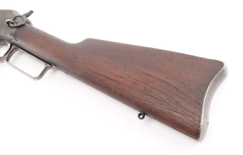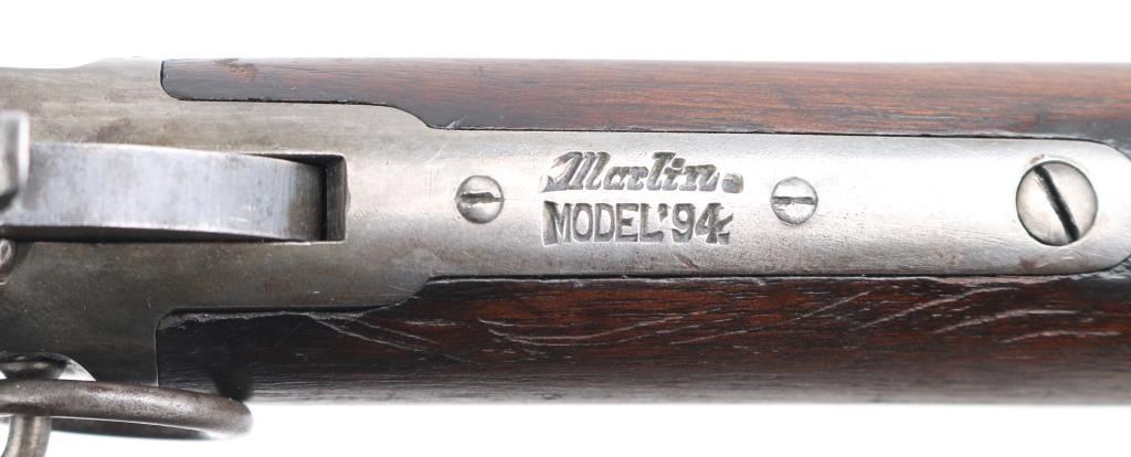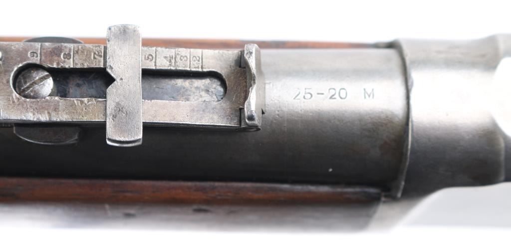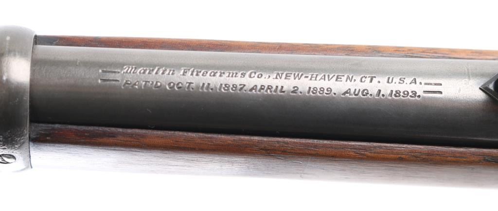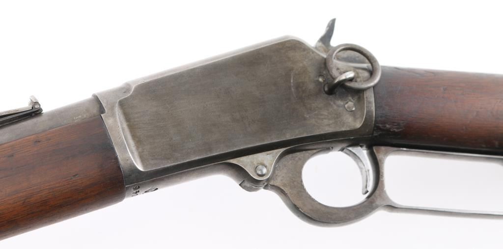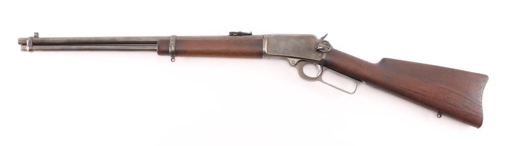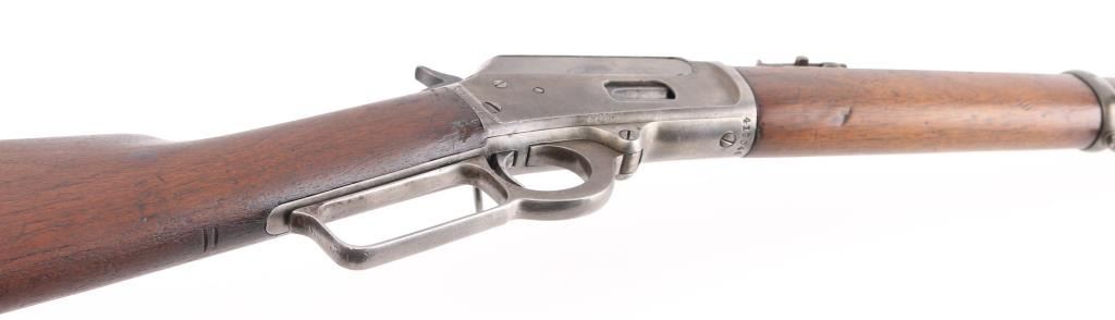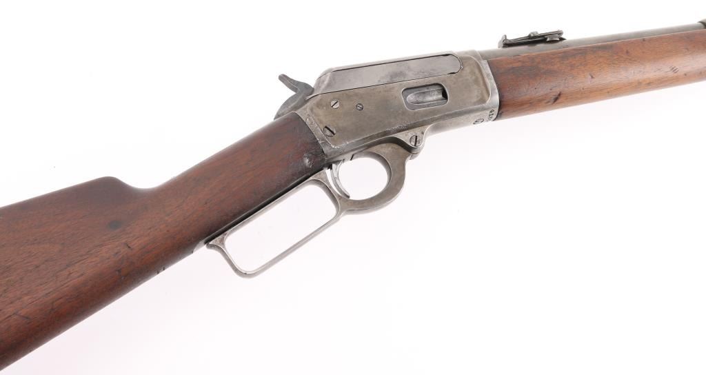 Rare caliber. Lever action rifle manufactured circa 1894-34. Features blued finish, straight gripped two piece stock, curved steel buttplate, 20" barrel, buckhorn type sights with flip-up rear ladder, full length magazine tube, saddle ring on receiver left, sling swivel studs. Bore is rough/pitted, with shallow rifling, Metal finish is in the white with some scattered pin-prick pitting, action is smooth, wood is good/sound with minor scratches/dings, there is a small chip on the right buttstock where it meets the receiver. Condition is NRA Fair. C&R Firearm.