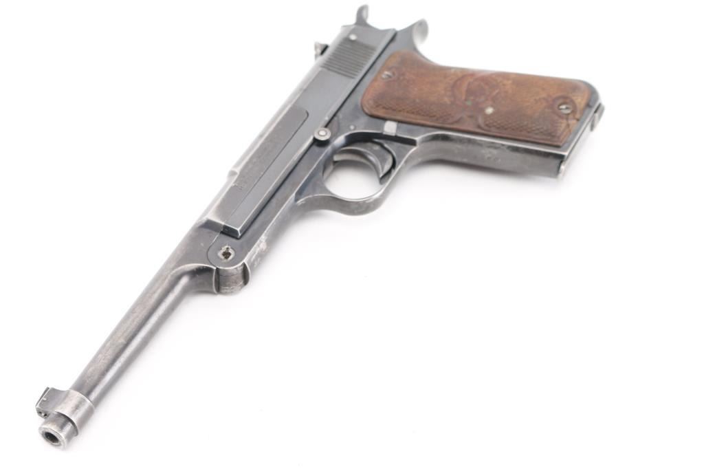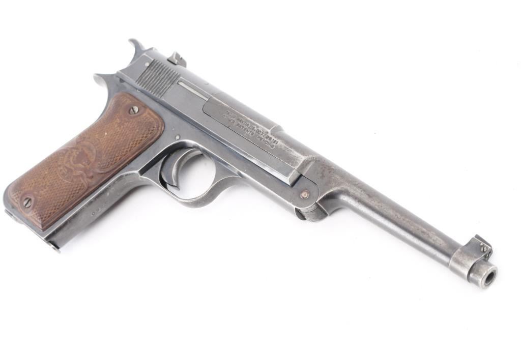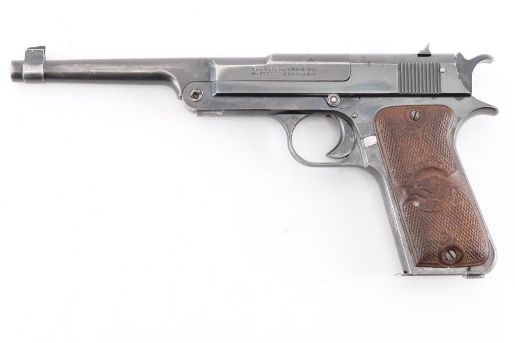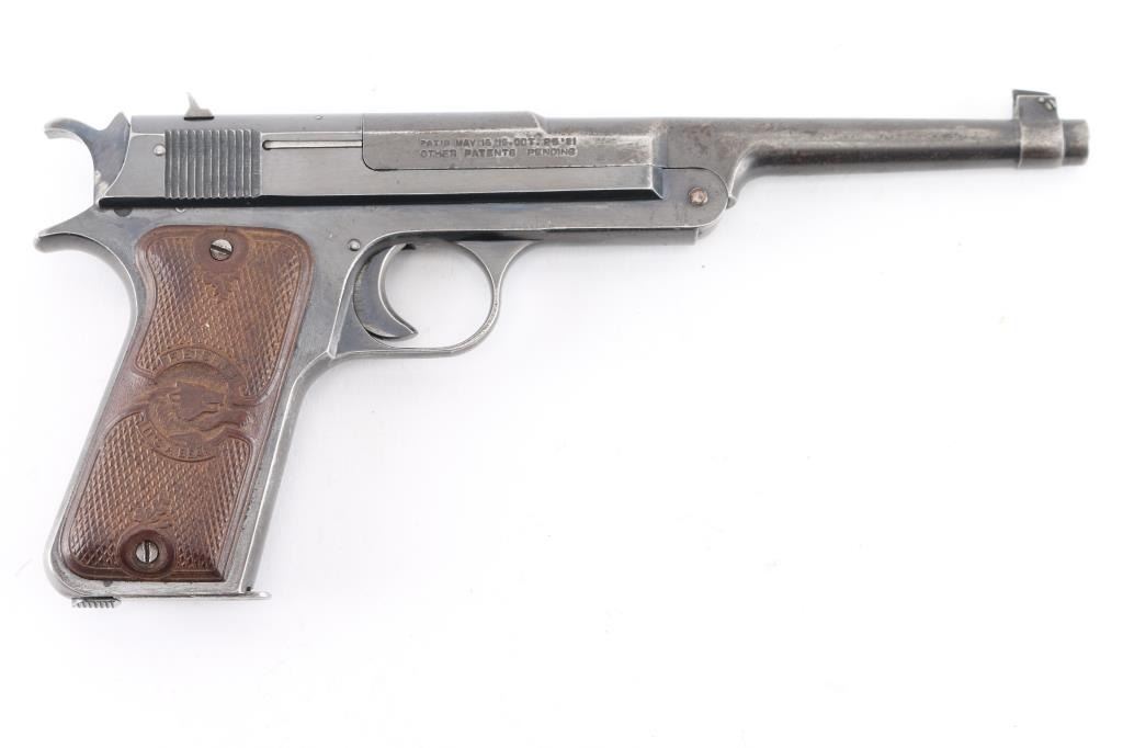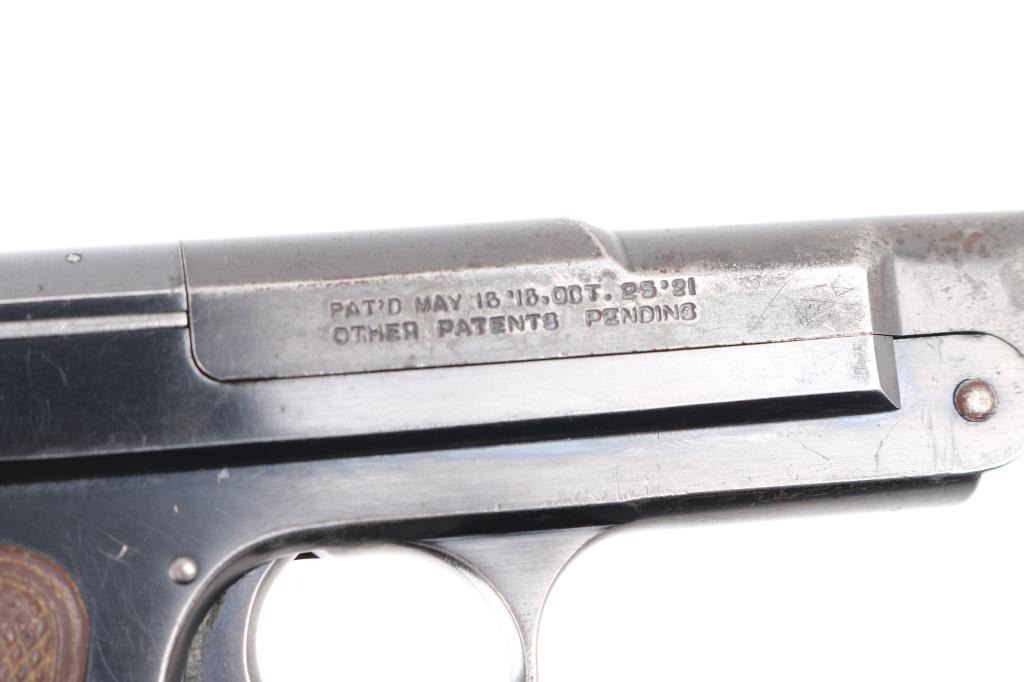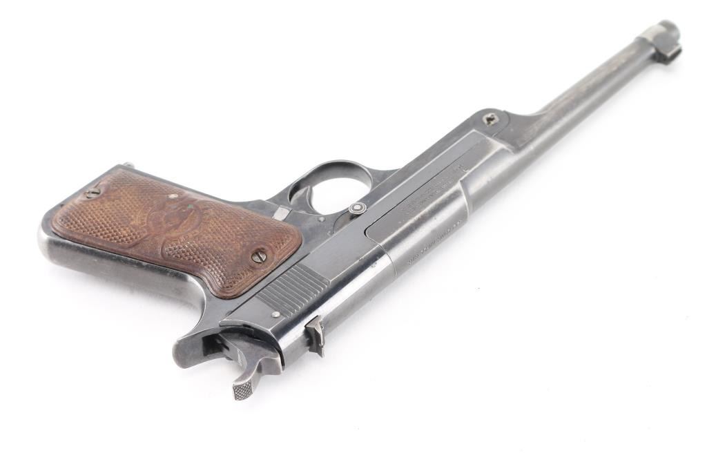 Vintage semi-automatic rimfire pistol. Features blued finish, 6.75" hinged barrel, blade front sight, dovetailed rear window sight with set screw, two-tone magazine stamped "REISING 22", smooth trigger, knurled hammer spur, magazine disconnect safety, take down lever, steel frame and two-piece checkered brown plastic grips with embossed bear image and "IT"S A BEAR!" slogan. Bore is fair with scattered pitting Retains 75% blued finish with few scratches and other signs of handling. Barrel screw head is damaged. Grips are very good condition with no observed chips or cracks. Condition is NRA Fair (Bore) C&R Firearm.