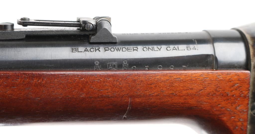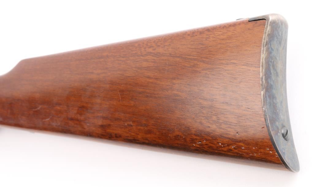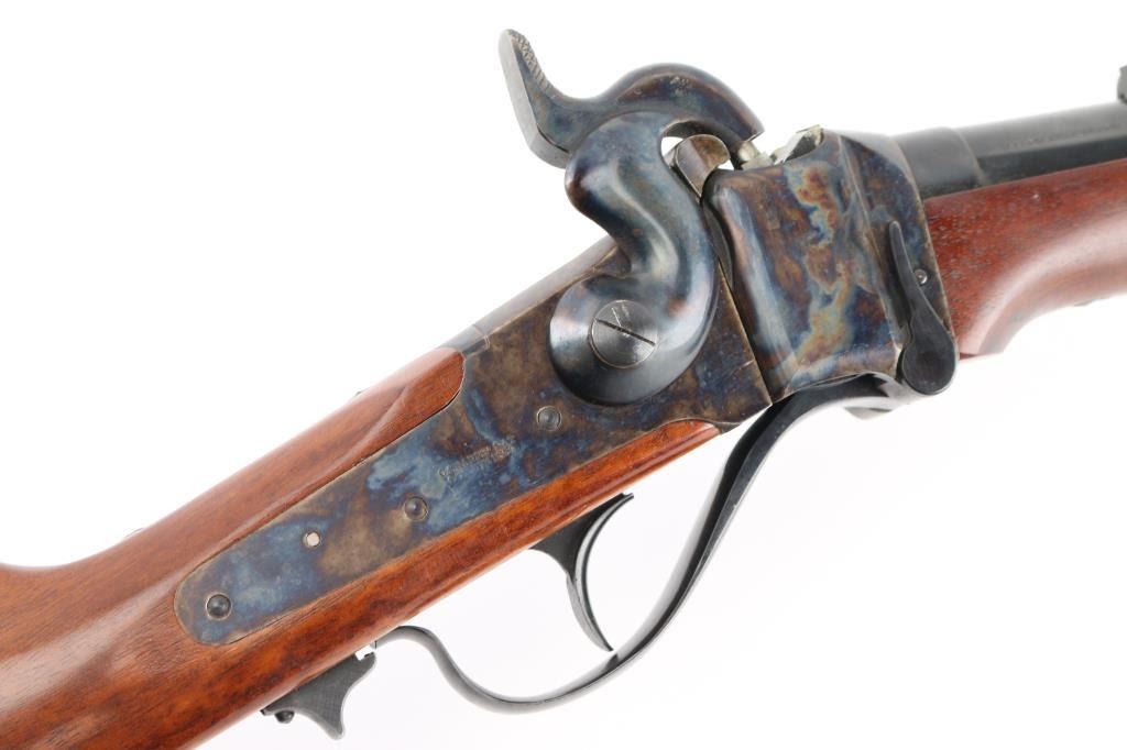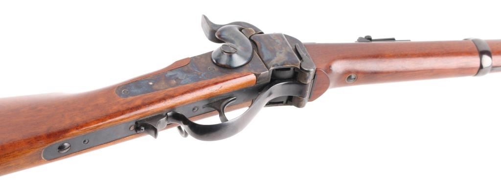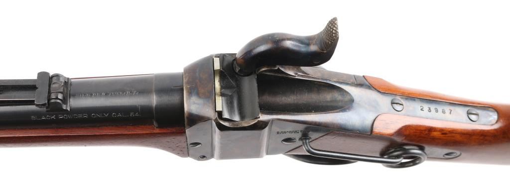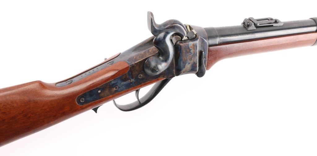 SN: 23987. Single-shot. Blackpowder, percussion. Falling block action. Modern Italian made copy of the Sharps carbine. Made by IAB Marcheno and imported by Sile. Triggerguard is the breech-block lever. Saddle ring/bar present. 22" round barrel with fixed front sight blade, and adjustable rear sights. Blued barrel. Case-hardened receiver, triggerguard, hammer, barrel band and butt plate. Smooth wood, straight stock, and forearm. Bore is excellent. 2-cock action is crisp/tight. Wood is has some very minor dings. Metal finish is excellent. ' Takes a 60-80 gr, paper cartridge. Block-action cuts the paper. Appears un-fired. NRA Condition-Excellent. Antique Firearm.