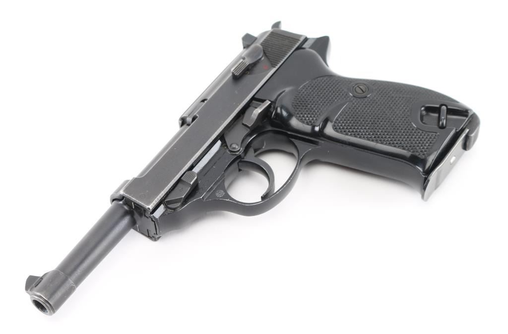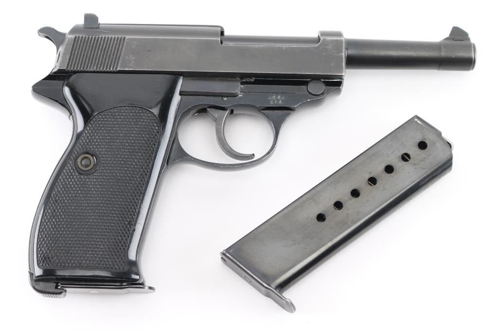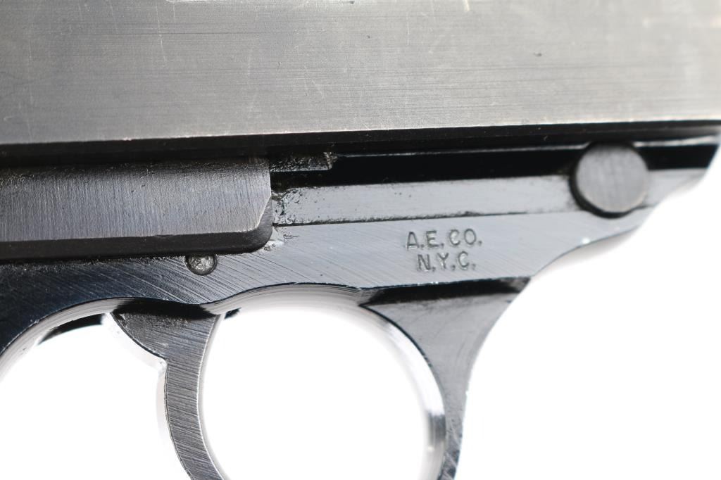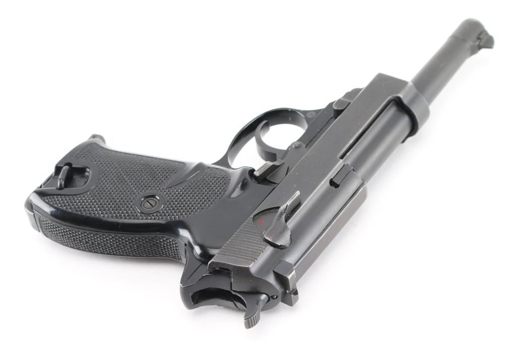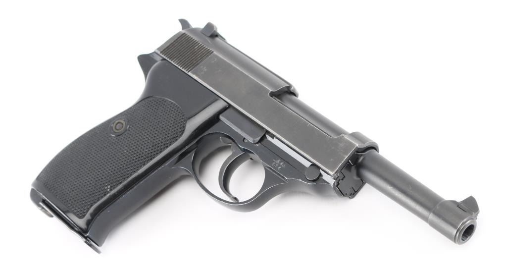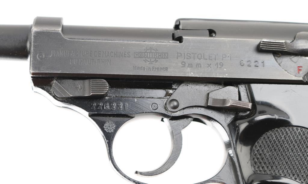 West Berlin Police proofed military semi-automatic pistol chambered for the 9x19mm Luger cartridge, Made in France and imported by A,.E. Co. NYC. Features fixed sights, slide mounted decocker/safety, heel magazine release, double/single action trigger, alloy frame. Bore is very good with sharp rifling. Steel parts are blued a matte black that is even with bare metal beginning to show at edges of slide and around the muzzle. Aluminum alloy frame is finished a gloss black. Black plastic grips are in very good shape. All observed numbers match. Eagle/Swastika proof on right frame, Comes with two magazines. Condition is NRA Excellent. C&R firearem.