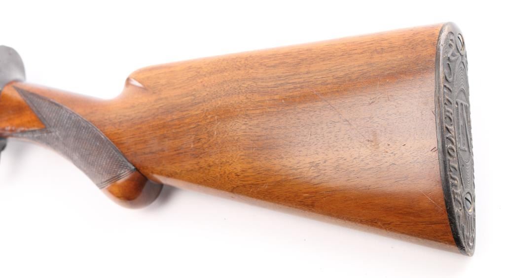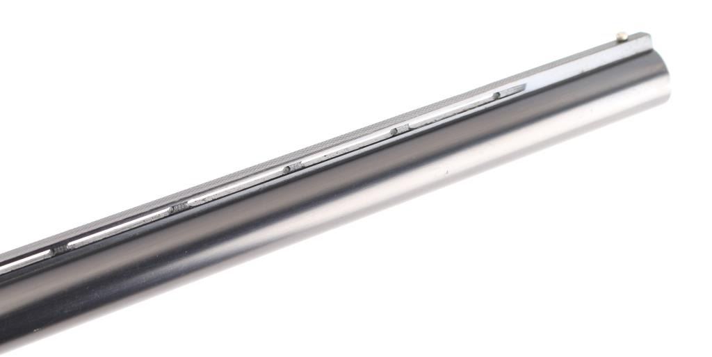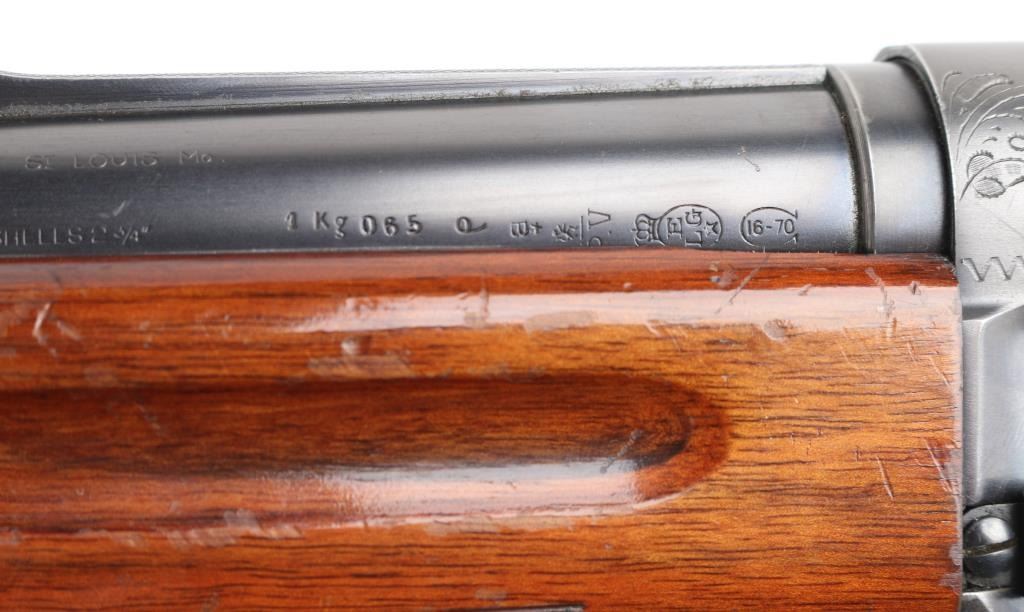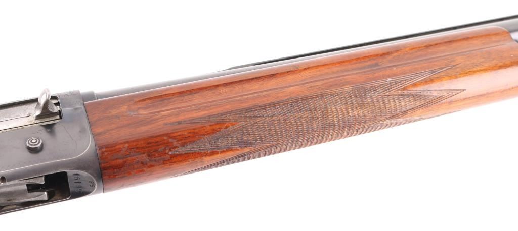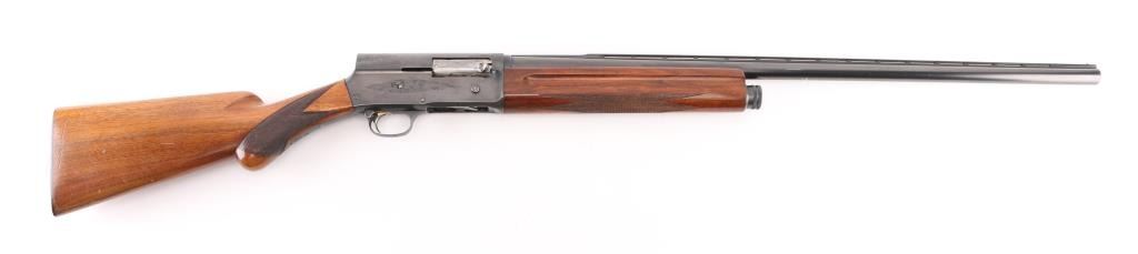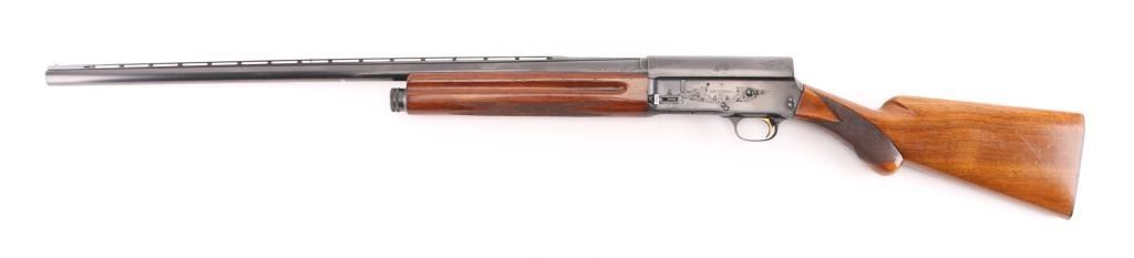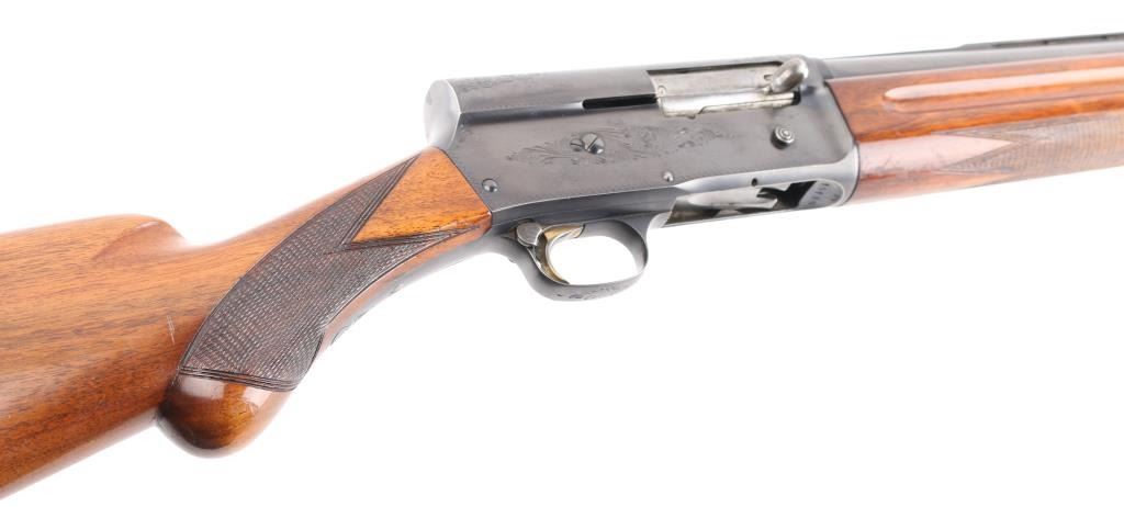 SN: 8516185. Desirable semi-automatic shotgun chambered for 2 3/4" 16 gauge shells, manufactured in Belgium. Features a blued finish, 28" vent ribbed barrel with improved cylinder choke, silver bead front sight, half-length tube magazine, steel receiver with light coverage scroll engraving, magazine cut-off switch, push button safety, smooth gold trigger, knurled charging handle, checkered walnut forend and pistol grip shoulder stock with round knob & factory synthetic buttplate. LOP 14 1/4". Shotgun exhibits approximately 95% of it's original finish showing some scattered light handling marks/scratches and some rubs on the barrel. Action is smooth, bore is excellent and the high gloss wood stocks are very good with many minor blemishes. Includes a Browning Airways luggage style case.