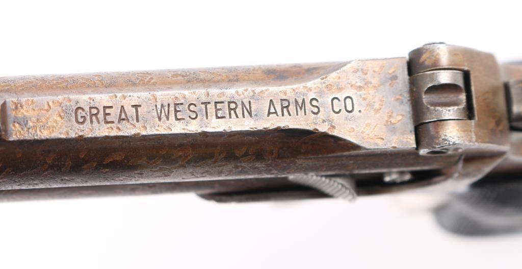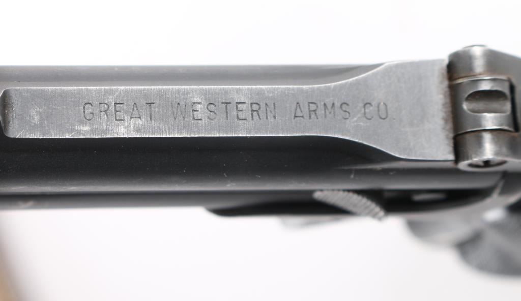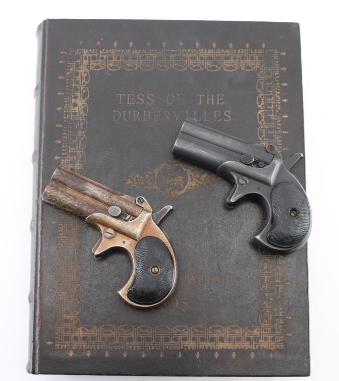 Derringers come in a large faux book "Tess of the Durbervilles", form fitted to hold three derringers. Based on the Remington Model 95 design. These guns are pretty rare, GWA started out making guns for the Western movie industry, lasting from 1954 to 1964. 1) SN: 1154 Tip-up, 3: ribbed barrels, manual ejection. Matte blue finish is about 95% with edge wear/rubs, bores are excellent checkered black plastic grips are good with a small crack in the left panel. Tight lock-up. NRA Condition-Very Good. C&R Firearm. 2) SN: 2022 Same as above but with scroll engraving & gold toned finish, Bores are very good, grips are very good, finish is about 70% with handling loss, there is pitting/finish loss around the muzzle, mostly on the left side. NRA Condition-Good. C&R firearm.
