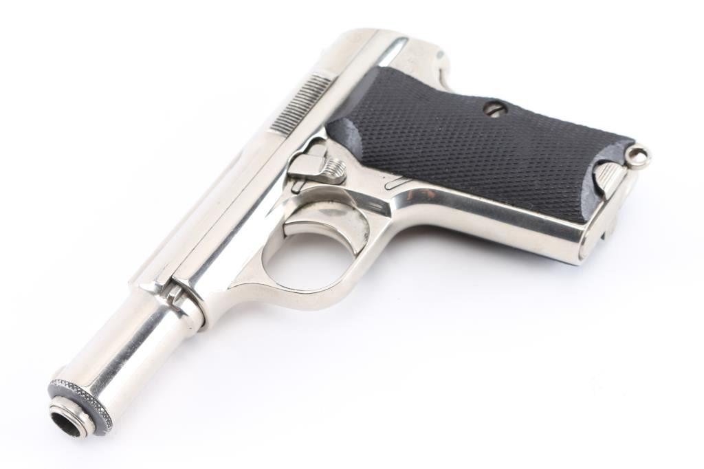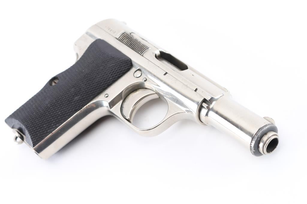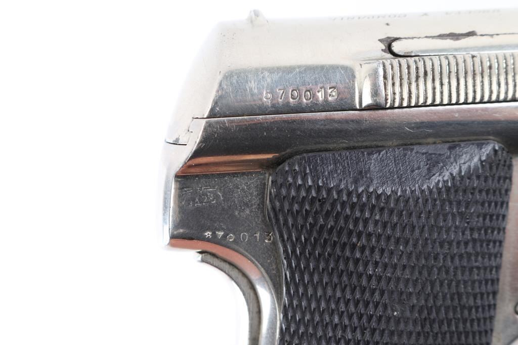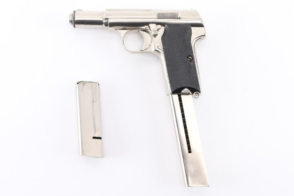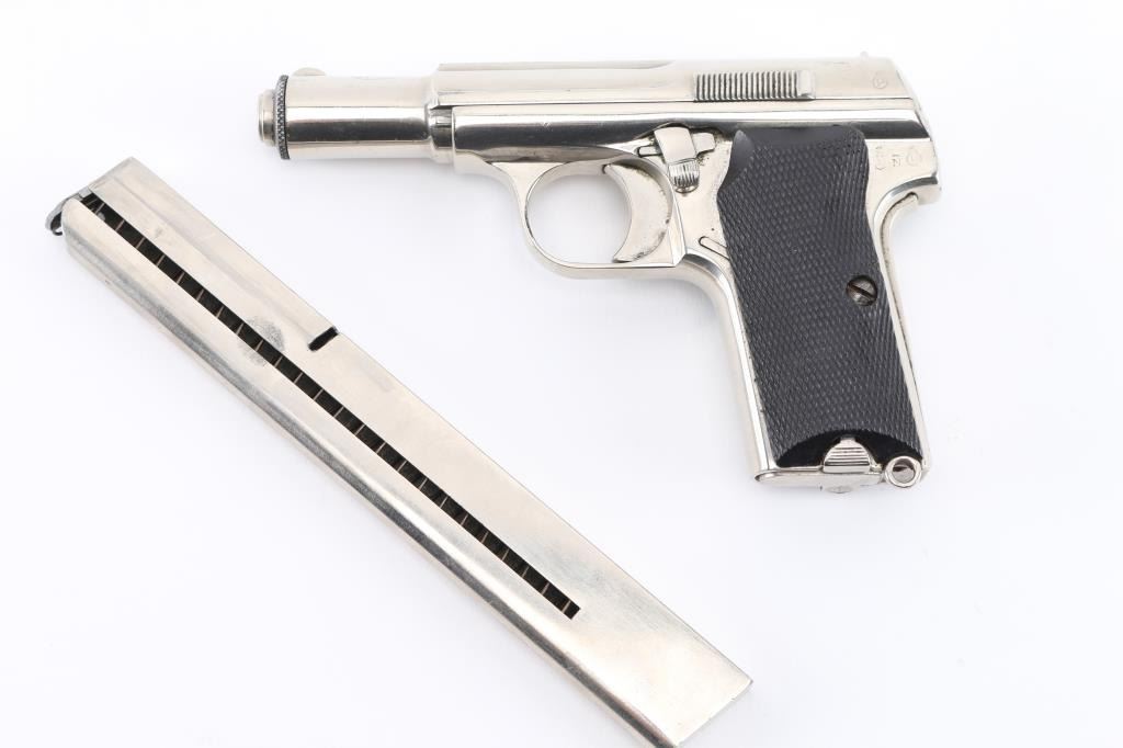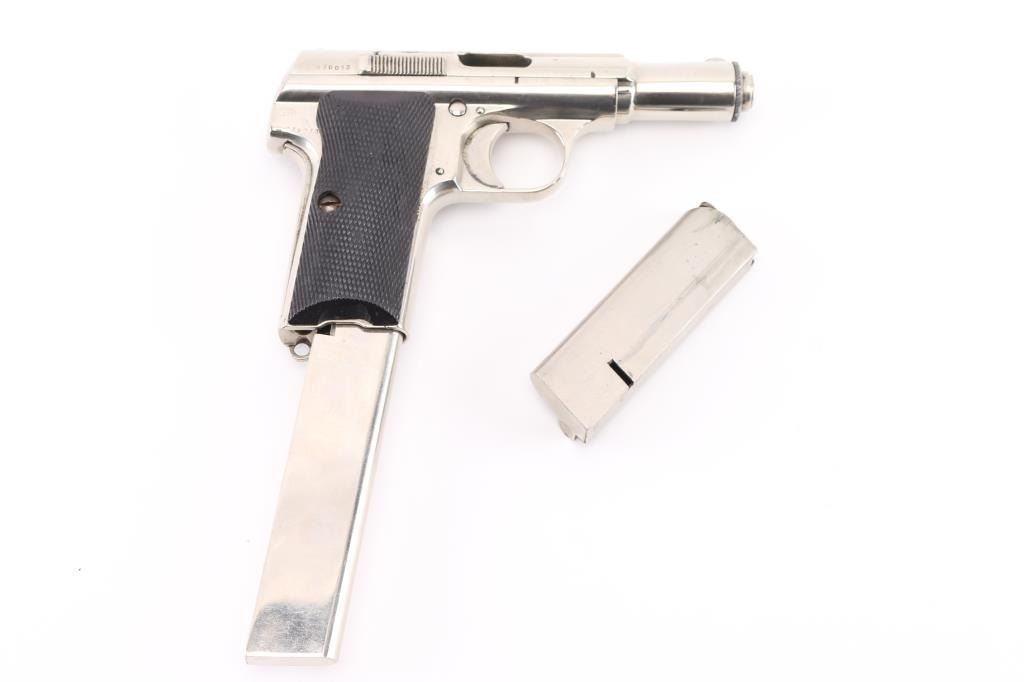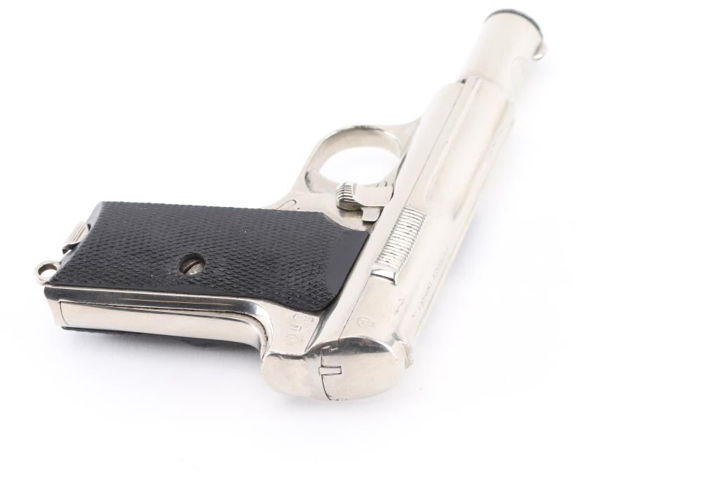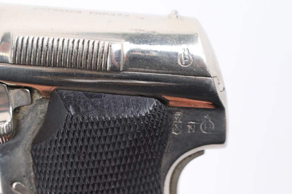 Pistol has a nickel refinish. Nazi marked Spanish made single action, blow-back, semi- automatic pistol. German WW2 WaW waffenamt on right rear frame (Feint) Produced 1922-1967, 3.9" barrel with fixed blade/notch sights. manual &^ grip safeties, lanyard ring, matching serial numbers on slide/frame, one Astra marked 7-rd magazine.& 24 rd extended magazine. Bore is very good,, checkered wood grips are very good, action is crisp/tight, nickel refinish is very good with minor scratches, markings are feint due to refinish. NRA Condition-Very Good as Refinished.. C&R Firearm.