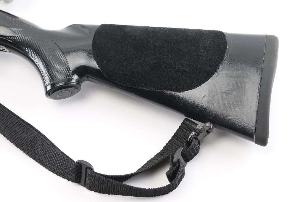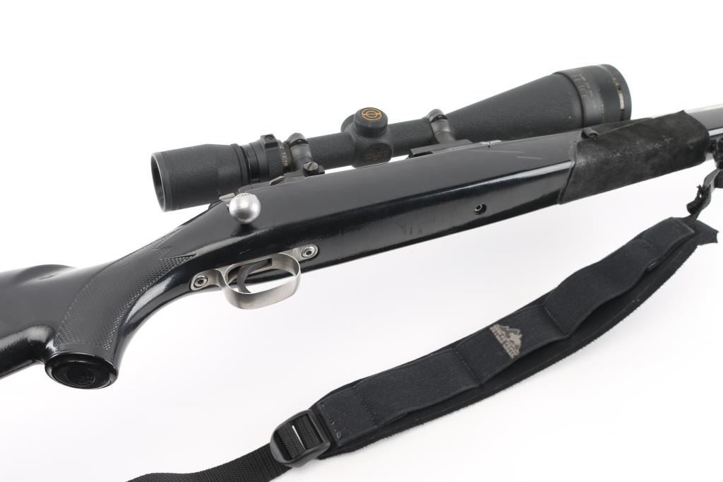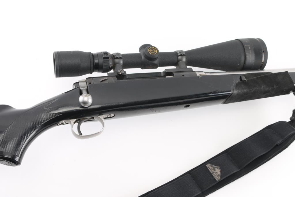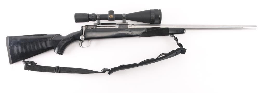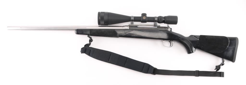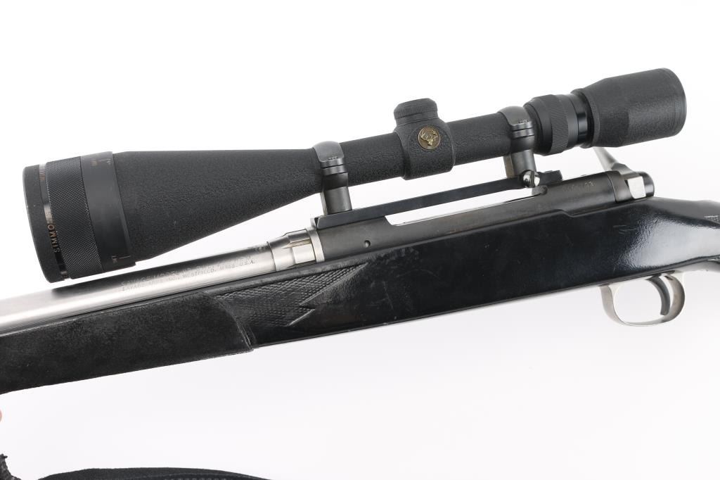 Bolt action rifle features stainless steel/blue finish, wood stock that has been painted black, 24" medium-heavy fluted stainless barrel, blind magazine, manual safety, black nylon sling, thin rubber butt pad. Mounts a Simmons Whitetail Classic 6.5-20X50 Riflescope' with fine cross hairs, Leupold base. Bore is very good condition. Retains 95% finish with minor scuffs, other handling marks. Paint on the stock has numerous scratches and has leather like material attached to thew fore grip and left butt stock. Scope is very good condition with bright clear view. NRA Condition-Good-Very Good. Modern Firearm