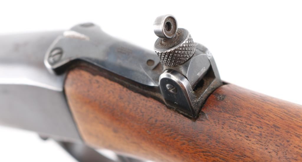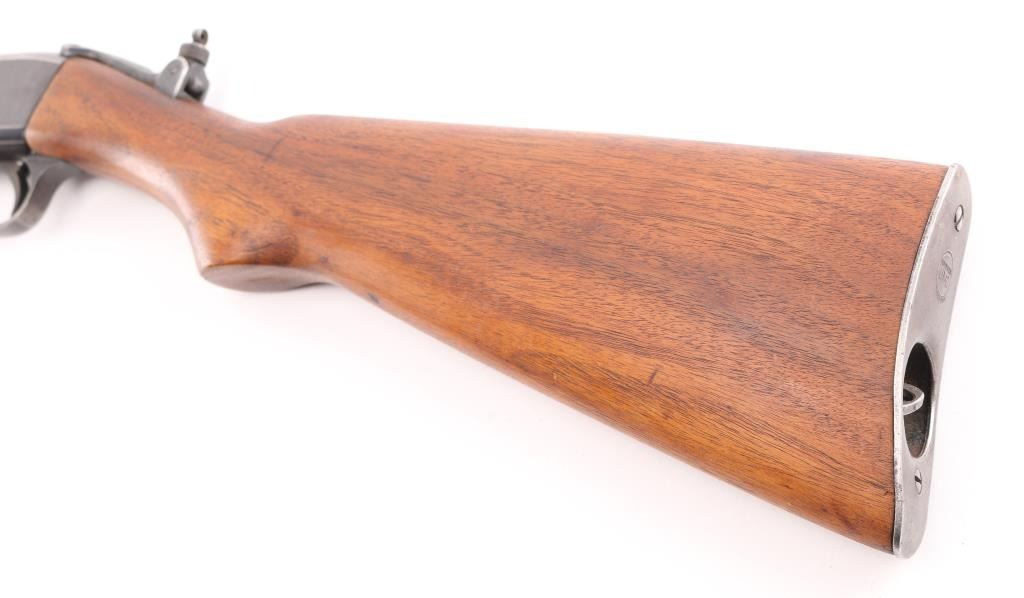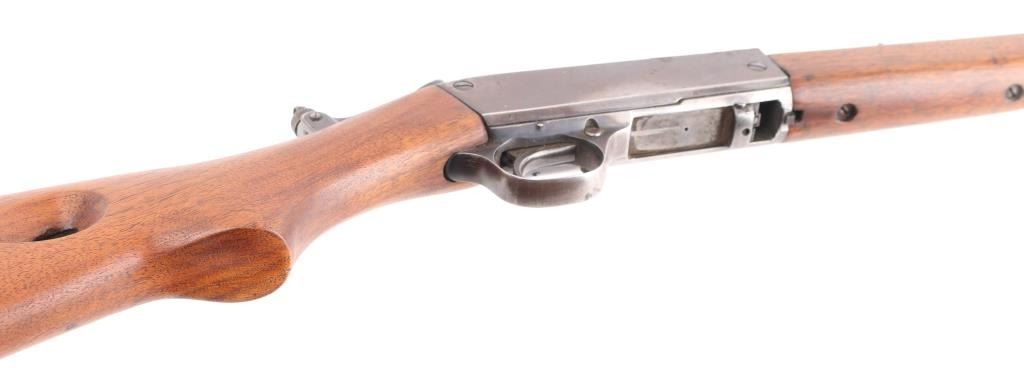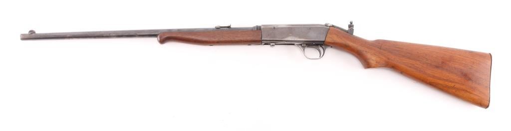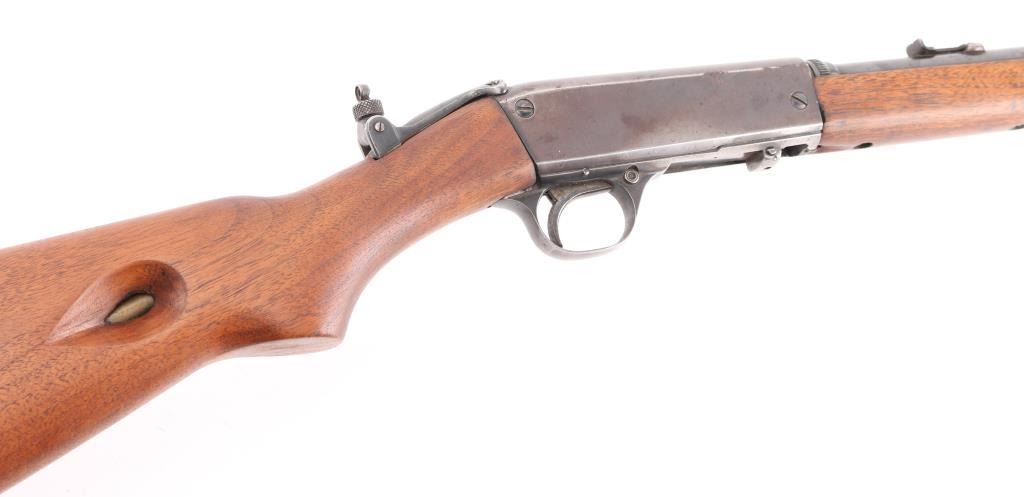 Vintage semiautomatic rimfire take-down rifle manufactured circa 1922-35. Features blued finish, smooth wood forend & schnabel tipped forearm, 19" barrel, dovetailed blade front sight, adjustable rear sight, Lyman peep sight attached to the tang, tube mag in butt, push button safety. Bore is very good condition. Retains 60% finish with patina and light rust in many places, handling loss Wood is very good with minor dents & scratches. NRA Condition-Good. C&R Firearm.