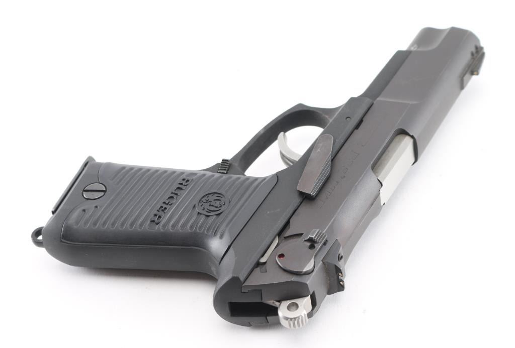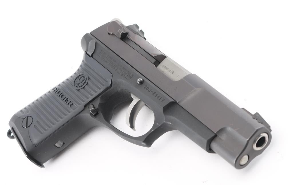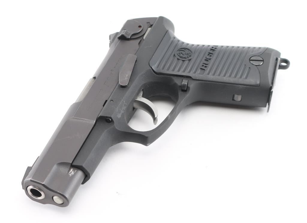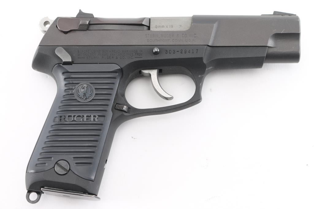 American made semi-auto pistol chambered for 9x19mm ammunition, circa 1991. It has a 4" barrel, matte black finish on a stainless slide, black alloy frame, black Ruger grip panels, three dot sights, ambidextrous safety, smooth trigger and serrated hammer spur. Comes with one magazine. Metal finish looks good with a couple of scuffs. Bore looks very good. Grip panels have a tiny scuff on the left by the logo. Condition is NRA Very Good.