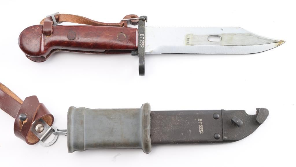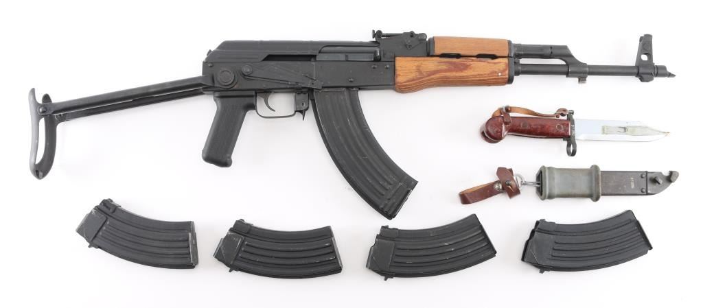 SN: DJ0348 Romanian semiautomatic rifle imported by CAI, Georgia VT. Manufactured at the Cugir factory in 1972. Based on AK-47/AKM design. Features matte blued finish, 16" barrel, slant muzzle break, no cleaning rod, bayonet lug, protected post front sight, tangent rear sight, scope rail on left side of receiver, accepts detachable magazines, manual safety, smooth wood handguards, metal folding stock & black polymer pistol grip, sling loops. Observed numbers match. Bore is excellent/bright, appears hard chrome lined. Retains 95% finish, showing scratches and scuffs. Wood is very good condition. Includes (1) 30 rd magazine, (4) 20-rd magazines & a Romanian AK-47 bayonet. Condition is NRA Very Good. C&R Firearm.