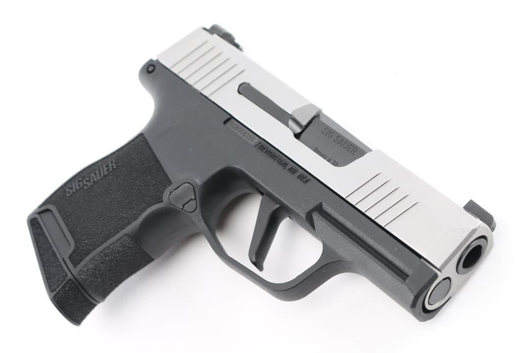 American made semi-automatic pistol, SA, Optic Ready Micro-Compact, no manual safety, rated for +P ammunition, Nitron finished slide, blued black barrel, black polymer frame, accessory rail: SIG Rail, approximately 3" barrel, bore is bright, slide has serrations at front and rear, blade front sight with green dot, open notch rear sight, no exposed hammer, smooth flat trigger, textured grip, metal Sig Sauer 10-round double stack magazine. Includes the original Sig Sauer plastic, case, instruction manual, extra metal Sig Sauer 10-round double stack magazine, extra curved trigger and padlock with two keys. **NRA Near Perfect** Modern Firearm