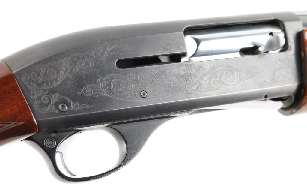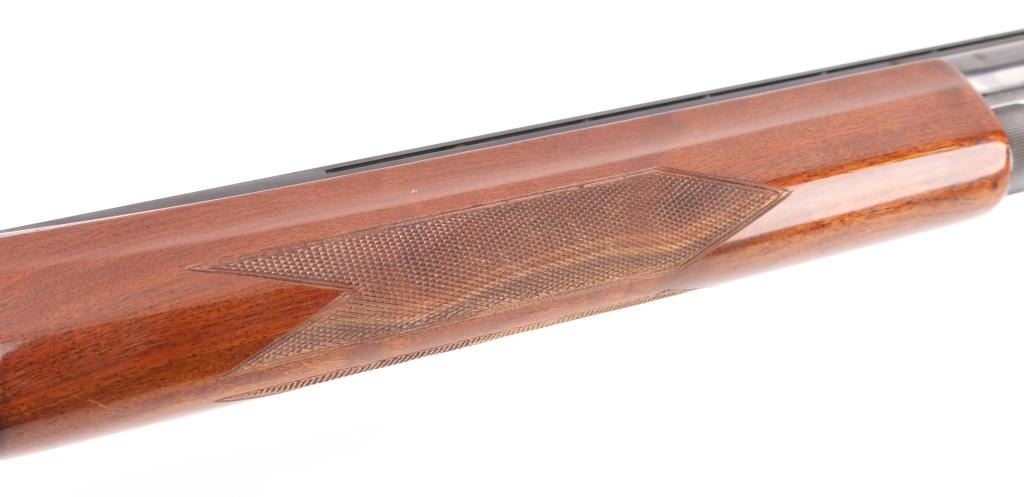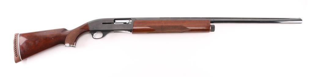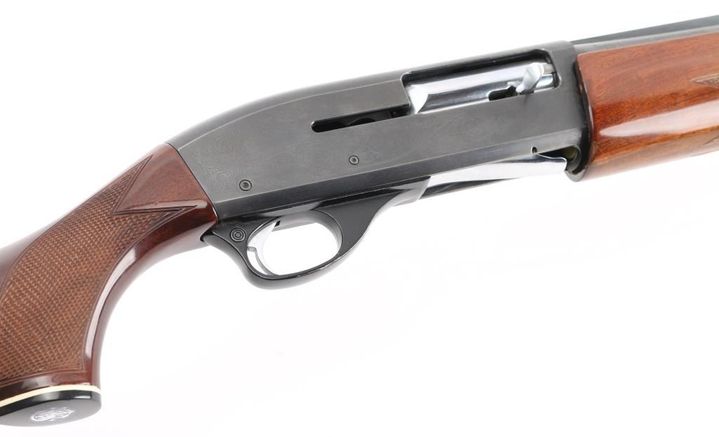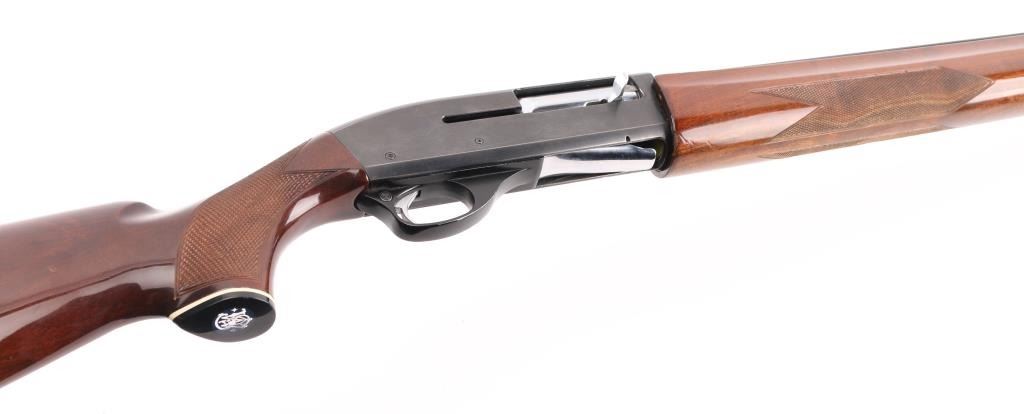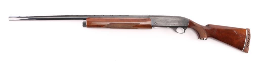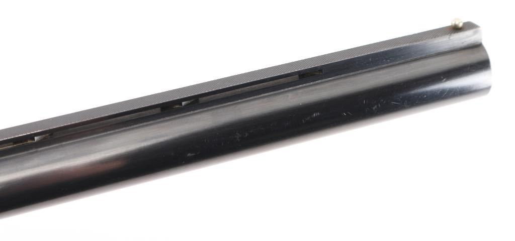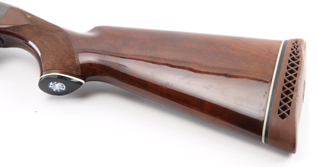 SN: FS75820. Gas operated semi-automatic shotgun chambered for 2 3/4" & 3" 12 gauge shells, manufactured in Japan by Howa circa 1972-1984. Features a blued full choke 30" vent rib barrel, silver bead sights, 1/2 length tube magazine, smooth trigger, push buttonsafety, polished bolt, serrated charging handle, engraved alloy receiver, checkered walnut forend and pistol grip shoulder stock with S&W grip cap and factory recoil pad. Shotgun exhibits edge wear. minor scratches, approximately 90% bluing retained. Action is smooth, the bore is pristine and the wood stocks are very good with sharp checkering, some scratches/scuffs. Condition is NRA Very Good..