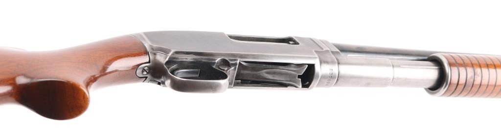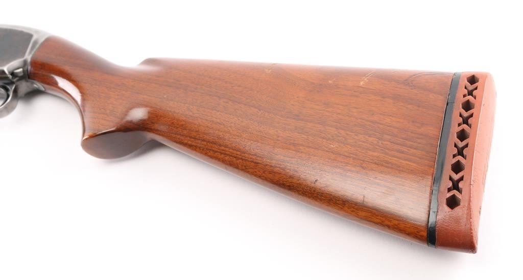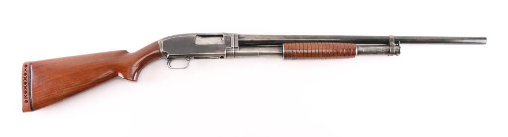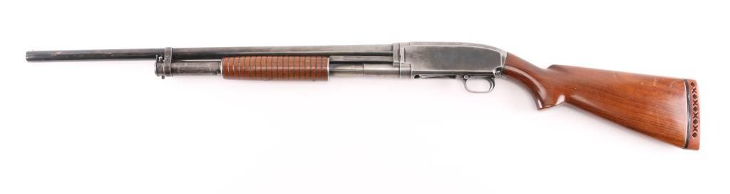 American made pump-action shotgun, 2 3/4" chamber, internal hammer, exterior tube magazine, barrel is marked Full, approximately 26" barrel, bore is dull but might improve with cleaning, brass bead front sight, grooved forearm stock, smooth pistol grip buttstock, ventilated red rubber recoil pad, approximately 70% of finish remains, LOP is approximately 14 1/2". Manufactured circa 1940. **NRA Very Good** Modern Firearm C&R Eligible