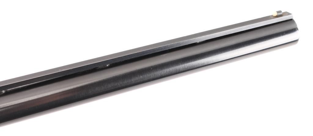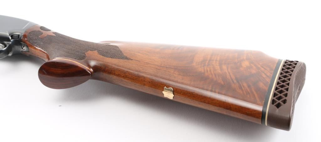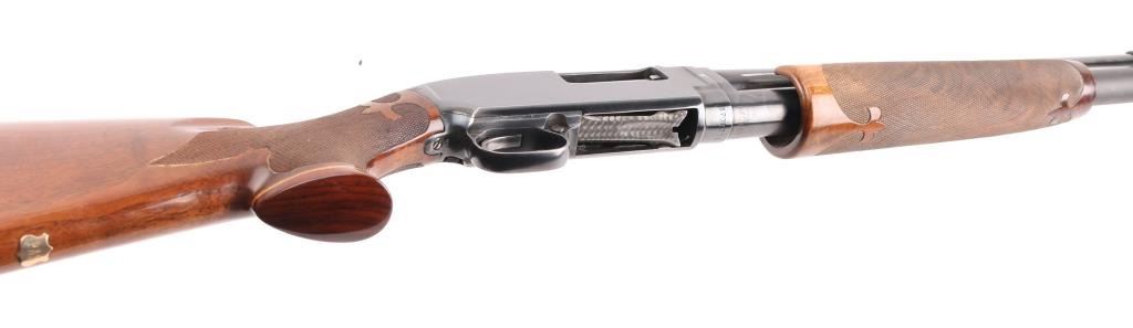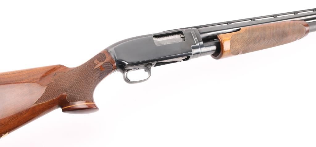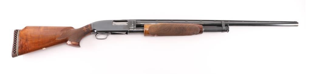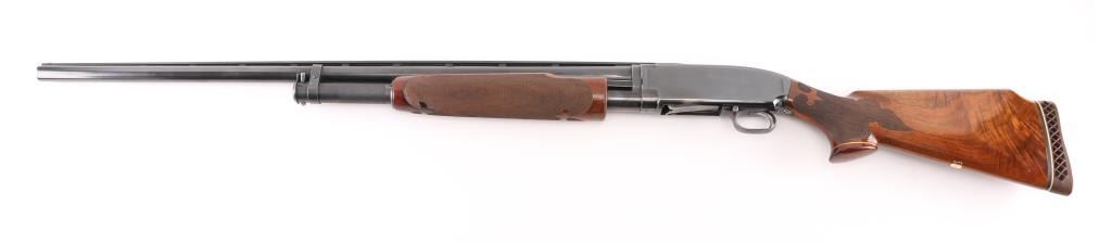 Take down pump action shotgun manufactured circa 1958. Shotgun has been professionally restored, reblued with upgraded wood. Features 30" Simmons vent rib barrel, barrel marked "FULL" choke, white front & mid beads, blued finish, highly figured walnut stock & pump handle, fine point checkering at pump handle & wrist of stock with Fleur Di Lis points, Pachmayr rubber recoil pad (14" LOP), contrasting wood grip cap, monogram shield on underside of butt engraved "PAS" push button safety. Machine turned 'jeweled' bolt & lifter. Bore is excellent/bright. Retains 90% reblue with handling marks & small scratches, rubbing wear where pump handle slides. Handling wear on receiver. Wood is excellent. Numbers match on receiver & extension. Markings are a little feint due to refinish. NRA Condition-Very Good as restored. C&R Firearm.