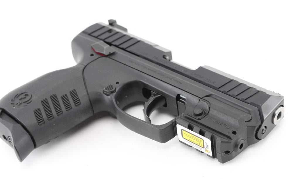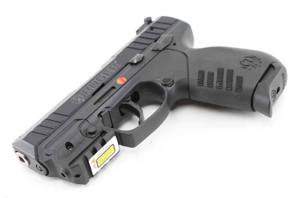 "Model 3615 " - American made compact semi-automatic pistol, SR22 LaserMax version, DA/SA, aluminum slide, black textured polymer frame, straight blowback-type action, approximately 3 1/2" stainless steel barrel that is fixed to the frame, bore is bright, has a visual inspection port in the form of a hole in the top of the slide and the back of the barrel that functions as a loaded chamber indicator, serrations on the front and rear of the slide, red LaserMax sight with built-in Picatinny rail, the dovetailed, high-visibility, three-dot sight system has a fixed front sight and a rear sight that is both windage- and elevation-adjustable, a reversible blade allows shooters to select two white dots or a solid black blade, serrated hammer spur, smooth trigger, ambidextrous safety/decocking lever and magazine release, two interchangeable handgrips are offered - one in slim, and the other in wide-palmswell format. Includes the original cardboard box with instruction manual, second grip, second magazine, black soft-sided carrying case and padlock with two keys. **NRA Near Perfect** Modern Firearm