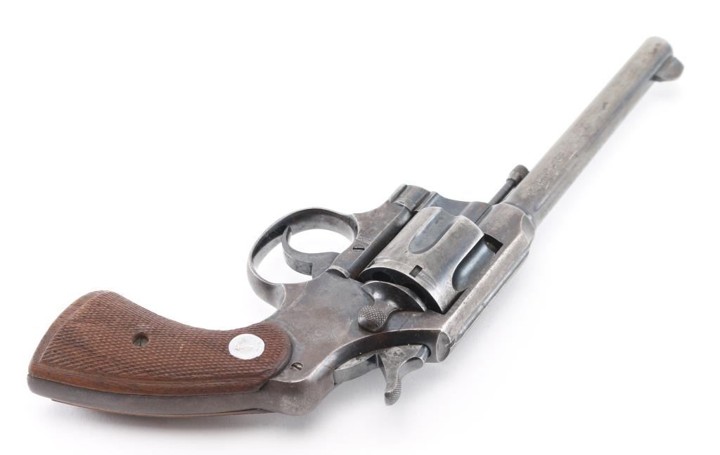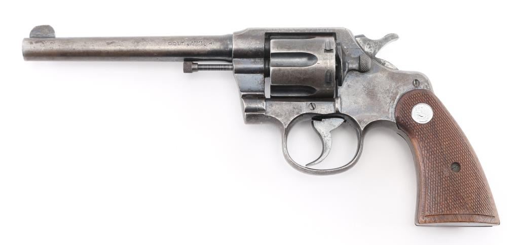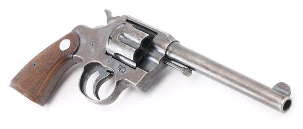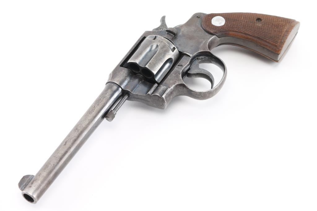 Manufactured 1919. Double/single action revolver features blued finish, checkered wood grips, with Rampant Colt medallions, 6" barrel, fixed sights, 6 shot cylinder. Bore is very good condition. Retains 20% blue, with fading or bare metal on sides of barrel & all sharp edges, light patina forming on frame, grip straps turning to a brown color, some scattered pin-prick pitting. Action is smooth with tight lock-up. Barrel markings are crisp; Rampant Colt marking on frame feint with an obscuring layer of very light patina. Grips are very good. Condition is NRA Good, C&R Firearm.