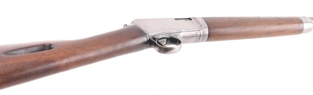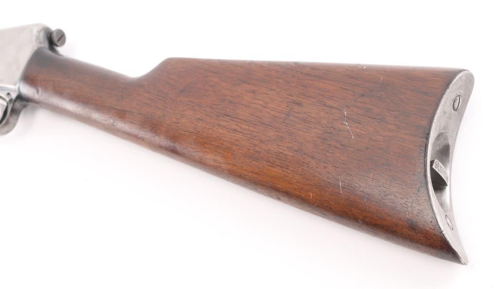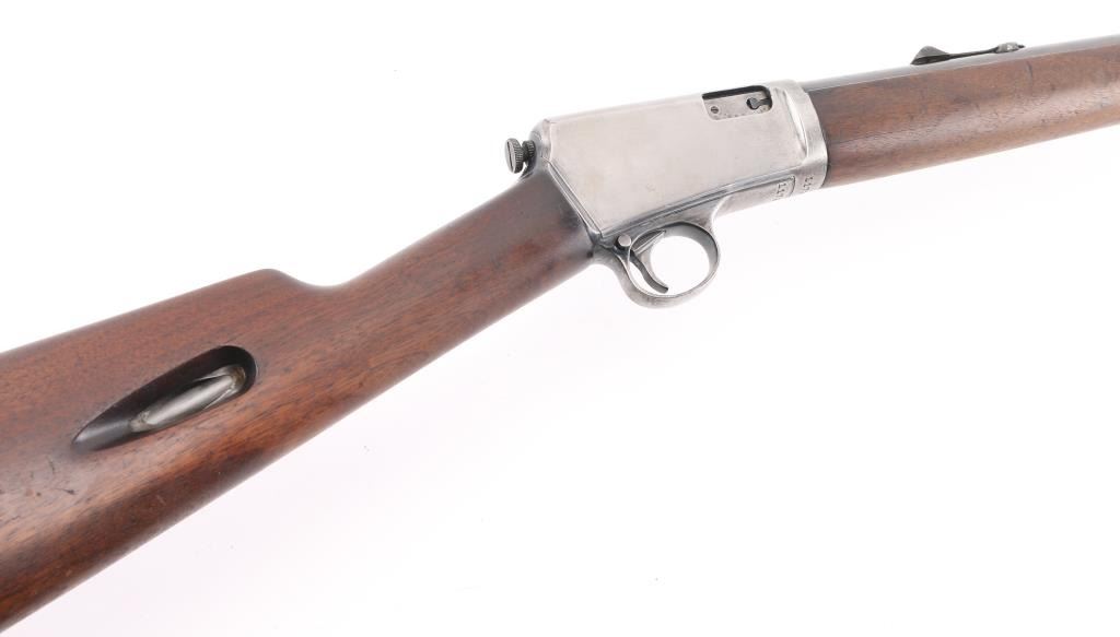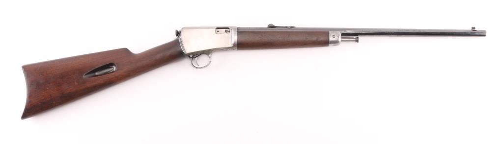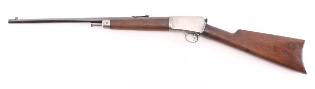 Vintage semiautomatic rimfire rifle manufactured circa 1928. Features blued finish, wood forend with steel nose cap, wood butt with straight grip, steel semi-crescent buttplate, 20" barrel, dovetailed blade front sight, sporting rear sight, magazine tube in butt, push button safety, takedown screw at receiver rear. Bore is very good condition. Charging rod in forearm. barrel blue retains 75% finish, with rubs, muzzle & 5 scratches behind the rear sight, receiver is in the white.. Markings are sharp, and numbers on receiver & trigger group match. Wood is very good condition overall with minor scratches/dings, bore is very good/bright. Condition is NRA Good C&R Firearm.
