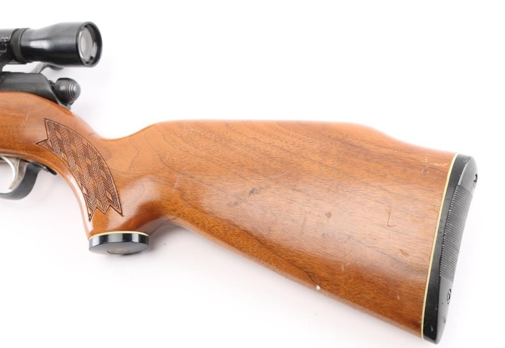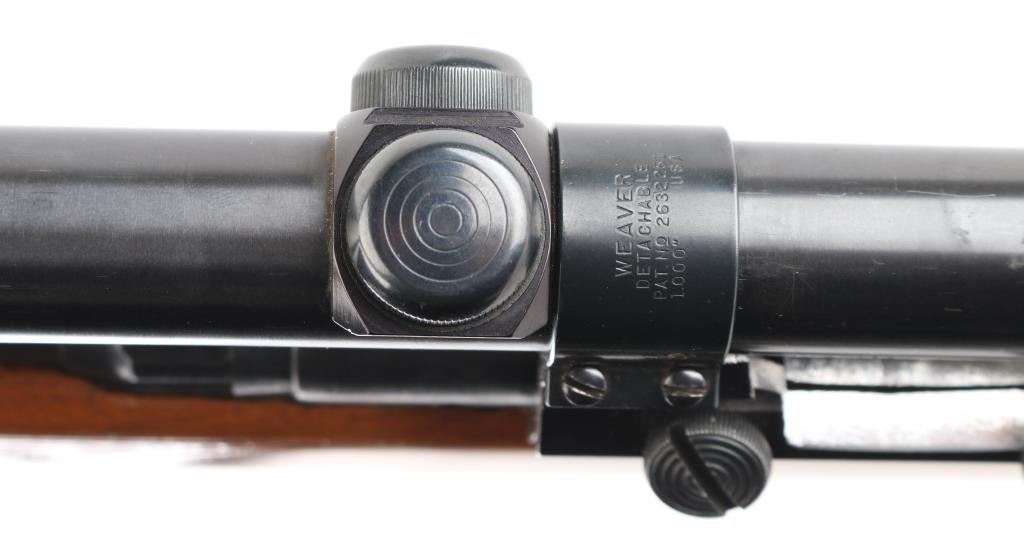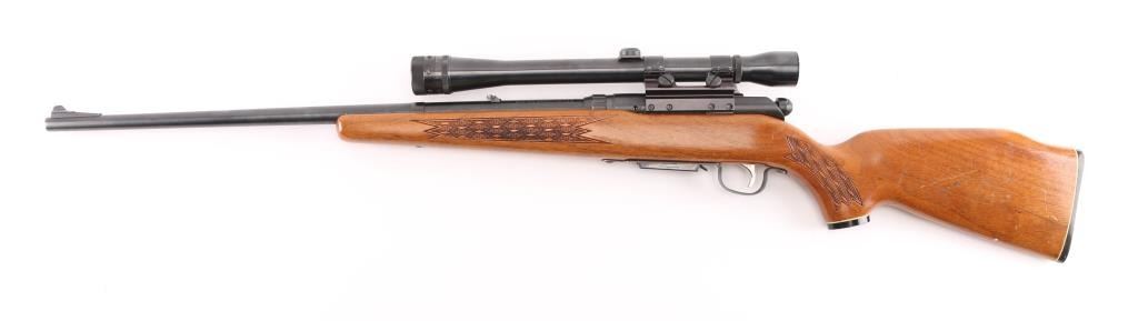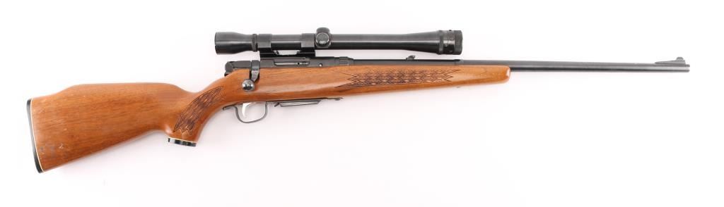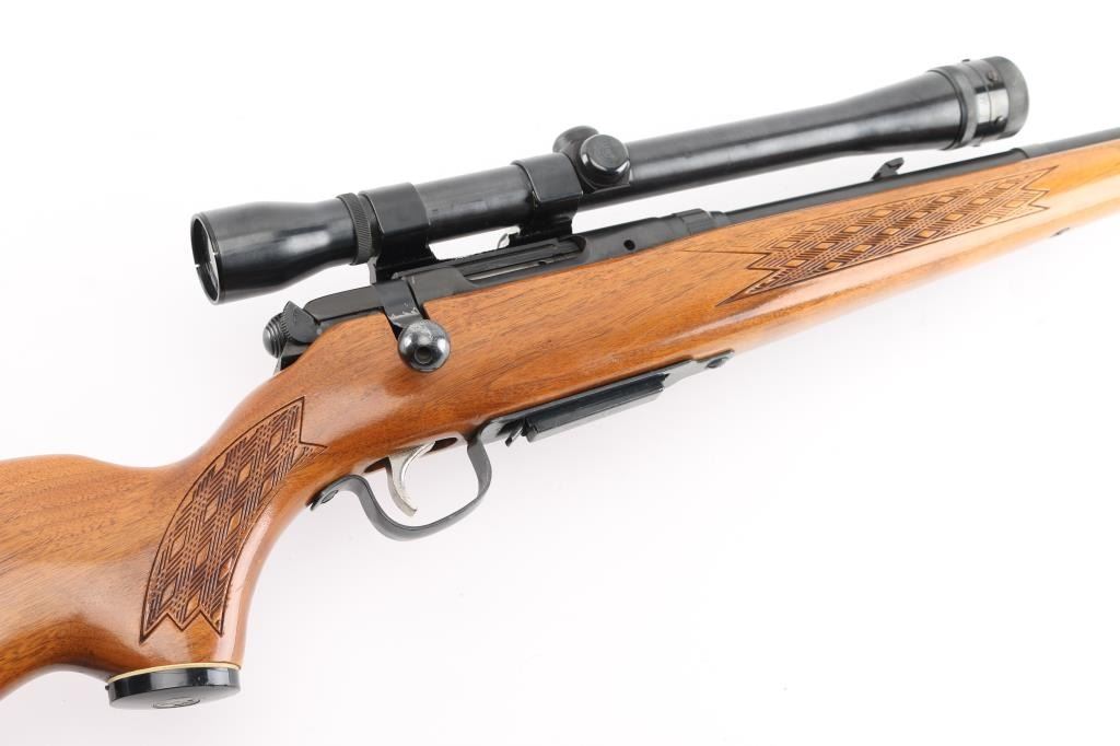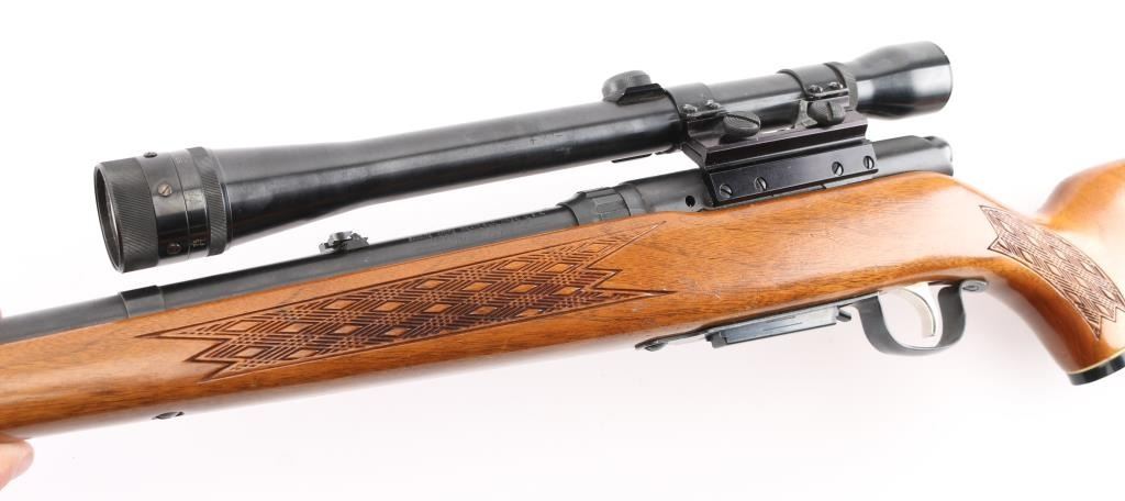 This is a bolt action rifle chambered in .223 Rem. Model 340 'Series E' , produced 1950-85. Detachable magazine, walnut stock has basket weave panel on wrist & forearm. plastic grip cap, plastic butt plate with white spacer. 24" barrel with ramped blade/bead front & flip notch rear sights, manual safety. Mounted with a scope (Make & data under the rings) clear optics, mounted on left receiver with Weaver rings. The bolt handle and scope base have been modified (Filed) for better fit. Bore is very good, a little dirty, action is smooth, stock is sound with some scratches/dings, blue is about 90% with minor scratches, edge wear, & loss to the bolt handle. NRA Condition-Good. C&R Firearm.