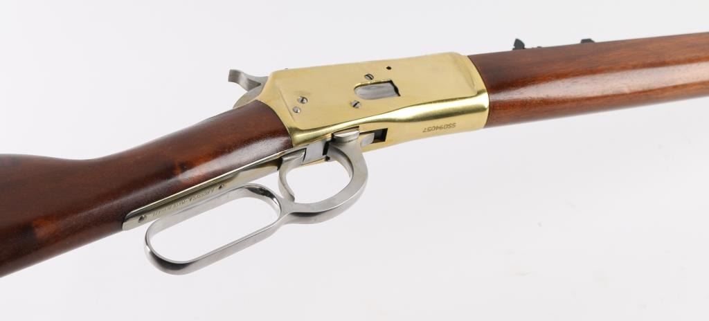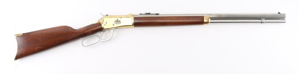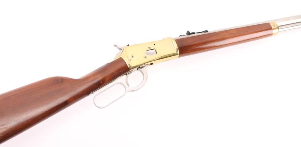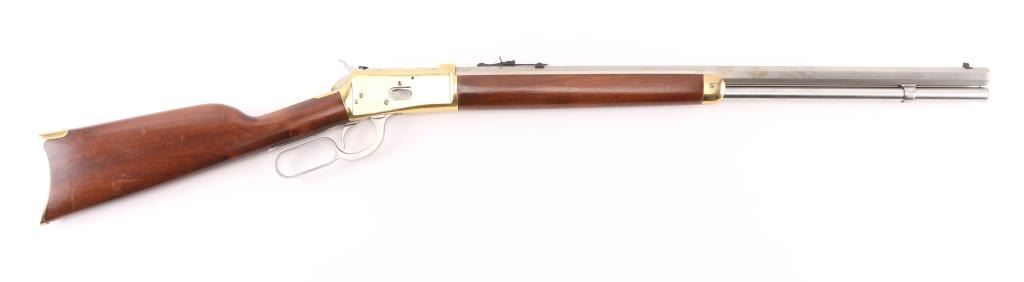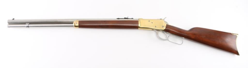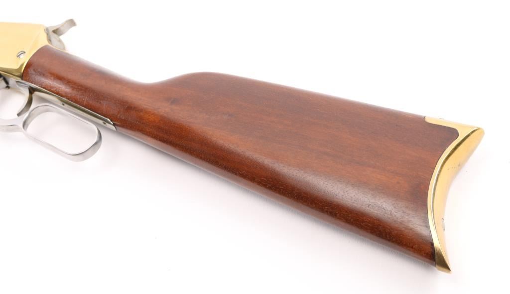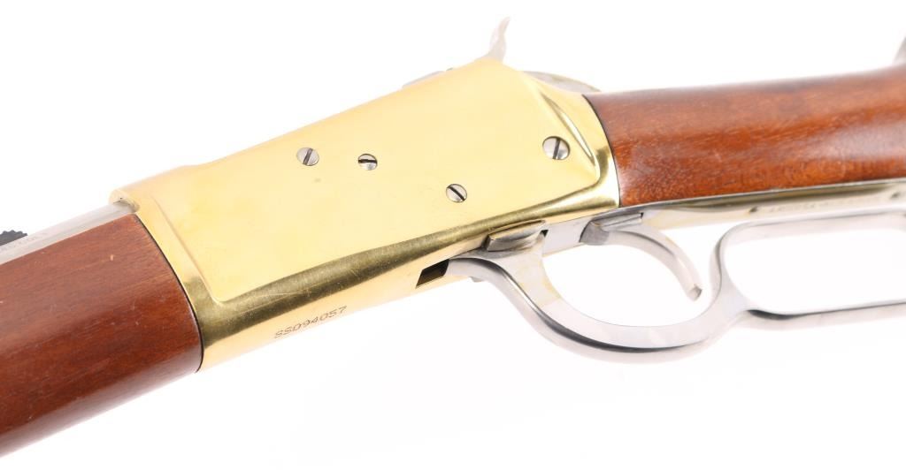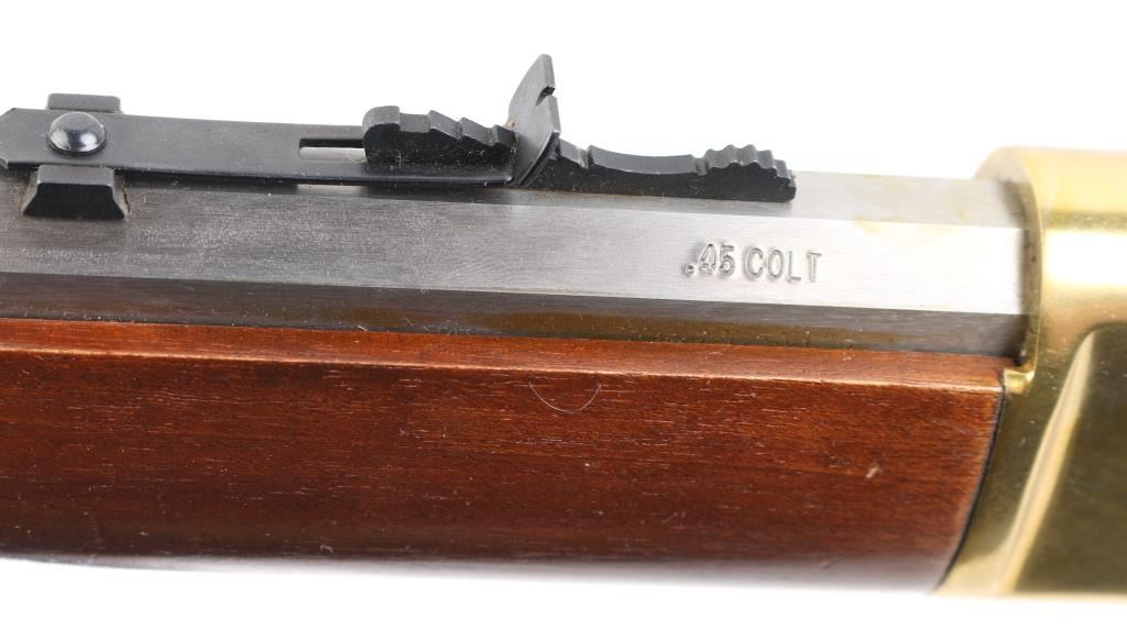 Made in Brazil, imported by L.S.I. Reno NV, lever action rifle chambered in .45 Colt, side loading, top ejecting, 12-round tube magazine, with brass forend tip, receiver and smooth butt plate, stainless steel barrel, magazine, bolt, hammer with a serrated spur, oval action lever and smooth trigger. Black blade front sight, black elevation-adjustable rear sight. Bore is bright, cosmetic blemishes on barrel, scratches on receiver, cosmetic blemishes on hammer, cosmetic blemish on metal below the wrist, small scratches on stocks and pitting on butt plate. NRA Very Good **Modern Firearm**