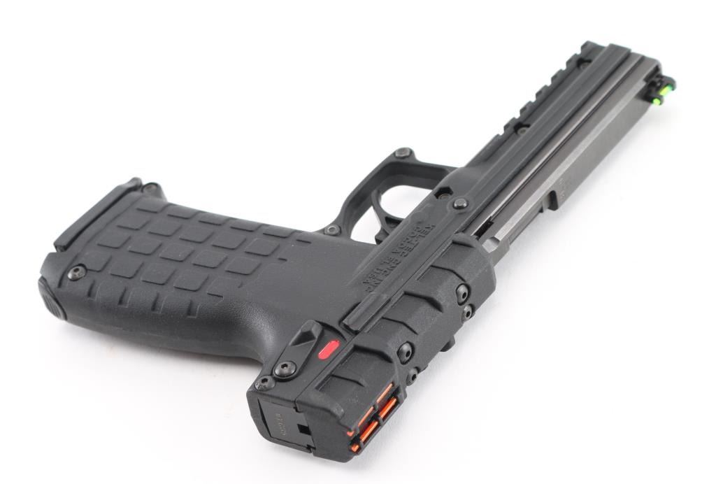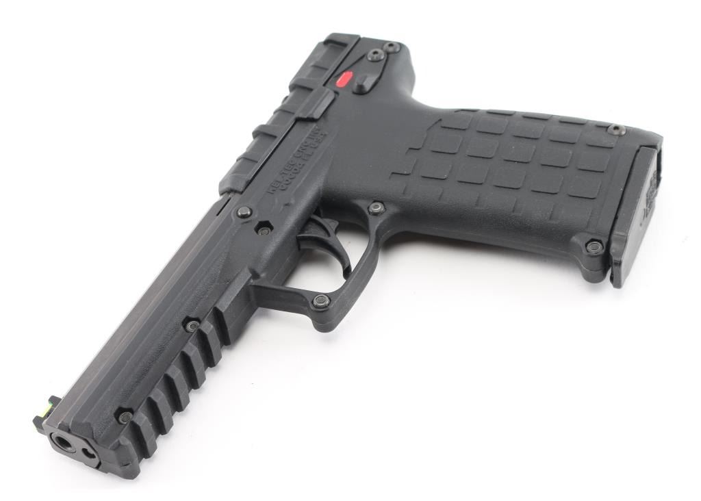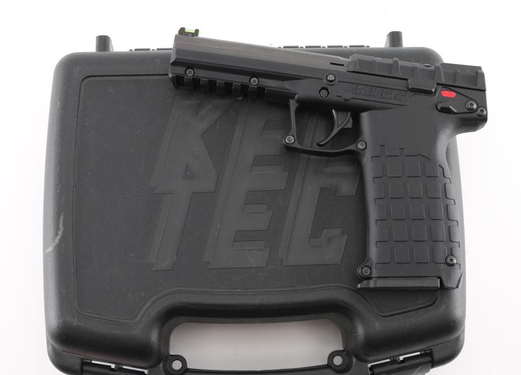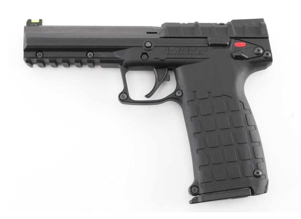 American made lightweight semi-automatic pistol, SA, hybrid blowback/locked-breech system lets you use a wide variety of ammunition and switches between them depending on the pressure of the cartridge, slide locks back after the last shot, approximately 4 1/4" barrel with blued finish,, bore is bright, high visibility fiber optic sights - single green in front sight and double orange in the rear, no exposed hammer, smooth trigger, black polymer frame with textured grips, accessory rail, ambidextrous manual safety, 30-round, double-stack magazine that fits completely in the grip. Includes a Kel-Tec case with instruction manual. **NRA Near Perfect** Modern Firearm
