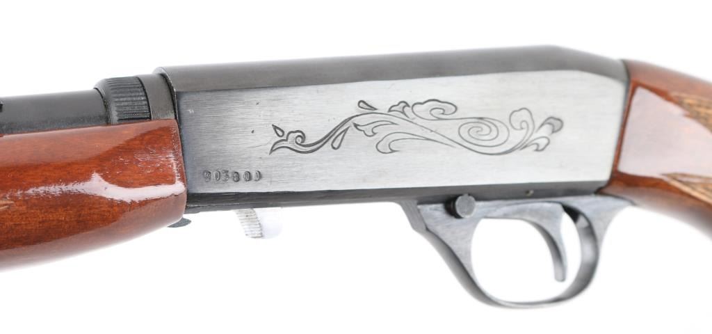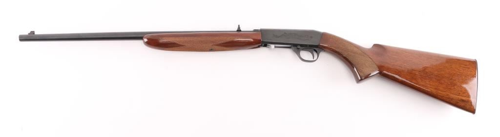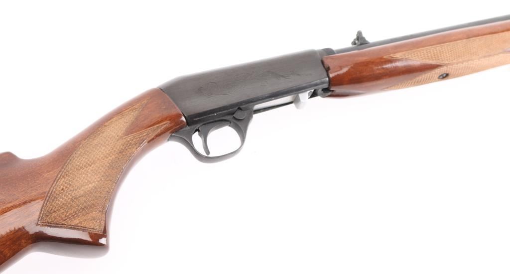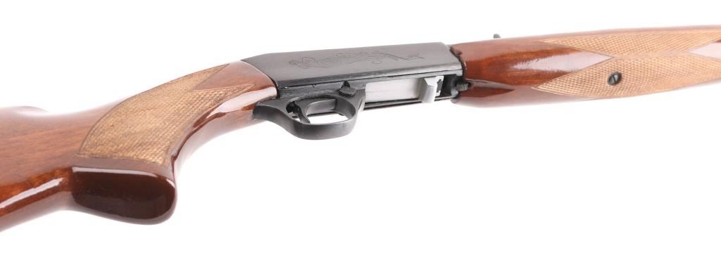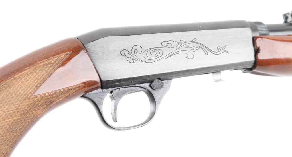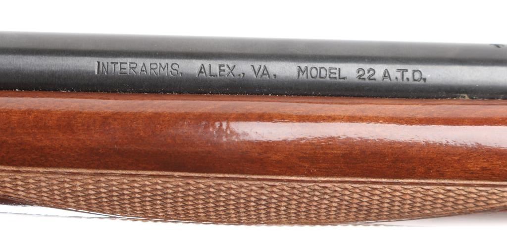 Semi-automatic. 11+1 capacity. Take-down rifle. Based on the Browning SA-22 design. Made in China by Norinco, and imported by Interarms, Va. Marked on left barrel. 19." blue-steel barrel drilled, and tapped for scope mounts. front blade/brass bead, adjustable u notch sights. Blued steel engraved receiver with bottom ejection. Stainless steel bolt. Blue-steel trigger, and triggerguard. Cross bolt safety. 11-rd tubular mag in stock. Right-side loading. Glossy wood stock, with checkered pistol grip, and forend, blue-steel butt plate. Action is smooth. bore appears excellent/bright. blued finish is about 98%, with minor scratches, mostly on the receiver. Wood is very good, with some minor scratches/dings. NRA Condition-Excellent. Modern Firearm.