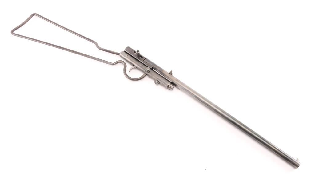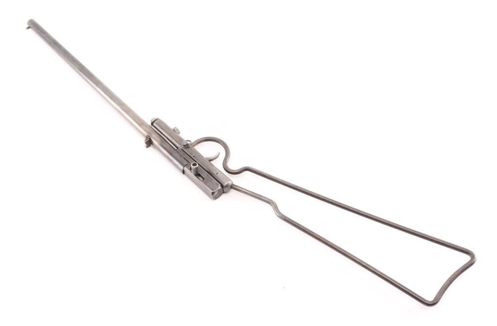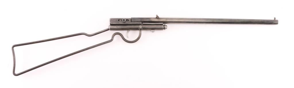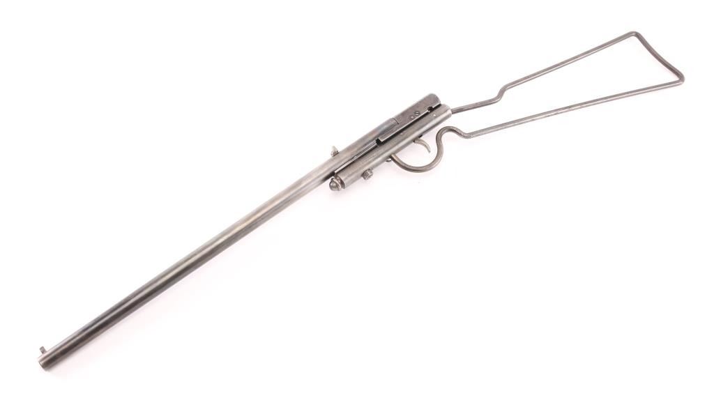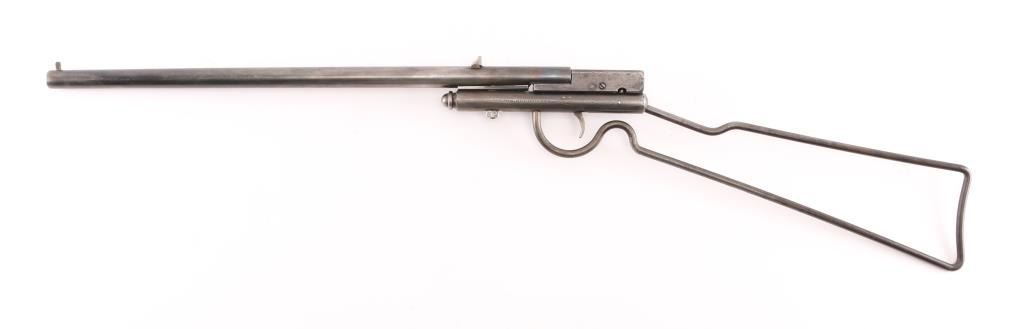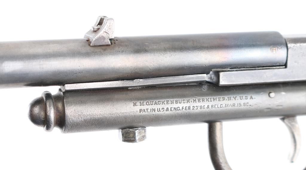 Manufactured 1893-1920. Single-Shot, take-down boys "Safety" rifle. 17 1/2" barrel blade and v-notch rear sights, Left frame marked "H.M. Quackenbush, Herkimer, N.Y. USA Pat. in U.S. & Eng. Feb. 23 86 & Belg. Mar. 15 86" Blue finish is about 40% with handling loss, breech block swings to right to load. Fixed wire stock. Bore is very good, needs cleaning. Screw replaced in frame, Scattered pin-prick pitting , mostly on the stock & frame. A great starter rifle. NRA Condition-Good. C&R Firearm.